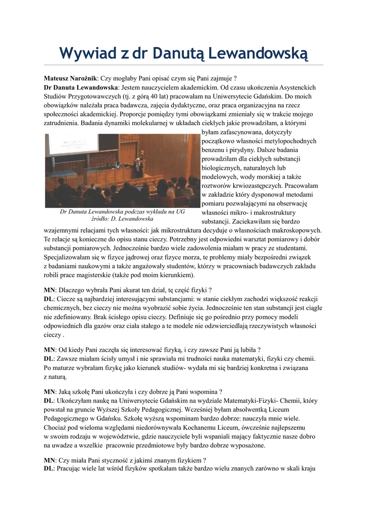 Wywiad z dr Danutą Lewandowską Mateusz Narożnik: Czy mogłaby Pani opisać czym się Pani zajmuje ? Dr Danuta Lewandowska: Jestem nauczycielem akademickim. Od czasu ukończenia Asystenckich Studiów Przygotowawczych (tj. z górą 40 lat) pracowałam na Uniwersytecie Gdańskim. Do moich obowiązków należała praca badawcza, zajęcia dydaktyczne, oraz praca organizacyjna na rzecz społeczności akademickiej. Proporcje pomiędzy tymi obowiązkami zmieniały się w trakcie mojego zatrudnienia. Badania dynamiki molekularnej w układach ciekłych jakie prowadziłam, a którymi byłam zafascynowana, dotyczyły początkowo własności metylopochodnych benzenu i pirydyny. Dalsze badania prowadziłam dla ciekłych substancji biologicznych, naturalnych lub modelowych, wody morskiej a także roztworów krwiozastępczych. Pracowałam w zakładzie który dysponował metodami pomiaru pozwalającymi na obserwację Dr Danuta Lewandowska podczas wykładu na UG własności mikro- i makrostruktury źródło: D. Lewandowska substancji. Zaciekawiłam się bardzo wzajemnymi relacjami tych własności: jak mikrostruktura decyduje o własnościach makroskopowych. Te relacje są konieczne do opisu stanu cieczy. Potrzebny jest odpowiedni warsztat pomiarowy i dobór substancji pomiarowych. Jednocześnie bardzo wiele zadowolenia miałam w pracy ze studentami. Specjalizowałam się w fizyce jądrowej oraz fizyce morza, te problemy miały bezpośredni związek z badaniami naukowymi a także angażowały studentów, którzy w pracowniach badawczych zakładu robili prace magisterskie (także pod moim kierunkiem). MN: Dlaczego wybrała Pani akurat ten dział, tę część fizyki ? DL: Ciecze są najbardziej interesującymi substancjami: w stanie ciekłym zachodzi większość reakcji chemicznych, bez cieczy nie można wyobrazić sobie życia. Jednocześnie ten stan substancji jest ciągle nie zdefiniowany. Brak ścisłego opisu cieczy. Definiuje się go pośrednio przy pomocy modeli odpowiednich dla gazów oraz ciała stałego a te modele nie odzwierciedlają rzeczywistych własności cieczy . MN: Od kiedy Pani zaczęła się interesować fizyką, i czy zawsze Pani ją lubiła ? DL: Zawsze miałam ścisły umysł i nie sprawiała mi trudności nauka matematyki, fizyki czy chemii. Po maturze wybrałam fizykę jako kierunek studiów- wydała mi się bardziej konkretna i związana z naturą. MN: Jaką szkołę Pani ukończyła i czy dobrze ją Pani wspomina ? DL: Ukończyłam naukę na Uniwersytecie Gdańskim na wydziale Matematyki-Fizyki- Chemii, który powstał na gruncie Wyższej Szkoły Pedagogicznej. Wcześniej byłam absolwentką Liceum Pedagogicznego w Gdańsku. Szkołę wyższą wspominam bardzo dobrze: nauczyła mnie wiele. Chociaż pod wieloma względami niedorównywała Kochanemu Liceum, ówcześnie najlepszemu w swoim rodzaju w województwie, gdzie nauczyciele byli wspaniali mający faktycznie nasze dobro na uwadze a wszelkie pracownie przedmiotowe były bardzo dobrze wyposażone. MN: Czy miała Pani styczność z jakimś znanym fizykiem ? DL: Pracując wiele lat wśród fizyków spotkałam także bardzo wielu znanych zarówno w skali kraju jak i świata. Chciałabym jednak wymienić dwóch których nie tylko spotkałam, ale którzy zaimponowali mi zarówno swoja wiedzą jak i człowieczeństwem. Są to: • Pan profesor Zdzisław Pająk- wielki fizyko-chemik , bardzo pracowity, solidny naukowiec, który dbał o swój zespół pracowników, wypromował bardzo wielu naukowców na Uniwersytecie Adama Mickiewicza w Poznaniu. • Pan profesor Antoni Śliwiński- światowej sławy fizyk- akustyk, pracujący na Uniwersytecie Gdańskim, wiodący w skali świata naukowiec, który jednocześnie dbał o wysoki poziom dydaktyki w naszym instytucje. MN: Na jakim poziomie wg Pani jest poziom nauki fizyki, astronomii i matematyki w Polsce w porównaniu do Europy i świata ? DL: Dotychczasowy poziom nauki polskiej w zakresie przedmiotów ścisłych jest dobry w skali świata. Wystarczy wspomnieć prof. Ryszarda Horodeckiego, fizyka odnoszącego sukcesy na polu kwantowej fizyki teoretycznej czy prof. Aleksandra Wolszczana – astronoma z Uniwersytetu w Toruniu. Nie można pominąć tez osiągnięć młodych: studenci polscy zdobywają nagrody w światowych konkursach informatycznych- co jest optymistyczną wiadomością bo jak mawiali starożytni ,,zły to nauczyciel którego nie przerosną uczniowie’’. Nasi dotychczasowi uczniowie nas przerastają. Niestety mniej optymistyczne jest spojrzenie na dalszą przyszłość, a to z powodu nieustających ,,oszczędności’’ czynionych ostatnio przez odpowiednie ministerstwa: -zmniejszanie sumarycznej liczby godzin nauczania przedmiotów ścisłych w programach nauczania -zmniejszenie dotacji dla uczelni na koszty studiów dziennych. Te posunięcia odbiją się na pewno niekorzystnie na poziomie wykształcenia absolwentów szkół. Dodatkowych czynnikiem jest brak w spisie oficjalnym zawodu fizyka oraz niezależnej dyscypliny naukowej o tej nazwie. MN: Co zrobić aby zainteresować dzisiejszą młodzież tak bardzo dziś niemodną wśród nich fizyką i matematyką ? DL: Nie zrobimy tego za dotknięciem różdżki. Wiedza ścisła jest trudna do ogarnięcia. Młodzież musi czuć potrzebę pracy oraz korzyści ze swych zainteresowań. Mam jednak nadzieję, że mimo wszystko znajdzie się grupa ludzi, która nie pozwoli zaprzepaścić dotychczasowych osiągnięć. MN: Który z działów fizyki czeka największy rozwój w XXI wieku ? A który wg Pani jest najtrudniejszy ? DL: Jest to bardzo trudne pytanie. Brak reguł które rządzą światem odkryć w nauce. Czasami bardzo niepozorne fakty prowadzą do rewolucyjnych zmian w odkrywaniu Wszechświata. Ja wiążę nadzieję na poznanie świata po stworzeniu teorii ciekłych układów. Jest to problem bardzo trudny. Brak zresztą na razie odpowiedniego aparatu matematycznego do tego opisu. MN: Co Panią interesuje oprócz fizyki