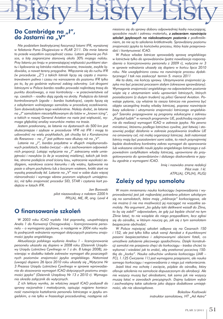Listy Listy Listy Listy Listy Listy Do Cambridge na „I”, do Jastarni na „V” Nie podzielam bezkrytycznej fascynacji lotami IFR, wyrażonej w felietonie Pana Długiewicza w PLAR 2/11. Dla mnie latanie to przede wszystkim oszczędność czasu. Latam głównie po Polsce, a loty zagraniczne stanowią około 30% mojego nalotu. Przy lataniu po kraju w przeważającej większości punktami startu i lądowania są lotniska niekontrolowane, trawiaste, zwykłe lądowiska, a nawet tereny przygodne. Włączanie się do ruchu IFR (w procedurze „Z”) z takich lotnisk łączy się często z marnotrawstwem paliwa i czasu na wznoszenie do poziomu IFR tylko po to, by po godzinie wykonać zabieg odwrotny. Lot drogami lotniczymi w Polsce bardzo rzadko prowadzi najkrótszą trasą do punktu docelowego, a nasi kontrolerzy – w przeciwieństwie od np. czeskich – rzadko dają zgodę na skróty. Podejścia do lotnisk kontrolowanych (zgoda – bardzo kształcące), często łączą się z odsyłaniem wolniejszego samolotu w procedurę oczekiwania. Sam doświadczyłem tego wielokrotnie. Należy dodać, że latanie na „I” samolotem niecertyfikowanym do lotów w „known icing”, a takich w naszej General Aviation na razie jest większość, wymaga głębokiej analizy warunków meteo na trasie. Jestem przekonany, że latanie na dystansach do 500 km jest skuteczniejsze i szybsze w procedurze VFR niż IFR i mogę to udowodnić na wielu przykładach, jak choćby lot z Konstancina do Rzeszowa – na „I” jest półtora raza dłuższy niż na „V”. Latanie na „I”, bardzo przydatne w długich międzynarodowych przelotach, trzeba ćwiczyć – ale z zachowaniem odpowiednich proporcji. Latając wyłącznie na „I” zatracamy wiele umiejętności i nawyków (o ile je wcześniej mieliśmy), takich jak krótkie, strome podejścia znad ściany lasu, wytracanie wysokości ześlizgiem, wzrokowa ocena kierunku i siły wiatru, lądowanie na pasie o silnym pochyleniu lub z bocznym wiatrem, krótki start na wysoką przeszkodę itd. Latanie na „V” nosi w sobie dużo więcej różnorodności i wymaga wbrew pozorom większych umiejętności, niż tylko znajomość procedur SID, STAR i czytania kart podejścia w lotach IFR. Jan Borowski pilot niezawodowy z nalotem 2200 h PPL(A), ME, IR, ang. Level 4 O finansowanie szkoleń W 2003 roku ICAO wydało 164 poprawkę, uzupełniającą Aneks 1 do Konwencji Chicagowskiej – licencjonowanie personelu – o wymagania językowe, a następnie w 2004 roku wydało podręcznik wdrożenia wymagań dotyczących poziomu znajomości języka angielskiego. Aktualizacja polskiego wydania Aneksu 1 – licencjonowanie personelu ukazała się dopiero w 2008 roku (Dziennik Urzędowy Urzędu Lotnictwa Cywilnego nr 1 z dn. 8 lutego 2008), zawierając w dodatku tabele zakresów wymagań dla poszczególnych poziomów znajomości języka angielskiego. Natomiast (uwaga) dopiero 26 lipca 2010 roku ukazały się „Wytyczne Nr 3 Prezesa Urzędu Lotnictwa Cywilnego w sprawie wprowadzenia do stosowania wymagań ICAO dotyczących poziomu znajomości języka” (Dziennik Urzędowy Nr 13 z 2010 r). Wymagania określa załącznik do wytycznych. Z ich lektury wynika, że właściwy zespół ICAO podszedł do sprawy racjonalnie i metodycznie, opisując najpierw konieczność rozwinięcia kształcenia personelu lotniczego w języku angielskim, a nie tylko w frazeologii proceduralnej, następnie od- niesiono się do sprawy doboru odpowiedniej kadry nauczającej, sposobów nauki i zakresu materiału, z zaleceniem rozwinięcia szkoleń językowych na niskokosztowym poziomie z podkreśleniem, że nie są to szkolenia krótkotrwałe. Sprawdziany poziomu znajomości języka to końcówka procesu, który każe przeprowadzić i kontynuować ICAO. W Polsce władze lotnicze sprowadziły sprawę angielskiego w lotnictwie tylko do sprawdzianów (patrz nowelizacja rozporządzenia o licencjonowaniu personelu z 2009 r), wytyczne nr 3 w sprawie wdrażania ukazały się dopiero w końcu lipca 2010 roku. Nie uwzględniono czasu na rozwinięcie procesu dydaktycznego! I tak nas zaskoczył termin 5. marca 2011 Ale ta data, nie kończy sprawy. Utrzymywanie znajomości języka ma być przecież procesem stałym (okresowe sprawdziany). Wymaganie znajomości angielskiego na odpowiednim poziomie wiąże się z utrzymaniem wielu uprawnień lotniczych, których posiadaczami (z dużym trudem) są piloci General Aviation. Powstaje pytanie, czy właśnie ta rzesza lotnicza nie powinna być objęta szczególną troską władzy lotniczej, poprzez rozwinięcie bazy szkolenia i utrzymania znajomości lotniczego angielskiego? Szeroko propagowane są programy edukacyjne z zakresu „Kapitał ludzki” w ramach programów UE, podchodzą racjonalnie do realizacji wymagań ICAO w zakresie języka. Na pewno ministrowi, któremu podlega lotnictwo cywilne, jest łatwiej i stosowniej podjąć działania w zakresie pozyskiwania środków UE na omawiany cel, niż małej organizacji lotniczej. Jeśli natomiast lotnicy mają być pozostawieni sami sobie, to niech przynajmniej będzie dookreślony konkretny zakres wymagań do opanowania lub wskazane ośrodki nauki języka angielskiego lotniczego z odpowiednim certyfikatem władzy lotniczej, uprawnione do przygotowywania do sprawdzianów i dalszego doskonalenia w języku zgodnie z wymogami ICAO. Imię i nazwisko znane redakcji Pilot instr. I kl. ATPL(A), CPL(H), PL(G) Zależy od typu samolotu W moim mniemaniu nauka korkociągu (wprowadzania i wyprowadzania) jest jak najbardziej potrzebna pilotom szkolącym się na samolotach, które mają „inklinacje” korkociągowe, ale nie można (i nie ma możliwości) jej rozciągać na wszystkie samoloty. Na argument „bo gdyby taki delikwent wsiadł do Zlina, to by się zabił!” odpowiadam, że gdy już będzie chciał na tym Zlinie latać, to nie wsiądzie do niego przypadkiem, lecz zgłosi się do ośrodka, w którym nauczą go, jak się z tym sam