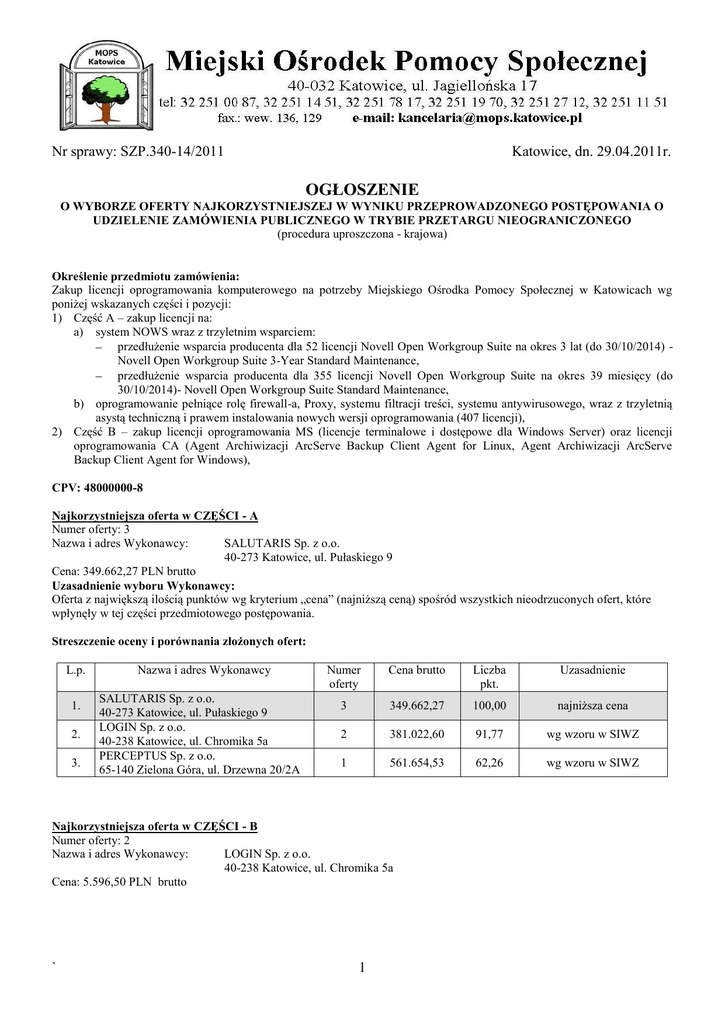 Nr sprawy: SZP.340-14/2011 Katowice, dn. 29.04.2011r. OGŁOSZENIE O WYBORZE OFERTY NAJKORZYSTNIEJSZEJ W WYNIKU PRZEPROWADZONEGO POSTĘPOWANIA O UDZIELENIE ZAMÓWIENIA PUBLICZNEGO W TRYBIE PRZETARGU NIEOGRANICZONEGO (procedura uproszczona - krajowa) Określenie przedmiotu zamówienia: Zakup licencji oprogramowania komputerowego na potrzeby Miejskiego Ośrodka Pomocy Społecznej w Katowicach wg poniżej wskazanych części i pozycji: 1) Część A – zakup licencji na: a) system NOWS wraz z trzyletnim wsparciem: przedłużenie wsparcia producenta dla 52 licencji Novell Open Workgroup Suite na okres 3 lat (do 30/10/2014) Novell Open Workgroup Suite 3-Year Standard Maintenance, przedłużenie wsparcia producenta dla 355 licencji Novell Open Workgroup Suite na okres 39 miesięcy (do 30/10/2014)- Novell Open Workgroup Suite Standard Maintenance, b) oprogramowanie pełniące rolę firewall-a, Proxy, systemu filtracji treści, systemu antywirusowego, wraz z trzyletnią asystą techniczną i prawem instalowania nowych wersji oprogramowania (407 licencji), 2) Część B – zakup licencji oprogramowania MS (licencje terminalowe i dostępowe dla Windows Server) oraz licencji oprogramowania CA (Agent Archiwizacji ArcServe Backup Client Agent for Linux, Agent Archiwizacji ArcServe Backup Client Agent for Windows), CPV: 48000000-8 Najkorzystniejsza oferta w CZĘŚCI - A Numer oferty: 3 Nazwa i adres Wykonawcy: SALUTARIS Sp. z o.o. 40-273 Katowice, ul. Pułaskiego 9 Cena: 349.662,27 PLN brutto Uzasadnienie wyboru Wykonawcy: Oferta z największą ilością punktów wg kryterium „cena” (najniższą ceną) spośród wszystkich nieodrzuconych ofert, które wpłynęły w tej części przedmiotowego postępowania. Streszczenie oceny i porównania złożonych ofert: L.p. 1. 2. 3. Nazwa i adres Wykonawcy SALUTARIS Sp. z o.o. 40-273 Katowice, ul. Pułaskiego 9 LOGIN Sp. z o.o. 40-238 Katowice, ul. Chromika 5a PERCEPTUS Sp. z o.o. 65-140 Zielona Góra, ul. Drzewna 20/2A Numer oferty Cena brutto Liczba pkt. Uzasadnienie 3 349.662,27 100,00 najniższa cena 2 381.022,60 91,77 wg wzoru w SIWZ 1 561.654,53 62,26 wg wzoru w SIWZ Najkorzystniejsza oferta w CZĘŚCI - B Numer oferty: 2 Nazwa i adres Wykonawcy: LOGIN Sp. z o.o. 40-238 Katowice, ul. Chromika 5a Cena: 5.596,50 PLN brutto ` 1 Uzasadnienie wyboru Wykonawcy: Oferta z największą ilością punktów wg kryterium „cena” (najniższą ceną) spośród wszystkich nieodrzuconych ofert, które wpłynęły w tej części przedmiotowego postępowania. Streszczenie oceny i porównania złożonych ofert: L.p. 1. 2. 3. 4. Nazwa i adres Wykonawcy LOGIN Sp. z o.o. 40-238 Katowice, ul. Chromika 5a BUKOWSKI Piotr 41-200 Sosnowiec, ul. Sucha 35 PERCEPTUS Sp. z o.o. 65-140 Zielona Góra, ul. Drzewna 20/2A SALUTARIS Sp. z o.o. 40-273 Katowice, ul. Pułaskiego 9 Numer oferty Cena brutto Liczba pkt. Uzasadnienie 2 5.596,50 100,00 najniższa cena 4 6.986,38 80,11 wg wzoru w SIWZ 1 7.013,15 79,80 wg wzoru w SIWZ 3 8.802,96 63,58 wg wzoru w SIWZ DYREKTOR Miejskiego Ośrodka Pomocy Społecznej mgr Anna Trepka Informację wytworzył: Sebastian Holewik Data wytworzenia informacji: 29.04.2011r. Osoba odpowiedzialna za treść: Sebastian Holewik ` 2