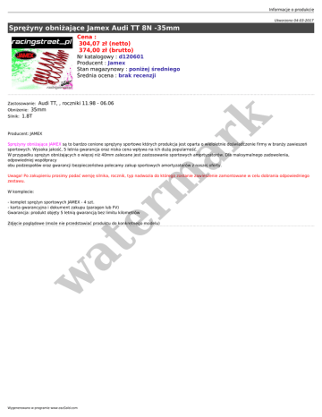 Informacje o produkcie Utworzono 04-03-2017 Sprężyny obniżające Jamex Audi TT 8N -35mm Cena : 304,07 zł (netto) 374,00 zł (brutto) Nr katalogowy : d120601 Producent : Jamex Stan magazynowy : poniżej średniego Średnia ocena : brak recenzji Audi TT, , roczniki 11.98 - 06.06 35mm Silnik: 1.8T Zastosowanie: er m ar k Obniżenie: Producent: JAMEX Sprężyny obniżające JAMEX są to bardzo cenione sprężyny sportowe których produkcja jest oparta o wieloletnie doświadczenie firmy w branży zawieszeń sportowych. Wysoka jakość, 5 letnia gwarancja oraz niska cena wpływa na ich dużą popularność. W przypadku sprężyn obniżających o więcej niż 40mm zalecane jest zastosowanie sportowych amortyzatorów. Dla maksymalnego zadowolenia, odpowiedniej współpracy obu podzespołów oraz gwarancji bezpieczeństwa polecamy zakup sportowych amortyzatorów z naszej oferty. Uwaga! Po zakupieniu prosimy podać wersję silnika, rocznik, typ nadwozia do którego zostanie zawieszenie zamontowane w celu dobrania odpowiedniego zestawu. W komplecie: - komplet sprężyn sportowych JAMEX - 4 szt. - karta gwarancyjna i dokument zakupu (paragon lub FV) Gwarancja: produkt objęty 5 letnią gwarancją bez limitu kilometrów w at Zdjęcie poglądowe (może nie przedstawiać produktu do konkretnego modelu) Wygenerowano w programie www.oscGold.com