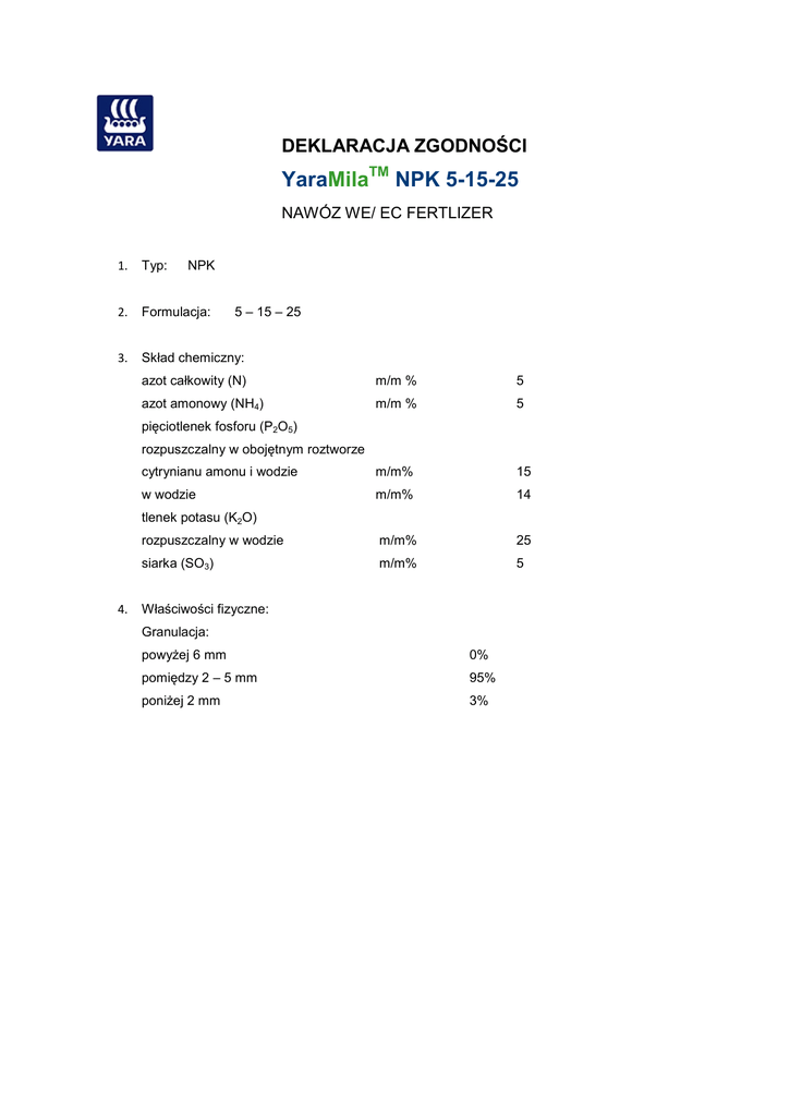 DEKLARACJA ZGODNOŚCI YaraMilaTM NPK 5-15-25 NAWÓZ WE/ EC FERTLIZER 1. Typ: 2. Formulacja: 3. Skład chemiczny: NPK 5 – 15 – 25 azot całkowity (N) m/m % 5 azot amonowy (NH4) m/m % 5 cytrynianu amonu i wodzie m/m% 15 w wodzie m/m% 14 rozpuszczalny w wodzie m/m% 25 siarka (SO3) m/m% 5 pięciotlenek fosforu (P2O5) rozpuszczalny w obojętnym roztworze tlenek potasu (K2O) 4. Właściwości fizyczne: Granulacja: powyżej 6 mm 0% pomiędzy 2 – 5 mm 95% poniżej 2 mm 3%
