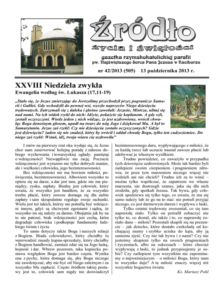 gazetka rzymskokatolickiej parafii pw. Najświętszego Serca Pana Jezusa w Raciborzu nr 42/2013 (505) 13 października 2013 r. XXVIII Niedziela zwykła Ewangelia według św. Łukasza (17,11-19) „Stało się, Ŝe Jezus zmierzając do Jerozolimy przechodził przez pogranicze Samarii i Galilei. Gdy wchodzili do pewnej wsi, wyszło naprzeciw Niego dziesięciu trędowatych. Zatrzymali się z daleka i głośno zawołali: Jezusie, Mistrzu, ulituj się nad nami. Na ich widok rzekł do nich: Idźcie, pokaŜcie się kapłanom. A gdy szli, zostali oczyszczeni. Wtedy jeden z nich widząc, Ŝe jest uzdrowiony, wrócił chwaląc Boga donośnym głosem, upadł na twarz do nóg Jego i dziękował Mu. A był to Samarytanin. Jezus zaś rzekł: Czy nie dziesięciu zostało oczyszczonych? Gdzie jest dziewięciu? Ŝaden się nie znalazł, który by wrócił i oddał chwałę Bogu, tylko ten cudzoziemiec. Do niego zaś rzekł: Wstań, idź, twoja wiara cię uzdrowiła” I znów na pierwszy rzut oka wydaje się, Ŝe Jezus chce nam zaserwować kolejną poradę z zakresu dobrego wychowania i towarzyskiej ogłady: pamiętaj o wdzięczności! Niewątpliwie ma rację. Poczucie wdzięczności jest wyrazem nie tylko dobrych manier, ale i wielkości człowieka, jego bezinteresowności. Bez wdzięczności nie ma bowiem miłości, poświęcenia, bezinteresowności. Albowiem wszystko to opiera się na darze, a dar jest tam, gdzie nie ma pieniędzy, zysku, zapłaty. Biedny jest człowiek, który uwaŜa, Ŝe wszystko jest handlem, Ŝe za wszystko trzeba płacić, który zawsze domaga się dla siebie zapłaty i sam skrupulatnie reguluje swoje rachunki. Wielu jest teŜ takich, którzy nie potrafią być wdzięczni innym, gdyŜ są chciwymi egoistami i sądzą, Ŝe wszystko im się naleŜy za darmo. Obojętnie jak by na to nie patrzeć, brak wdzięczności jest cechą, która degraduje człowieka i podkopuje fundamenty ludzkiego świata i Ŝycia. To samo dotyczy takŜe Boga i naszych relacji z Bogiem. Biada człowiekowi, który chciałby tu wprowadzić zasady kupna-sprzedaŜy, który chciałby z Bogiem handlować, zamiast zdać się na Jego łaskę, hojność i dar. Wbrew pozorom, taka kupiecka postawa względem Boga jest bardzo częsta. Wynika ona z pychy, która domaga się, aby Bogu niczego nie zawdzięczać, aby nie być od Niego zaleŜnym i za wszystko Mu zapłacić. Często źródłem takiej postawy jest to, człowiek sam nigdy nie doświadczył bezinteresownego daru, wypływającego z miłości, Ŝe za kaŜdą rzecz lub uczucie musiał zawsze płacić lub zdobywać je własnym wysiłkiem. Trudno powiedzieć, co zawaŜyło w przypadku tych dziewięciu uzdrowionych. MoŜe tak bardzo byli zaślepieni swoim cierpieniem i pragnieniem zdrowia, Ŝe poza tym marzeniem niczego więcej nie widzieli ani nie chcieli? Trudno ich za to winić – moŜna tylko współczuć, Ŝe zapatrzeni we własne marzenia, nie dostrzegli szansy, jaka się dla nich zrodziła, gdy spotkali Jezusa. Tak bywa, gdy człowiek spodziewa się tylko tego, co uwaŜa, Ŝe mu się samo naleŜy lub Ŝe go na to stać: nie potrafi przyjąć niczego, co jest darmowym darem i wypływa z łaski. Tylko ostatni trędowaty zrozumiał, co się tam naprawdę stało. Tylko on potrafił zobaczyć nie tylko to, co dostał, ale takŜe i to, co naprawdę zostało dane – miłość! Pozostali skupili się na prezencie – jak dziecko, które dostało czekoladę od kochającej mamy i szybko ucieka do kąta, aby ją samemu zjeść. Czy nie tak bywa i z nami? Czy nie jesteśmy skupieni tylko na swoich pragnieniach i Ŝyczeniach, albo na sukcesach – które chociaŜ wypływają z łaski, to jednak przypisujemy je sobie? Czy zaślepieni tym wszystkim nie zapominamy o najwaŜniejszym – o miłości Boga, który nam to wszystko daje? A ta miłość znaczy więcej niŜ wszystkie bogactwa świata. Ks. Mariusz Pohl 2 Źródło - gazetka Poniedziałek – 14 października 2013 Łk 11,29-32 630 Za † kapłana Philippa Wollnika w 7. rocznicę śmierci, †† siostrę Marię, rodziców i rodzeństwo 700 Za Weronikę, Jana i Bolesława Szeremet oraz za z rodziny Goszko i Szeremet 1800 1. Za † Jerzego Taszkę w rocznicę śmierci 2. Do BoŜej Opatrzności przez wstawiennictwo Matki Boskiej Nieustającej Pomocy z podziękowaniem za odebrane łaski w intencji Jerzego z okazji 60. rocznicy urodzin, z prośbą o dalsze BoŜe błogosławieństwo i zdrowie w rodzinie 3. Za † ojca Aleksandra w 1. rocznicę śmierci NaboŜeństwo róŜańcowe Wtorek – 15 października 2013 – św. Teresy od Jezusa, dz. i doktora K-ła Łk 11,37-41 DZIEŃ DZIECKA UTRACONEGO 630 Za † Władysława oraz za †† z rodzin Urban, Stryjewski, Zapart i Pałka W języku niemieckim: za † Ŝonę Kazimierę Bobko w 1. rocznicę śmierci 800 900 Za †† Fridolina Buglę, rodziców i dusze w czyśćcu cierpiące 1800 1. Za †† Eryka Waniek, syna Rajmunda i rodziców z obu stron 2. Msza Święta zbiorowa za zmarłych: za †† rodziców Zeman, siostry i trzech braci, za † matkę Agnieszkę Bauer, †† braci Damiana i Janusza i †† z pokrewieństwa, za † Łucję Zimny w 1. rocznicę śmierci (od koleŜanki Ireny), , za † Ernesta Wuttke (od współlokatorów z ulicy Katowickiej 15), za †† Czesława Kociołka, Karolinę i Józefa Rusin, Marię i Stefana Leszczyszyn, za † Marię Szulc, za † Janinę Iwaneczko w 4. rocznicę śmierci, za † Martę Lukoszek (od sąsiadów z ulicy Opawskiej i Grunwaldzkiej), za † Zofię Chylewską (w 30. dzień), za † Dorotę Lesiuk (od współlokatorów z ulicy Waryńskiego 7a-d), za † Stefanię Pankiewicz (w 30. dzień), o dar Ŝycia wiecznego dla Stanisława Płaczka w 2. rocznicę śmierci, za †† rodziców Zofię i Norberta Hmielorz, teściów i †† z pokrewieństwa, za † Stefanię Bartoszewską (od mieszkańców z ulicy Katowickiej 11), za † Jana Potaczka (w 30. dzień od szwagierki Rity Strzałka z rodziną), za † męŜa Adama Chudzi