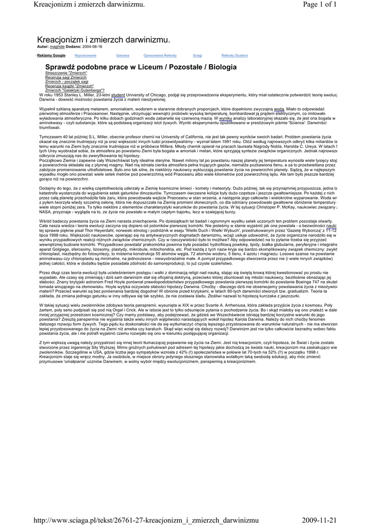 Kreacjonizm i zmierzch darwinizmu. Page 1 of 1 Kreacjonizm i zmierzch darwinizmu. Autor: maghide Dodano: 2004-08-16 Reklamy Google Wypracowanie Gotowce Opracowania Referaty Sciagi Referaty Studenci Sprawdź podobne prace w Liceum / Pozostałe / Biologia Streszczenie "Zmierzch" Recenzja sagi Zmierzch Zmierzch - początek sagi Recenzja ksiąŜki "Zmierzch" Zmierzch "Galaktyki Gutenberga"? W roku 1953 Stanley L. Miller, 23-letni student University of Chicago, podjął się przeprowadzenia eksperymentu, który miał ostatecznie potwierdzić teorię ewolucji Darwina - dowieść moŜności powstania Ŝycia z materii nieoŜywionej. Wypełnił szklaną aparaturę metanem, amoniakiem, wodorem w starannie dobranych proporcjach, które dopełniono zwyczajną wodą. Miało to odpowiadać pierwotnej atmosferze i Praoceanowi. Następnie, utrzymując wewnątrz probówki wysoką temperaturę, bombardował ją prądem elektrycznym, co imitowało wyładowania atmosferyczne. Po kilku dobach godzinach woda zabarwiła się czerwoną mazią. W wyniku analizy laboratoryjnej okazało się, Ŝe jest ona bogata w aminokwasy - czyli substancje, które są podstawą organizacji istot Ŝywych. Wyniki eksperymentu opublikowano w prestiŜowym piśmie 'Science'. Darwiniści triumfowali. Tymczasem 40 lat później S.L. Miller, obecnie profesor chemii na University of California, nie jest tak pewny wyników swoich badań. Problem powstania Ŝycia okazał się znacznie trudniejszy niŜ ja oraz większość innych ludzi przewidywaliśmy - wyznał latem 1991 roku. OtóŜ według najnowszych odkryć kilka miliardów lat temu warunki na Ziemi były znacznie trudniejsze niŜ w próbówce Millera. Młody chemik opierał na pracach laureata Nagrody Nobla, Harolda C. Ureya. W latach 50 tych Urey wyobraŜał sobie, Ŝe atmosfera po powstaniu Ziemi była bogata w amoniak i metan, które sprzyjają syntezie związków organicznych. Jednak najnowsze odkrycia zmuszają nas do zweryfikowania tej hipotezy. Początkowo Ziemia i zapewne cały Wszechświat były idealnie sterylne. Nawet miliony lat po powstaniu naszej planety jej temperatura wynosiła wiele tysięcy stopni, a powierzchnia składała się z płynnej magmy. Nad nią istniała cienka atmosfera pełna trujących gazów, niemalŜe pozbawiona tlenu, a za to prześwietlana przez zabójcze promieniowanie ultrafioletowe. Było ono tak silne, Ŝe niektórzy naukowcy wykluczają powstanie Ŝycia na powierzchni planety. Sądzą, Ŝe w najlepszym wypadku mogło ono powstać wiele setek metrów pod powierzchnią wód Praoceanu albo wiele kilometrów pod powierzchnią lądu. Ale tam było jeszcze bardziej gorąco niŜ na powierzchni. Dodajmy do tego, Ŝe z wielką częstotliwością uderzały w Ziemię kosmiczne śmieci - komety i meteoryty. DuŜo później, tak się przynajmniej przypuszcza, jedna taka katastrofa wystarczyła do wygubienia setek gatunków dinozaurów. Tymczasem ówczesne kolizje były duŜo częstsze i jeszcze gwałtowniejsze. Po kaŜdej z nich przez całą planetę przechodziła fala Ŝaru, która powodowała wejście Praoceanu w stan wrzenia, a następnie jego całkowite i wielokrotne wyparowanie. Woda wraz z pyłem tworzyła wtedy szczelną osłonę, która nie dopuszczała na Ziemię promieni słonecznych, co dla odmiany powodowało gwałtowne obniŜenie temperatury na wiele stopni poniŜej zera. To tylko niektóre z elementów charakterystyki warunków do powstania Ŝycia. W tej sytuacji Christoper P. McKay, naukowiec związany z NASA, przyznaje - wygląda na to, ze Ŝycie nie powstało w małym ciepłym bajorku, lecz w szalejącej burzy. Wśród badaczy powstania Ŝycia na Ziemi narasta zniechęcenie. Po dziesiątkach lat badań i ogromnym wysiłku setek uczonych ten problem pozostaje otwarty. Cała nasza wiedza i teoria ewolucji zaczyna się dopiero od potomków pierwszej komórki. Nie jesteśmy w stanie wyjaśnić jak ona powstała - o bezwolności nauki w tej sprawie pięknie pisał Thor Heyerdahl, norweski etnolog i podróŜnik w eseju 'Wielki Duch i Wielki Wybuch', przedrukowanym przez 'Gazetę Wyborczą' z 11-12 lipca 1998 roku. Większość naukowców, opierając się na antykwarycznych dogmatach darwnizmu, wciąŜ usiłuje udowodnić, Ŝe Ŝycie organiczne narodziło się w wyniku przypadkowych reakcji róŜnych związków chemicznych. Czy w rzeczywistości było to moŜliwe? Aby odpowiedzieć na to pytanie trzeba się przyjrzeć wewnętrznej budowie komórki. 'Przypadkowo powstała' prakomórka powinna była posiadać hydrofilową powłokę, lipidy, białka globularne, peryferyjne i integralne, aparat Golgiego, sferosomy, lizosomy, plastydy, mikrobule, mitochondria, etc. Pod kaŜdą z tych nazw kryje się bardzo skomplikowany związek chemiczny: zwykły chloroplast, niezbędny do fotosyntezy, to misterna konstrukcja 55 atomów węgla, 72 atomów wodoru, 5 tlenu, 4 azotu i magnezu. Losowe szanse na powstanie aminokwasu czy chloroplastu są minimalne, na jednoczesne - niewyobraŜalnie małe. A pomysł przypadkowego stworzenia przez nie (i wiele innych związków) jednej całości, która w dodatku będzie posiadała zdolność do samoreprodukcji, to juŜ czyste szaleństwo. Przez długi czas teoria ewolucji była ucieleśnieniem postępu i walki z dominacją religii nad nauką, stając się świętą krową której kwestionować po prostu nie wypadało. Ale czasy się zmieniają i dziś sam darwinizm stał się oficjalną doktryną, przeciwko której zbuntowali się młodzi naukowcy, bezlitośnie obnaŜając jej słabości. Znany brytyjski astronom Fred Hoyle porównał prawdopodobieństwo przypadkowego powstania pierwszej komórki do powstanie Boeinga 747 na skutek tornada wirującego na złomowisku. Hoyle wytyka oczywiste słabości hipotezy Darwina. Choćby - dlaczego dziś nie obserwujemy powstawania Ŝycia z nieoŜywionej materii? PrzecieŜ warunki są bez porównania bardziej dogodne! W obronie przed krytykami, w latach 80-tych darwiniści stworzyli t