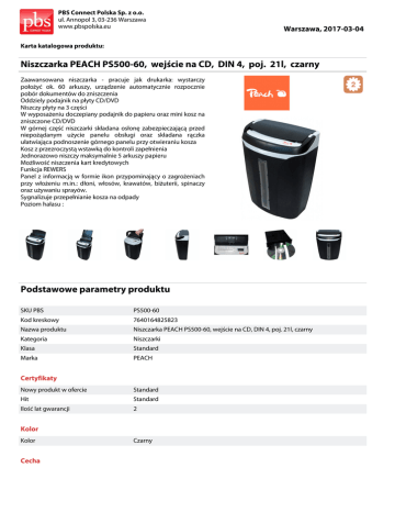 PBS Connect Polska Sp. z o.o. ul. Annopol 3, 03-236 Warszawa www.pbspolska.eu Warszawa, 2017-03-04 Karta katalogowa produktu: Niszczarka PEACH PS500-60, wejście na CD, DIN 4, poj. 21l, czarny Zaawansowana niszczarka - pracuje jak drukarka: wystarczy położyć ok. 60 arkuszy, urządzenie automatycznie rozpocznie pobór dokumentów do zniszczenia Oddziely podajnik na płyty CD/DVD Niszczy płyty na 3 części W wyposażeniu doczepiany podajnik do papieru oraz mini kosz na zniszczone CD/DVD W górnej część niszczarki składana osłonę zabezpieczającą przed niepożądanym użycie panelu obsługi oraz składana rączka ułatwiająca podnoszenie górnego panelu przy otwieraniu kosza Kosz z przezroczystą wstawką do kontroli zapełnienia Jednorazowo niszczy maksymalnie 5 arkuszy papieru Możliwość niszczenia kart kredytowych Funkcja REWERS Panel z informacją w formie ikon przypominający o zagrożeniach przy włożeniu m.in.: dłoni, włosów, krawatów, biżuterii, spinaczy oraz używaniu sprayów. Sygnalizuje przepełnianie kosza na odpady Poziom hałasu : Podstawowe parametry produktu SKU PBS PS500-60 Kod kreskowy 7640164825823 Nazwa produktu Niszczarka PEACH PS500-60, wejście na CD, DIN 4, poj. 21l, czarny Kategoria Niszczarki Klasa Standard Marka PEACH Certyfikaty Nowy produkt w ofercie Standard Hit Standard Ilość lat gwarancji 2 Kolor Kolor Cecha Czarny PBS Connect Polska Sp. z o.o. ul. Annopol 3, 03-236 Warszawa www.pbspolska.eu Warszawa, 2017-03-04 Karta katalogowa produktu cd. Niszczarka PEACH PS500-60, wejście na CD, DIN 4, poj. 21l, czarny Podstawowe parametry produktu Produkt Do małych biur Typ Standard Rodzaj Tnie CD Materiał Metal/plastik W ofercie od 2016-06 Wspólny słownik zamówień CPV 30191400-8 Niszczarki Jednostki logistyczne Opakowanie 1 2 szt Opakowanie 2 48 szt