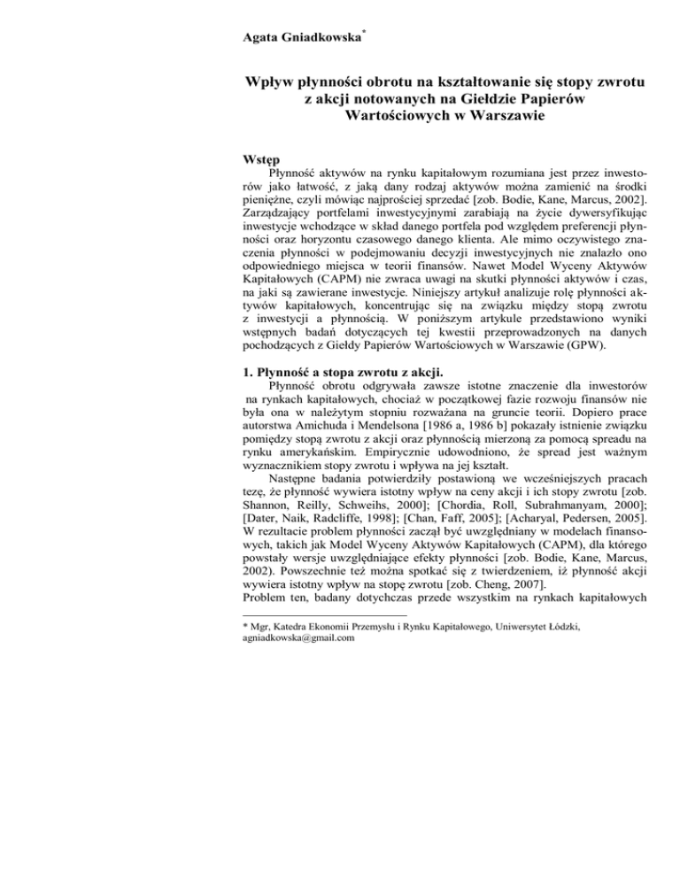 Agata Gniadkowska* Wpływ płynności obrotu na kształtowanie się stopy zwrotu z akcji notowanych na Giełdzie Papierów Wartościowych w Warszawie Wstęp Płynność aktywów na rynku kapitałowym rozumiana jest przez inwestorów jako łatwość, z jaką dany rodzaj aktywów można zamienić na środki pieniężne, czyli mówiąc najprościej sprzedać [zob. Bodie, Kane, Marcus, 2002]. Zarządzający portfelami inwestycyjnymi zarabiają na życie dywersyfikując inwestycje wchodzące w skład danego portfela pod względem preferencji płynności oraz horyzontu czasowego danego klienta. Ale mimo oczywistego znaczenia płynności w podejmowaniu decyzji inwestycyjnych nie znalazło ono odpowiedniego miejsca w teorii finansów. Nawet Model Wyceny Aktywów Kapitałowych (CAPM) nie zwraca uwagi na skutki płynności aktywów i czas, na jaki są zawierane inwestycje. Niniejszy artykuł analizuje rolę płynności aktywów kapitałowych, koncentrując się na związku między stopą zwrotu z inwestycji a płynnością. W poniższym artykule przedstawiono wyniki wstępnych badań dotyczących tej kwestii przeprowadzonych na danych pochodzących z Giełdy Papierów Wartościowych w Warszawie (GPW). 1. Płynność a stopa zwrotu z akcji. Płynność obrotu odgrywała zawsze istotne znaczenie dla inwestorów na rynkach kapitałowych, chociaż w początkowej fazie rozwoju finansów nie była ona w należytym stopniu rozważana na gruncie teorii. Dopiero prace autorstwa Amichuda i Mendelsona [1986 a, 1986 b] pokazały istnienie związku pomiędzy stopą zwrotu z akcji oraz płynnością mierzoną za pomocą spreadu na rynku amerykańskim. Empirycznie udowodniono, że spread jest ważnym wyznacznikiem stopy zwrotu i wpływa na jej kształt. Następne badania potwierdziły postawioną we wcześniejszych pracach tezę, że płynność wywiera istotny wpływ na ceny akcji i ich stopy zwrotu [zob. Shannon, Reilly, Schweihs, 2000]; [Chordia, Roll, Subrahmanyam, 2000]; [Dater, Naik, Radcliffe, 1998]; [Chan, Faff, 2005]; [Acharyal, Pedersen, 2005]. W rezultacie problem płynności zaczął być uwzględniany w modelach finansowych, takich jak Model Wyceny Aktywów Kapitałowych (CAPM), dla którego powstały wersje uwzględniające efekty płynności [zob. Bodie, Kane, Marcus, 2002). Powszechnie też można spotkać się z twierdzeniem, iż płynność akcji wywiera istotny wpływ na stopę zwrotu [zob. Cheng, 2007]. Problem ten, badany dotychczas przede wszystkim na rynkach kapitałowych * Mgr, Katedra Ekonomii Przemysłu i Rynku Kapitałowego, Uniwersytet Łódzki, [email protected] 564 Agata Gniadkowska państw wysoko rozwiniętych, nie doczekał się należytej analizy na danych pochodzących z polskiego rynku kapitałowego. W poniższym artykule prezentuję kolejne wyniki początkowych badań dotyczących tej kwestii podjętych w Katedrze Ekonomii Przemysłu i Rynku Kapitałowego Uniwersytetu Łódzkiego. Podstawowa koncepcja tych badań została skonstruowana na podstawie wymienionych prac Amihuda i Mendelsona. Główne pytanie, na jakie próbuje się w nich odpowiedzieć dotyczy tego, czy płynność akcji wywiera mierzalny wpływ na uzyskiwaną stopę zwrotu. W badaniu za miary płynności przyjęto spread oraz wielkość obrotu. Spread jest różnicą pomiędzy najlepszą ofertą kupna i sprzedaży przed zawarciem każdej transakcji, ważoną wartością obrotów podawaną w punktach bazowych. Badania pokazują, że spread, przedstawiany jako procent z ceny, wykazuje silną ujemną korelację z atrybutami, które odzwierciedlają płynność obrotu. Tak mierzony spread jest naturalnym wyznacznikiem kosztów płynności. Inwestorzy kupujący papiery wartościowe po odliczeniu kosztów transakcji powinni wymagać wyższych zysków od papierów z wyższymi spreadami w celu zrekompensowania im wyższych kosztów transakcji. Jeżeli okres inwestycyjny w przypadku danych papierów wartościowych jest taki sam, to inwestor będzie oczekiwał stopy zwrotu z tej inwestycji plus wartość spreadu. Jeśli papiery wartościowe były przechowywane przez okres jednego roku, to na przykład akcja z 2 % spreadem powinna przynosić oczekiwaną stopę zwrotu o 1,5% wyższą, aniżeli akcje o spreadzie 0,5%. Decyzje inwestycyjne powinny zatem zależeć nie tylko od stopnia ryzyka związanego z inwestycją, ale także od płynności. Ponadto, ważne jest, aby pamiętać, że choć inwestor może zmniejszyć ryzyko przez zdywersyfikowanie portfela lub zastosować strategię zabezpieczającą, niewiele może zrobić na własną rękę, aby uniknąć kosztów płynności 1. Oprócz spreadu do pomiaru płynności przyjęto także dane dotyczące wielkości obrotu. Wielkość obrotu wyraża łączną liczbę papierów wartościowych, które zmieniły właściciela, licząc dla danego papieru wartościowego lub rynku. Wszystkie miary można traktować jako naturalną miarę kosztu płynności lub też, jak kto woli, kosztu braku płynności. Przy tak rozumianym pojęciu płynności pojawia się podstawowe pytanie, w jaki sposób powinna ona wpływać na stopy zwrotu z akcji. Powinna więc istnieć korelacja pomiędzy stopą zwrotu a płynnością wyrażoną spreadem lub wielkością obrotu akcji. W analizie relacji pomiędzy płynnością a stopą zwrotu należy jeszcze uwzględnić przynajmniej jeden ważny czynnik, jakim jest horyzont czasowy inwestycji, który ma znaczenie dla wpływu płynności na stopę zwrotu. Według Amihuda i Mendelsona, jeśli wszyscy inwestorzy mieliby taki sam horyzont inwestycyjny, wówczas należałoby oczekiwać, iż akcje o wysokiej płynności przynosiłyby wyższa stopę zwrotu i odwrotnie, mało płynne papiery warto1 Należy pamiętać, że inwestor może wyeliminować niesystematyczne ryzyko związane z danym papierem wartościowym praktycznie do zera w wyniku dywersyfikacji oraz stworzenia portfela, którego współczynnik Beta będzie wynosił zero, aby uniknąć systematycznego (ryn