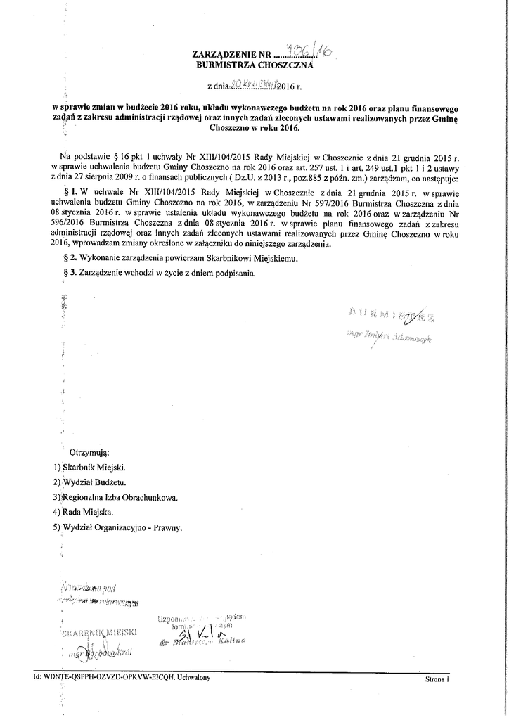 uchwalenia bud¿etu Gminy Choszczno na rok 2016, w zarz¹dzeniu Nr 597/2016 Burmistrza Choszczna z dnia
