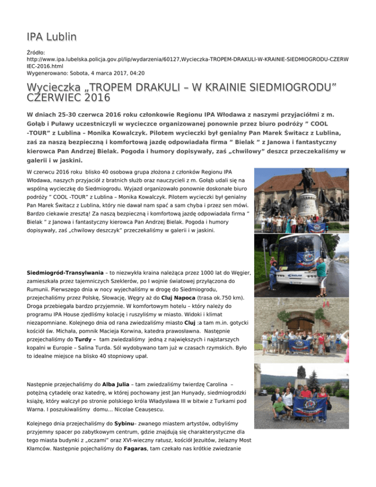 IPA Lublin Źródło: http://www.ipa.lubelska.policja.gov.pl/lip/wydarzenia/60127,Wycieczka-TROPEM-DRAKULI-W-KRAINIE-SIEDMIOGRODU-CZERW IEC-2016.html Wygenerowano: Sobota, 4 marca 2017, 04:20 Wycieczka „TROPEM DRAKULI – W KRAINIE SIEDMIOGRODU” CZERWIEC 2016 W dniach 25-30 czerwca 2016 roku członkowie Regionu IPA Włodawa z naszymi przyjaciółmi z m. Gołąb i Puławy uczestniczyli w wycieczce organizowanej ponownie przez biuro podróży ” COOL -TOUR” z Lublina – Monika Kowalczyk. Pilotem wycieczki był genialny Pan Marek Świtacz z Lublina, zaś za naszą bezpieczną i komfortową jazdę odpowiadała firma ” Bielak ” z Janowa i fantastyczny kierowca Pan Andrzej Bielak. Pogoda i humory dopisywały, zaś „chwilowy” deszcz przeczekaliśmy w galerii i w jaskini. W czerwcu 2016 roku blisko 40 osobowa grupa złożona z członków Regionu IPA Włodawa, naszych przyjaciół z bratnich służb oraz nauczycieli z m. Gołąb udali się na wspólną wycieczkę do Siedmiogrodu. Wyjazd organizowało ponownie doskonałe biuro podróży ” COOL -TOUR” z Lublina – Monika Kowalczyk. Pilotem wycieczki był genialny Pan Marek Świtacz z Lublina, który nie dawał nam spać a sam chyba i przez sen mówi. Bardzo ciekawie zresztą! Za naszą bezpieczną i komfortową jazdę odpowiadała firma ” Bielak ” z Janowa i fantastyczny kierowca Pan Andrzej Bielak. Pogoda i humory dopisywały, zaś „chwilowy deszczyk” przeczekaliśmy w galerii i w jaskini. Siedmiogród-Transylwania – to niezwykła kraina należąca przez 1000 lat do Węgier, zamieszkała przez tajemniczych Szeklerów, po I wojnie światowej przyłączona do Rumunii. Pierwszego dnia w nocy wyjechaliśmy w drogę do Siedmiogrodu, przejechaliśmy przez Polskę, Słowację, Węgry aż do Cluj Napoca (trasa ok.750 km). Droga przebiegała bardzo przyjemnie. W komfortowym hotelu – który należy do programu IPA House zjedliśmy kolację i ruszyliśmy w miasto. Widoki i klimat niezapomniane. Kolejnego dnia od rana zwiedzaliśmy miasto Cluj :a tam m.in. gotycki kościół św. Michała, pomnik Macieja Korwina, katedra prawosławna. Następnie przejechaliśmy do Turdy – tam zwiedzaliśmy jedną z największych i najstarszych kopalni w Europie – Salina Turda. Sól wydobywano tam już w czasach rzymskich. Było to idealne miejsce na blisko 40 stopniowy upał. Następnie przejechaliśmy do Alba Julia – tam zwiedzaliśmy twierdzę Carolina – potężną cytadelę oraz katedrę, w której pochowany jest Jan Hunyady, siedmiogrodzki książę, który walczył po stronie polskiego króla Władysława III w bitwie z Turkami pod Warna. I poszukiwaliśmy domu… Nicolae Ceaușescu. Kolejnego dnia przejechaliśmy do Sybinu– zwanego miastem artystów, odbyliśmy przyjemny spacer po zabytkowym centrum, gdzie znajdują się charakterystyczne dla tego miasta budynki z „oczami” oraz XVI-wieczny ratusz, kościół Jezuitów, żelazny Most Kłamców. Następnie pojechaliśmy do Fagaras, tam czekało nas krótkie zwiedzanie renesansowej twierdzy. Kolejny w niezwykle napiętym planie był Brasow. Tam zwiedzaliśmy Stare Miasto, rynek, czarny Kościół, mury obronne, wyjechaliśmy kolejką na wzgórze Tampa – gdzie rozpościerała się fantastyczna panorama miasta. Następnego dnia zwiedzaliśmy zamek Bran – legendarną siedzibę Drakuli – najładniejszy zamek Rumunii, siedzibę królów rumuńskich. Tam ku wspólnemu spotkaliśmy honorowego członka IPA Polska z klubu „HOG Wrocław”. Następnie zwiedzaliśmy zamek chłopski Rasnow – średniowieczną wioskę – fortecę, wybudowaną w miejscu dawnego zamku krzyżackiego, Kościół obronny w Prejmer – najlepiej z zachowanych kościołów obronnych Transylwanii – pokrzyżacki i jednocześnie pocysterski kościół pod wezwaniem Świętego Krzyża, wpisany na listę UNESCO. Rano pojechaliśmy do Sighisoary, którego starówka jest objęta ochroną UNESCO i stanowi jeden z najpiękniejszych i najlepiej zachowanych średniowiecznych miast w Europie, miejsce urodzin Vlada Tepesa – Drakuli. Wróciliśmy do Cluj, gdzie ponownie nocowaliśmy w godnym polecenia Hotel-Confort-Cluj-Napoca. W drodze powrotnej zwiedziliśmy Tokaj, gdzie zakupiliśmy liczne pamiątki regionalne. Cali, zdrowi i szczęśliwi wróciliśmy do domu. Już w drodze powrotnej zaplanowaliśmy kolejne wyjazdy z biurem Cool – Tour –m.in. majówka w Bawarii i wakacje w Albanii:). Dziękujemy wszystkim bez których wyjazd ten nie mógł by się odbyć i za wspólny fantastyczny czas! Tekst: Bożena Szymańska na podstawie programu ” Cool – TOUR” Fot. Darek Demczuk, Emilia Tkaczuk, Artur Rapa Pozostałe zdjęcia na stronie http://ipa.wlodawa.eu/wycieczka-w-krainie-siedmiogrodu-tropem-drakuli Ocena: 5/5 (1) Tweetnij