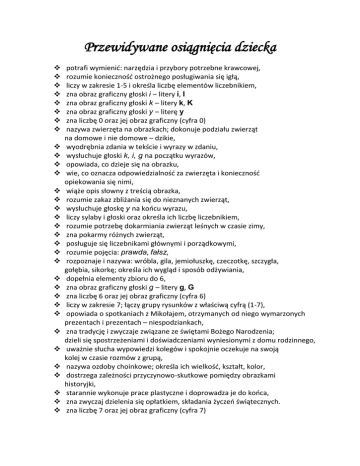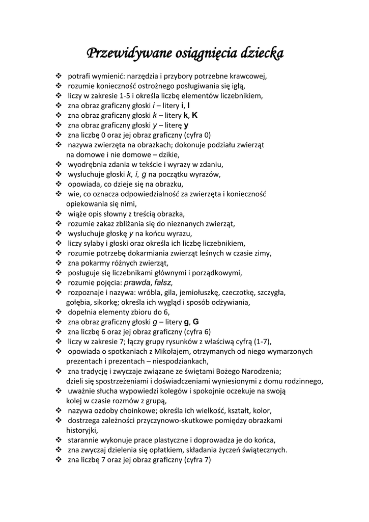 Przewidywane osiągnięcia dziecka potrafi wymienić: narzędzia i przybory potrzebne krawcowej, rozumie konieczność ostrożnego posługiwania się igłą, liczy w zakresie 1-5 i określa liczbę elementów liczebnikiem, zna obraz graficzny głoski i – litery i, I zna obraz graficzny głoski k – litery k, K zna obraz graficzny głoski y – literę y zna liczbę 0 oraz jej obraz graficzny (cyfra 0) nazywa zwierzęta na obrazkach; dokonuje podziału zwierząt na domowe i nie domowe – dzikie, wyodrębnia zdania w tekście i wyrazy w zdaniu, wysłuchuje głoski k, i, g na początku wyrazów, opowiada, co dzieje się na obrazku, wie, co oznacza odpowiedzialność za zwierzęta i konieczność opiekowania się nimi, wiąże opis słowny z treścią obrazka, rozumie zakaz zbliżania się do nieznanych zwierząt, wysłuchuje głoskę y na końcu wyrazu, liczy sylaby i głoski oraz określa ich liczbę liczebnikiem, rozumie potrzebę dokarmiania zwierząt leśnych w czasie zimy, zna pokarmy różnych zwierząt, posługuje się liczebnikami głównymi i porządkowymi, rozumie pojęcia: prawda, fałsz, rozpoznaje i nazywa: wróbla, gila, jemiołuszkę, czeczotkę, szczygła, gołębia, sikorkę; określa ich wygląd i sposób odżywiania, dopełnia elementy zbioru do 6, zna obraz graficzny głoski g – litery g, G zna liczbę 6 oraz jej obraz graficzny (cyfra 6) liczy w zakresie 7; łączy grupy rysunków z właściwą cyfrą (1-7), opowiada o spotkaniach z Mikołajem, otrzymanych od niego wymarzonych prezentach i prezentach – niespodziankach, zna tradycję i zwyczaje związane ze świętami Bożego Narodzenia; dzieli się spostrzeżeniami i doświadczeniami wyniesionymi z domu rodzinnego, uważnie słucha wypowiedzi kolegów i spokojnie oczekuje na swoją kolej w czasie rozmów z grupą, nazywa ozdoby choinkowe; określa ich wielkość, kształt, kolor, dostrzega zależności przyczynowo-skutkowe pomiędzy obrazkami historyjki, starannie wykonuje prace plastyczne i doprowadza je do końca, zna zwyczaj dzielenia się opłatkiem, składania życzeń świątecznych. zna liczbę 7 oraz jej obraz graficzny (cyfra 7)