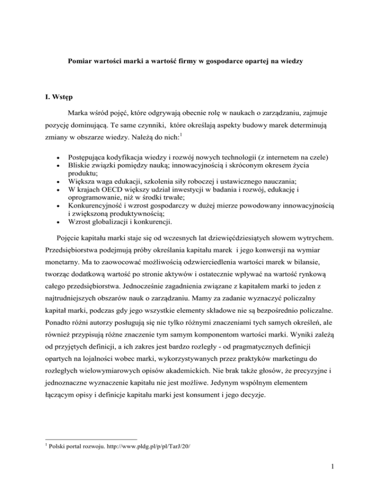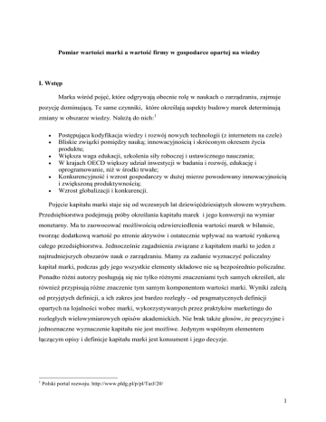 Pomiar wartości marki a wartość firmy w gospodarce opartej na wiedzy I. Wstęp Marka wśród pojęć, które odgrywają obecnie rolę w naukach o zarządzaniu, zajmuje pozycję dominującą. Te same czynniki, które określają aspekty budowy marek determinują zmiany w obszarze wiedzy. Należą do nich:1 Postępująca kodyfikacja wiedzy i rozwój nowych technologii (z internetem na czele) Bliskie związki pomiędzy nauką; innowacyjnością i skróconym okresem życia produktu; Większa waga edukacji, szkolenia siły roboczej i ustawicznego nauczania; W krajach OECD większy udział inwestycji w badania i rozwój, edukację i oprogramowanie, niż w środki trwałe; Konkurencyjność i wzrost gospodarczy w dużej mierze powodowany innowacyjnością i zwiększoną produktywnością; Wzrost globalizacji i konkurencji. Pojęcie kapitału marki staje się od wczesnych lat dziewięćdziesiątych słowem wytrychem. Przedsiębiorstwa podejmują próby określania kapitału marek i jego konwersji na wymiar monetarny. Ma to zaowocować możliwością odzwierciedlenia wartości marek w bilansie, tworząc dodatkową wartość po stronie aktywów i ostatecznie wpływać na wartość rynkową całego przedsiębiorstwa. Jednocześnie zagadnienia związane z kapitałem marki to jeden z najtrudniejszych obszarów nauk o zarządzaniu. Mamy za zadanie wyznaczyć policzalny kapitał marki, podczas gdy jego wszystkie elementy składowe nie są bezpośrednio policzalne. Ponadto różni autorzy posługują się nie tylko różnymi znaczeniami tych samych określeń, ale również przypisują różne znaczenie tym samym komponentom wartości marki. Wyniki zależą od przyjętych definicji, a ich zakres jest bardzo rozległy - od pragmatycznych definicji opartych na lojalności wobec marki, wykorzystywanych przez praktyków marketingu do rozległych wielowymiarowych opisów akademickich. Nie brak także głosów, że precyzyjne i jednoznaczne wyznaczenie kapitału nie jest możliwe. Jedynym wspólnym elementem łączącym opisy i definicje kapitału marki jest konsument i jego decyzje. 1 Polski portal rozwoju. http://www.pldg.pl/p/pl/TarJ/20/ 1 II. Składowe kapitału marki Zestawienia wartości marek (np. Equitrend Index, Financial World Index), które coraz częściej pojawiają się w prasie specjalistycznej, jak również badania określające poszczególne składniki kapitału marki, takie jak rozpoznawalność, wizerunek czy poziom lojalności nie rozwiązują problem wyceny wartości marki. Problem ten nie jest obcy zarówno teoretykom marketingu jak i praktyce biznesu. Nawet zaangażowanie takich gwiazd światowego marketingu akademickiego jak David Aaker czy Kevin Keller, nie pozwoliło na zakończenie sporów definicyjnych i określenie spójnych i precyzyjnych poglądów. Prawdopodobnie ze względu na interdyscyplinarność tematu wykształciło się kilka perspektyw zarządzania wartością (kapitałem) marki. Pierwsza z nich obejmuje finansowe aspekty kapitału marki. Dotyczy ona problematyki tworzenia wartości marek na potrzeby przejęć czy sprzedaży firm oraz wartości dodanej skumulowanej w znakach towarowych. Druga grupa to aspekty zmierzające do usprawnienia i zwiększania skuteczności i efektywności działalności marketingowej. Wyższe koszty działalności, nasilenie konkurencji i ograniczenia popytu wymagają coraz to nowych narzędzi konkurowania i innych systemów zarządzania przedsiębiorstwem. Wszystkie definicje łączy stwierdzenie, iż kapitał marki to wartość dodana, którą uzyskuje produkt poprzez użycie znaku towarowego. Wartość ta może być definiowana z trzech punktów widzenia2: 1. Z punktu widzenia firmy właściciela marki oznacza zwiększenie konkurencyjności firmy. Otwiera możliwość łatwiejszego wprowadzania nowych produktów i podstawę do rozszerzania marki i licencjonowania na inne produkty czy usługi. Pozwala także łatwiej przetrwać sytuacje kryzysowe, takie jak nagłe zmiany trendów czy zmniejszenie dotacji z firmy matki. Daje wreszcie możliwość łatwiejszego odpierania ataków konkurencji, a czasami ustabilizowane marki są znaczącymi barierami wejścia do danego sektora. 2. Z punktu widzenia kanałów dystrybucji kapitał marki uwidacznia się w poziomie sprzedaży w stosunku do innych produktów z kategorii. Poziom ten wynika z mniej skomplikowanego procesu dokonywania zakupu w przypadku produktów markowych i w większości wypadków lepiej zorganizowanej dystrybucji. 2 Farquar, P.H. Managing Brand Equity, Marekting Research, Sept. 1989 vol.1, Iss 3, strony 24-33 2 3. Z punktu widzenia konsumenta kapitał marki oznacza pozytywną postawę wobec markowego produktu. A kapitał ten podobnie jak inne aktywa może stać się własnością firmy w drodze zakupu, dzierżawy lub samodzielnego budowania (Farquhar).3 Budowanie kapitału marki w ramach rynkowej działalności przedsiębiorstwa, w pierwszej kolejności powinno doprowadzić do korzystnej oceny marki w percepcji konsumenta. Ważne jest, aby miało to miejsce zarówno w sferze afektywnej jak i poznawczej. Pozytywna ocena konsumentów z docelowych segmentów rynku jest warunkiem koniecznym dla budowania wartości marki, aczkolwiek niewystarczającym. Drugim niezbędnym elementem jest pozytywna postawa wobec marki i możliwość jej przywołania w pamięci konsumenta (accessible brand attitude). Trzecim elementem silnej marki jest spójny wizerunek marki jako element komunikowania na drodze firma – finalny konsument. Inną drogą osiągnięcia wysokiej wartości marki jest „wydzierżawienie” kapitału poprzez strategię rozszerzania marki czy to w obecnej kategorii produktowej czy też poza nią lub też zakup silnej marki poprzez przejęcie przedsiębiorstwa właściciela lub jakaś forma licencjonowania lub franchisingu. Budowanie kapitału marką odbywa się w trzech fazach. Pierwsza z nich „wprowadzenie”4 - polega na budowaniu pozytywnego wizerunku marki w oparciu o pr
