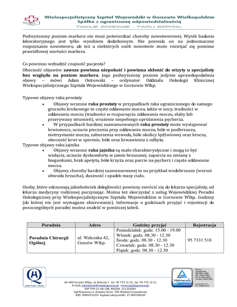 Podwyższony poziom markera nie musi potwierdzać choroby nowotworowej. Wynik badania laboratoryjnego jest tylko wynikiem dodatkowym. Nie pozwala on na jednoznaczne rozpoznanie nowotworu, ale też u niektórych osób nowotwór może rozwijać się pomimo prawidłowej wartości markera. Co powinno wzbudzić czujność pacjenta? Obecność objawów zawsze powinna niepokoić i powinna skłonić do wizyty u specjalisty bez względu na poziom markera. Jego podwyższony poziom jedynie uprawdopodabnia obawy – mówi Adam Ostrowski – ordynator Oddziału Onkologii Klinicznej Wielospecjalistycznego Szpitala Wojewódzkiego w Gorzowie Wlkp. Typowe objawy raka prostaty Objawy wczesne raka prostaty w przypadkach raka ograniczonego do samego gruczołu krokowego to częste oddawanie moczu, także w nocy, trudności w oddawaniu moczu (trudności w rozpoczęciu oddawania moczu, słaby lub przerywany strumień), wrażenie niepełnego opróżnienia pęcherza. W przypadkach bardziej zaawansowanych raka prostaty może występować krwiomocz, uczucie pieczenia przy oddawaniu moczu, bóle w podbrzuszu, nietrzymanie moczu, zaburzenia wzwodu, bóle okolicy lędźwiowej oraz krocza, obecność krwi w spermie, bóle oraz krwawienia z odbytu. Typowe objawy raka jajnika Objawy wczesne raka jajnika są mało charakterystyczne i mogą to być wzdęcia, uczucie dyskomfortu w jamie brzusznej, zaparcia na zmianę z biegunkami, brak apetytu, bóle krzyża oraz parcie na pęcherz i częste oddawanie moczu. Objawy choroby bardziej zaawansowanej to na przykład wodobrzusze (wzrost obwodu brzucha), duszność i spadek masy ciała. Osoby, które odczuwają jakiekolwiek dolegliwości powinny zwrócić się do lekarza specjalisty, od lekarza medycyny rodzinnej poczynając. Można też skorzystać z usług Wojewódzkiej Poradni Onkologicznej przy Wielospecjalistycznym Szpitalu Wojewódzkim w Gorzowie Wlkp. Godziny (do której nie jest wymagane skierowanie). Informacje o godzinach przyjęć i rejestracji do poszczególnych poradni można znaleźć w poniższej tabeli. Poradnia Adres Poradnia Chirurgii Ogólnej ul. Walczaka 42, Gorzów Wlkp. Godziny przyjęć Poniedziałek: godz. 15.00 - 19.00 Wtorek: godz. 08.30 - 12.30 Środa: godz. 08.30 - 12.30 Czwartek: godz. 08.30 - 12.30 Piątek: godz. 08.30 - 12.30 66-400 Gorzów Wlkp., ul. Dekerta 1 tel. 95 733 12 22, fax 95 733 12 21 E-mail: [email protected] www.szpital.gorzow.pl NIP 599-31-68-108, REGON 211228381 Sąd Rejonowy w Zielonej Górze VIII Wydział Gospodarczy, KRS 0000476259 Kapitał założycielski 47 000 000,00 Rejestracja 95 7331 518 Poradnia Gastroenterologiczna ul. Walczaka 42, Gorzów Wlkp. Poradnia Urologiczna ul. Walczaka 42, Gorzów Wlkp. Poradnia Laryngologiczna ul. Walczaka 42, Gorzów Wlkp. Poradnia Gruźlicy i Chorób Płuc ul. Walczaka 42, Gorzów Wlkp. Poradnia Chirurgii Onkologicznej ul. Walczaka 42, Gorzów Wlkp. Poradnia Onkologiczna ul. Walczaka 42, Gorzów Wlkp. Poniedziałek: 12:00 - 16:00 Czwartek: 14:00 - 18:00 Piątek: 10:00 - 15:00 Poniedziałek: godz. 15.00 - 19.00 Wtorek: godz. 15.00 - 19.00 Środa: godz. 15.00 - 19.00 Czwartek: godz. 15.00 - 19.00 Piątek: godz. 10.00 - 14.00 Poniedziałek: godz. 15.00 - 19.00 Wtorek: godz. 08.00 - 12.00 Czwartek: godz. 13.30 - 18.00 Poniedziałek: 8:00 - 13:30 Wtorek: 14:00 - 18:00 Środa: 8:00-13:30 Czwartek: 8:00-13:30 Piątek: 8:00-13:30 Środa: godz. 15:00 - 19:30 Czwartek: godz. 9:00 - 19:30 Piątek: godz. 9:00 - 14:30 Gabinet onkologii klinicznej Pon-Pt : godz. 8:30 - 14:30 Gabinet onkologiczny (ginekologia) Poniedziałek: godz. 8.00 - 14.00 95 7331 518 95 7331 862 95 7331 809 95 7331 862 95 7331 810 osobista godz. 7.30 - 9.00 telefoniczna godz. 9.00 12.00 95 7331 810