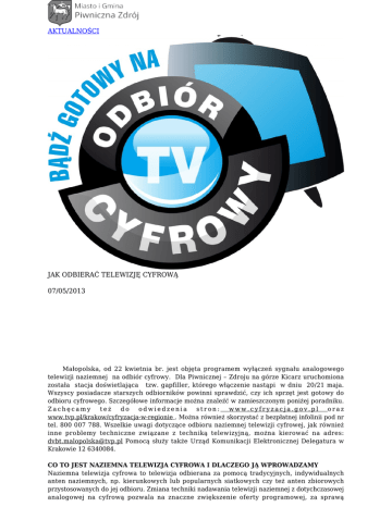 AKTUALNOŚCI JAK ODBIERAĆ TELEWIZJĘ CYFROWĄ 07/05/2013 Małopolska, od 22 kwietnia br. jest objęta programem wyłączeń sygnału analogowego telewizji naziemnej na odbiór cyfrowy. Dla Piwnicznej – Zdroju na górze Kicarz uruchomiona została stacja doświetlająca tzw. gapfiller, którego włączenie nastąpi w dniu 20/21 maja. Wszyscy posiadacze starszych odbiorników powinni sprawdzić, czy ich sprzęt jest gotowy do odbioru cyfrowego. Szczegółowe informacje można znaleźć w zamieszczonym poniżej poradniku. Zachęcamy też do odwiedzenia stron: www.cyfryzacja.gov.pl oraz www.tvp.pl/krakow/cyfryzacja-w-regionie . Można również skorzystać z bezpłatnej infolinii pod nr tel. 800 007 788. Wszelkie uwagi dotyczące odbioru naziemnej telewizji cyfrowej, jak również inne problemy techniczne związane z techniką telewizyjną, można kierować na adres: [email protected] Pomocą służy także Urząd Komunikacji Elektronicznej Delegatura w Krakowie 12 6340084. CO TO JEST NAZIEMNA TELEWIZJA CYFROWA I DLACZEGO JĄ WPROWADZAMY Naziemna telewizja cyfrowa to telewizja odbierana za pomocą tradycyjnych, indywidualnych anten naziemnych, np. kierunkowych lub popularnych siatkowych czy też anten zbiorowych przystosowanych do jej odbioru. Zmiana techniki nadawania telewizji naziemnej z dotychczasowej analogowej na cyfrową pozwala na znaczne zwiększenie oferty programowej, za sprawą oszczędniejszego wykorzystania częstotliwości. Dzięki temu na jednym kanale można nadawać kilka programów w miejsce jednego – analogowego, jak miało to miejsce do tej pory. Wprowadzanie naziemnej telewizji cyfrowej wynika z postanowień Regionalnej Konferencji Radiokomunikacyjnej, której członkiem jest Polska. Zwolnione po naziemnej telewizji analogowej częstotliwości będą wykorzystane w przyszłości, m.in. do nadawania kolejnych programów telewizji naziemnej lub Internetu. CO JEST POTRZEBNE, ABY ODBIERAĆ NAZIEMNĄ TELEWIZJĘ CYFROWĄ Do odbioru naziemnej telewizji cyfrowej potrzebny jest specjalny dekoder zgodny ze standardem DVB-T MPEG-4, wbudowany w telewizor lub zewnętrzny w formie przystawki (tzw. set-top-box) podłączony do telewizora oraz tak jak dotychczas antena naziemna. Widzowie korzystający ze starszych typów telewizorów, np. kineskopowych, aby odbierać nowoczesną naziemną telewizję cyfrową, powinni zakupić w sklepie RTV dekoder DVB-T MPEG-4, a następnie podłączyć go do telewizora za pomocą dostępnych z tyłu obudowy gniazd. Najpopularniejszym sposobem podłączenia dekodera w tym przypadku jest użycie gniazda EURO. Posiadacze telewizorów z wbudowanym dekoderem DVB-T MPEG-4 nie muszą się martwić, gdyż ich telewizor jest przystosowany do odbioru naziemnej telewizji cyfrowej. W obu przypadkach należy pamiętać o antenie, którą podłączamy do gniazda antenowego dekodera – jeżeli używamy telewizora starszego typu – lub do gniazda antenowego telewizora – dotyczy telewizorów z wbudowanymi fabrycznie dekoderami. Posiadacze kilkuletnich nowoczesnych telewizorów cyfrowych, np. LCD i Plazma powinni upewnić się, czy ich telewizor odbierze naziemną telewizję cyfrową. Nieco starsze modele telewizorów cyfrowych posiadają bowiem wbudowany dekoder DVB-T MPEG-2, który niestety nie umożliwia poprawnego odbioru naziemnej telewizji cyfrowej nadawanej w Polsce. W tym wypadku konieczne jest dokupienie do telewizora zewnętrznego dekodera DVB-T MPEG-4 i podłączenie go np. używając cyfrowe gniazdo HDMI. Zamiast dekodera można także dokupić specjalny moduł DVB-T MPEG-4 i podłączyć to do gniazda CI telewizora. Jednakże nie wszystkie telewizory posiadają takie gniazdo więc przed zakupem należy się o tym upewnić. Naziemną telewizję cyfrową można odbierać także na komputerze używając zewnętrznego dekodera DVB-T MPEG-4, który należy podłączyć np. do gniazda USB komputera. We wszystkich wymienionych przypadkach należy pamiętać o właściwej antenie. Do odbioru potrzebna jest antena naziemna, np. kierunkowa, popularna siatkowa czy też zbiorowa pod warunkiem jej prawidłowego dostosowania. Należy pamiętać, że anteny pokojowe sprawdzają się tylko w dogodnych warunkach lokalnych, tj. w bliskich odległościach od nadajnika, korzystnym ukształtowaniu terenu itp. Antena powinna obsługiwać pasmo UHF, tj. kanały 21 – 69. Jeżeli obecnie posiadana antena zapewnia dobrą jakość obrazu i dźwięku, to prawdopodobnie nie ma potrzeby wymieniać anteny. Koszt zakupu dekodera, to wydatek około 100-250 zł. Natomiast ceny anten kształtują się pomiędzy 50-200 zł. Anteny satelitarne nie umożliwiają odbioru naziemnej telewizji cyfrowej. OBOWIĄZKI SPRZEDAWCÓW Dzięki ustawie o wdrożeniu naziemnej telewizji cyfrowej obecnie nie trzeba się martwić, o to czy kupowany przez nas telewizor lub dekoder jest przystosowany do poprawnego odbioru telewizji cyfrowej. Zgodnie z tą ustawą sprzedawca będzie musiał poinformować klienta przez zakupem, o tym że oferowany przez niego sprzęt nie służy do odbioru cyfrowej telewizji. Gdyby mimo wszystko zdarzyło się, że kupiony przez nas sprzęt nie spełnia wymogów technicznych do odbioru naziemnej telewizji cyfrowej i nie zostaliśmy o tym fakcie uprzednio poinformowani, należy zgłosić sprawę do Inspektoratu Inspekcji Handlowej i Urzędu Ochrony Konkurencji i Konsumentów. UWAGA NA NACIĄGACZY I OSZUSTÓW W związku z trwającym procesem cyfryzacji telewizji naziemnej niektórzy nieuczciwi akwizytorzy i sprzedawcy, powołując się na nieprawdziwe informacje, namawiają do kupna odbiorników satelitarnych i podpisywania umów abonamentowych, strasząc, że są one niezbędne do odbioru naziemnej telewizji cyfrowej. Nieuczciwi sprzedawcy, aby przekonać do zakupu swojej oferty, informują np. że jeżeli konsument nie kupi oferowanego przez nich dekodera satelitarnej platformy cyfrowej, nie będzie miał dostępu do telewizji. Niektórzy podając się za przedstawicieli