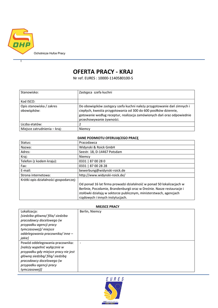 Ochotnicze Hufce Pracy l OFERTA PRACY - KRAJ Nr ref. EURES : 10000-1140580100-S Stanowisko: Kod ISCO: Opis stanowiska / zakres obowiązków: Liczba etatów: Miejsce zatrudnienia – kraj: Status: Nazwa: Adres: Kraj: Telefon (z kodem kraju): Fax: E-mail: Strona internetowa: Krótki opis działalności gospodarczej: Zastępca szefa kuchni Do obowiązków zastępcy szefa kuchni należy przygotowanie dań zimnych i ciepłych, kwestia przygotowania od 300 do 600 posiłków dziennie, gotowanie według receptur, realizacja zamówionych dań oraz odpowiednie przechowywanie żywności. 2 Niemcy DANE PODMIOTU OFERUJĄCEGO PRACĘ Pracodawca Widynski & Roick GmbH Seestr. 18, D-14467 Potsdam Niemcy 0331 | 87 00 28 0 0331 | 87 00 28 28 [email protected] http://www.widynski-roick.de/ Od ponad 16 lat firma prowadzi działalność w ponad 50 lokalizacjach w Berlinie, Poczdamie, Brandenburgii oraz w Dreźnie. Nasze restauracje i stołówki działają w sektorze publicznym, ministerstwach, agencjach rządowych i innych instytucjach. Lokalizacja: [siedziba główna/ filia/ siedziba pracodawcy docelowego (w przypadku agencji pracy tymczasowej)/ miejsce oddelegowania pracownika/ inne – jakie] Powód oddelegowania pracownika: [należy wypełnić wyłącznie w przypadku gdy miejsce pracy nie jest główną siedzibą/ filią/ siedzibą pracodawcy docelowego (w przypadku agencji pracy tymczasowej)] MIEJSCE PRACY Berlin, Niemcy - Ochotnicze Hufce Pracy l Wykształcenie: Doświadczenie zawodowe: Znajomość języków: Uprawnienia/dyplomy/ dokumenty (np. prawo jazdy): Inne istotne wymagania: WYMAGANIA Gastronomiczne Wymagany staż w zawodzie kucharza lub wieloletnie doświadczanie w zawodzie. Język: niemiecki Poziom: dobry Wymagane jest również doświadczenie w stołówce w planowaniu menu, zakupie składników i kalkulacji kosztów oraz umiejętność obsługi komputera. Mile widziane prawo jazdy. Komunikatywność i zaangażowanie WYNAGRODZENIE I WARUNKI ZATRUDNIENIA Wysokość pensji brutto: 1900 EURO Waluta, w jakiej wypłacana jest pensja: EURO Rodzaj stawki wynagrodzenia: Stawka miesięczna (godzinowa/ tygodniowa/ miesięczna/ roczna/ inna) Dodatkowe świadczenia: zakwaterowanie, Pracodawca oferuje odzież roboczą, obuwie robocze i posiłki. wyżywienie, koszty dojazdów itp. Nazwa firmy, z którą zostanie podpisana Widynski & Roick GmbH umowa: Rodzaj umowy: Umowa o pracę na czas określony. (umowa o pracę, umowa zlecenia, wolontariat, praktyka zawodowa/ staż, praca zdalna, agencja pracy tymczasowej, inne): Wymiar czasu pracy: Pełny etat. (praca na pełen etat/ część etatu): Praca od poniedziałku do piątku, zwykle weekendy i święta są dniami wolnymi od pracy. Czas trwania umowy: od 01.09.2016 do 14.07.2017 Liczba godzin tygodniowo: 40 godzin tygodniowo Data rozpoczęcia: Do uzgodnienia z pracodawcą. Wymagane dokumenty (list motywacyjny, CV itp.): SPOSÓB SKŁADANIA WNIOSKU CV ze zdjęciem z pełnymi danymi kontaktowymi oraz poziomem znajomości języka niemieckiego, dokumenty potwierdzające kwalifikacje oraz list motywacyjny Język niemiecki Język, w którym muszą być sporządzone przedkładane dokumenty: Do kogo należy wysłać dokumenty: (do pracodawcy/ doradcy EURES) Gdzie należy wysłać dokumenty: (adres, adres e-mail, nr faksu z kodem kraju itp.) Kandydaci proszeni są o przesyłanie aplikacji do doradcy EURES z Podlaskiej Wojewódzkiej Komendy OHP w Białymstoku e-mail:[email protected] W tytule maila proszę wpisać: zastępca szefa kuchni, Berlin, Niemcy Podlaska WK OHP w Białymstoku ul. Pozioma 4 Ochotnicze Hufce Pracy l 15-558 Białystok DODATKOWE INFORMACJE WAŻNOŚĆ 02.08.2016 Data publikacji: Termin przedkładania podań o pracę / zakończenia ważności oferty: 31.08.2016 Uprzejmie informujemy, że skontaktujemy się wyłącznie z wybranymi kandydatami. UWAGA: 1. Umowa z zagranicznym pracodawcą zostanie zawarta zgodnie z prawem kraju zatrudnienia. Oznacza to, że wszystkie roszczenia odnośnie do warunków, które obejmuje umowa, można kierować wyłącznie do odpowiedniego sądu w kraju zatrudnienia. Ochotnicze Hufce Pracy (w ramach EURES) nie mogą pośredniczyć ani reprezentować pracownika w sądzie kraju zatrudnienia w przypadku sporu z pracodawcą. 2. Ochotnicze Hufce Pracy (w ramach EURES) dokładają wszelkich starań, aby zapewnić rzetelność i wiarygodność ofert pracy zgłoszonych w WK OHP. Należy wyjaśnić, że oferta pracy została zgłoszona przez stronę trzecią i EURES nie odpowiada za ewentualne rozbieżności między warunkami pracy określonymi w ofercie pracy i warunkami oferowanymi przez potencjalnego pracodawcę. 3. Ochotnicze Hufce Pracy (w ramach EURES) informują, że będą zbierać, przetwarzać i przekazywać potencjalnym pracodawcom zgodnie z przepisami dotyczącymi ochrony danych osobowych wszystkie dane osobowe dostarczone przez osoby poszukujące pracy.