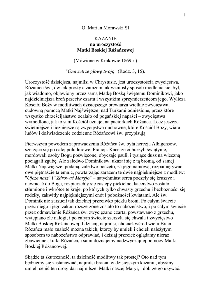 1 O. Marian Morawski SI KAZANIE na uroczystość Matki Boskiej Różańcowej (Mówione w Krakowie 1869 r.) "Ona zetrze głowę twoją" (Rodz. 3, 15). Uroczystość dzisiejsza, najmilsi w Chrystusie, jest uroczystością zwycięstwa. Różaniec św., ów tak prosty a zarazem tak wzniosły sposób modlenia się, był, jak wiadomo, objawiony przez samą Matkę Boską świętemu Dominikowi, jako najdzielniejsza broń przeciw czartu i wszystkim sprzymierzeńcom jego. Wylicza Kościół Boży w modlitwach dzisiejszego brewiarza wielkie zwycięstwa, cudowną pomocą Matki Najświętszej nad Turkami odniesione, przez które wszystko chrześcijaństwo ocalało od pogańskiej napaści – zwycięstwa wymodlone, jak to sam Kościół uznaje, na paciorkach Różańca. Lecz jeszcze świetniejsze i liczniejsze są zwycięstwa duchowne, które Kościół Boży, wiara ludów i doświadczenie codzienne Różańcowi św. przypisują. Pierwszym powodem zaprowadzenia Różańca św. była herezja Albigensów, szerząca się po całej południowej Francji. Kacerze ci burzyli świątynie, mordowali osoby Bogu poświęcone, obyczaje psuli, i tysiące dusz na wieczną pociągali zgubę. Ale zaledwo Dominik św. ukazał się z tą bronią, od samej Matki Najświętszej podaną, zaledwo poczęto, za jego namową, rozpamiętywać owe piętnaście tajemnic, powtarzając zarazem te dwie najpiękniejsze z modlitw: "Ojcze nasz" i "Zdrowaś Maryjo" – natychmiast serca poczęły się kruszyć i nawracać do Boga, rozpierzchły się zastępy piekielne, kacerstwo zostało stłumione i wkrótce te kraje, po których tylko chwasty grzechu i bezbożności się rodziły, zakwitły najpiękniejszymi cnót i pobożności kwiatami. Ale św. Dominik nie zarzucił tak dzielnej przeciwko piekłu broni. Po całym świecie przez niego i jego zakon rozszerzone zostało to nabożeństwo, i po całym świecie przez odmawianie Różańca św. zwyciężano czarta, powstawano z grzechu, wytępiano złe nałogi; i po całym świecie szerzyła się chwała i zwycięstwo Matki Boskiej Różańcowej. I dzisiaj, najmilsi, chociaż wśród wielu Braci Różańca mało znaleźć można takich, którzy by umieli i chcieli należytym sposobem to nabożeństwo odprawiać, i dzisiaj przecież oglądamy nieraz zbawienne skutki Różańca, i sami doznajemy nadzwyczajnej pomocy Matki Boskiej Różańcowej. Skądże ta skuteczność, ta dzielność modlitwy tak prostej? Oto nad tym będziemy się zastanawiać, najmilsi bracia, w dzisiejszym kazaniu, abyśmy umieli cenić ten drogi dar najmilszej Matki naszej Maryi, i dobrze go używać. 2 Bo nic tak bardzo Matki nie cieszy, jak gdy widzi, że dzieci jej odnoszą z jej darów całą korzyść, której im życzy macierzyńskie Serce. Zacznijmy więc od nabożnego "Zdrowaś Maryjo". Najświętsza Panna – mówi Kościół w dzisiejszych modlitwach brewiarza – pobudziła Dominika św. do tego, aby ludziom zalecał Różaniec, jako broń szczególną przeciw błędom i występkom. Takie zalecenie Kościoła św. i samej Matki Boskiej, wystarcza, sądzę, abyśmy wierzyli, że Różaniec musi posiadać szczególną przeciwko występkom skuteczność, a tym samym żebyśmy niezmiernie cenili ten dar, tak jak chory ceni sobie skuteczne lekarstwo, jak podsądny ceni sobie sposób uniewinnienia się. Ale zastanówmy się teraz, szukajmy, przy pomocy Bożej, na czym zależeć może ta szczególna skuteczność tego środka. Aby zwyciężyć namiętności, oprzeć się grzechom, dwie rzeczy są potrzebne: a) prosić o pomoc niebieską, b) i samemu serce swe przeciw występkom uzbrajać. Otóż obie te rzeczy znajdujemy w Różańcu świętym. I. Trzeba prosić, mówię, o pomoc Boską pokornie, stale, ufnie, serdecznie; bo jeżeli kiedy potrzebujemy pomocy Boskiej, jeżeli kiedy sami sobie jesteśmy niedostateczni, to iście najbardziej, gdy walczymy z namiętnością, albo gdy już w grzech popadłszy, powstać usiłujemy. Modli się żeglarz na morzu, gdy straszna burza nim miota; modli się żołnierz, gdy gwiżdżą mu wkoło głowy kule; modli się rolnik, gdy gradowa chmura rozpościera się nad jego żniwem. A chrześcijanin, gdy mu zagraża najstraszniejsze ze wszystkich nieszczęść, gdy widzi się w niebezpieczeństwie obrażenia Boga, utracenia Jego łaski, zgubienia duszy swej na wieki, mógłby w tej okropnej chwili nie błagać o pomoc, nie westchnąć do Boga? Pytam was, najmilsi, jeżeli kto nie modli się, aby uniknął grzechu, jeśli nie prosi o to przynajmniej tak szczerze, jak o uniknienie doczesnego niedostatku lub słabości ciała, jeśli nawet w pokusie zaniedbuje uciekać się do Boga – za cóż on ma duszę swoją i Boga? czy może się skarżyć na swą słabość, na pokusy, na okazje? czy ma prawo się dziwić, że go Bóg w tym życiu ciężko za jego grzechy karze, a w tamtym na wieki od siebie odrzuci? Jeśli więc chcemy zwyciężyć grzech, trzeba się o to modlić. Trzeba się modlić – tak nas uczy własne doświadczenie naszej słabości, naszej nędzy, naszych upadków. Trzeba się modlić – tak nas uczy Pismo święte. "Rozumiałem, mówi Mędrzec Pański, że nie mogłem być powściągliwym, jak tylko gdy Bóg da" (Mądr. 8, 21); Bóg zaś tylko proszącym daje: "Proście, a będzie wam dano" (Mt. 7, 7). I sam Pan Jezus przestrzega: "Czuwajcie i módlcie się, abyście nie weszli w pokuszenie". Trzeba się modlić nie jak dla zbycia, lecz z całego serca, z 3 ufnością, z wytrwałością; bo te są, jak wiemy z katechizmu, warunki, które mieć ma modlitwa, aby była wysłuchana. Otóż Różaniec jest przede wszystkim najdoskonalszą modlitwą, którą sobie pomoc Boską wyprosić możemy. Wstępem do niej jest wyznanie wiary w Składzie Apostolskim, bo wiara jest początkiem i podstawą modlitwy. Potem piętnaście razy rozpoczynamy jakby na nowo od Modlitwy Pańskiej, owego wzoru modlitw, którego sam Bóg wcielony ludzi nauczył, i w którym wszystkie prośb
