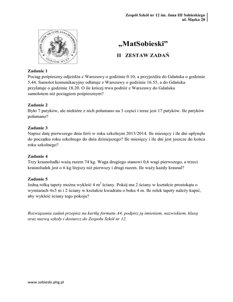 Zespół Szkół nr 12 im. Jana III Sobieskiego ul. Śląska 20 „MatSobieski” II ZESTAW ZADAŃ Zadanie 1 Pociąg pośpieszny odjeżdża z Warszawy o godzinie 0.10, a przyjeżdża do Gdańska o godzinie 5.44. Samolot komunikacyjny odlatuje z Warszawy o godzinie 16.55, a do Gdańska przylatuje o godzinie 18.20. O ile krócej trwa podróż z Warszawy do Gdańska samolotem niż pociągiem pośpiesznym? Zadanie 2 Było 7 patyków, ale niektóre z nich połamano na 3 części i teraz jest 17 patyków. Ile patyków połamano? Zadanie 3 Napisz datę pierwszego dnia ferii w roku szkolnym 2013/2014. Ile miesięcy i ile dni upłynęło do początku roku szkolnego do dnia dzisiejszego? Ile miesięcy i ile dni jest jeszcze do końca roku szkolnego? Zadanie 4 Trzy krasnoludki ważą razem 74 kg. Waga drugiego stanowi 0,6 wagi pierwszego, a trzeci krasnoludek jest o 6 kg lżejszy niż pierwszy i drugi razem. Ile waży każdy krasnal? Zadanie 5 Jedną rolką tapety można wykleić 4 m2 ściany. Pokój ma 2 ściany w kształcie prostokąta o wymiarach 4x5 m i 2 ściany w kształcie kwadratu o boku 4 m. Ile rolek tapety należy kupić, aby wykleić ściany tego pokoju? Rozwiązania zadań przepisz na kartkę formatu A4, podpisz ją imieniem, nazwiskiem, klasą oraz nazwą szkoły i dostarcz do Zespołu Szkół nr 12. www.sobieski.phg.pl