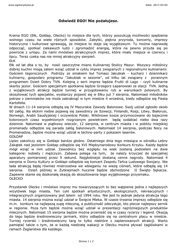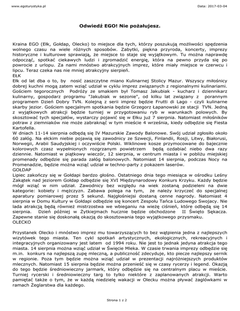 www.egoturystyka.pl Data: 2017-03-04 Odwiedź EGO! Nie pożałujesz. Kraina EGO (Ełk, Gołdap, Olecko) to miejsce dla tych, którzy poszukują możliwości spędzenia wolnego czasu na wiele różnych sposobów. Zabytki, piękna przyroda, koncerty, imprezy historyczne i kulturowe sprawiają, że miejsce to staje się wyjątkowym. Tu można naprawdę odpocząć, spotkać ciekawych ludzi i zgromadzić energię, która na pewno przyda się po powrocie z urlopu. Za nami mnóstwo atrakcyjnych imprez, które miały miejsce w czerwcu i lipcu. Teraz czeka nas nie mniej atrakcyjny sierpień. EŁK Ełk od lat dba o to, by nosić zaszczytne miano Kulinarnej Stolicy Mazur. Wszyscy miłośnicy dobrej kuchni mogą zatem wziąć udział w cyklu imprez związanych z regionalnymi kulinariami. Gościem tegorocznych Podróży ze smakiem był Tomasz Jakubiak - kucharz i dziennikarz kulinarny, gospodarz programu "Jakubiak w sezonie", od kilku lat związany z porannym programem Dzień Dobry TVN. Kolejną z serii imprez będzie Frutti di Lago - czyli kulinarne skarby jezior. Gościem specjalnym spotkania będzie Grzegorz Łapanowski ze stacji TVN. Jedną z wyjątkowych atrakcji będzie turniej w przygotowaniu ryb w warunkach polowych. By skosztować tych specjałów, wystarczy pojawić się w Ełku już 7 sierpnia. Natomiast miłośników potraw z ziemniaków nie może zabraknąć w tym mieście 4 września, kiedy odbędzie się Fiesta Kartofella. W dniach 11-14 sierpnia odbędą się IV Mazurskie Zawody Balonowe. Swój udział zgłosiło około 60 załóg. Na ełckim niebie pojawią się zawodnicy ze Szwecji, Finlandii, Rosji, Litwy, Białorusi, Norwegii, Arabii Saudyjskiej i oczywiście Polski. Wiklinowe kosze przymocowane do bajecznie kolorowych czasz wypełnionych rozgrzanym powietrzem będą ozdabiać niebo dwa razy dziennie. Natomiast w piątkowy wieczór, 12 sierpnia, w centrum miasta i w pobliżu miejskiej promenady odbędzie się parada załóg balonowych. Natomiast 14 sierpnia, podczas Nocy na Promenadzie, będzie można wziąć udział w techno-party z pokazem laserów. GOŁDAP Lipiec zakończy się w Gołdapi bardzo głośno. Ostatniego dnia tego miesiąca w ośrodku Leśny Zakątek nad jeziorem Gołdap odbędzie się XVI Międzynarodowy Konkurs Krzyku. Każdy będzie mógł wziąć w nim udział. Zawodnicy bez względu na wiek zostaną podzieleni na dwie kategorie: kobiety i mężczyzn. Zabawa polega na tym, że należy krzyczeć do specjalnej aparatury pomiarowej przez 5 sekund. Najgłośniejsi dostaną cenne nagrody. Natomiast 4 sierpnia w Domu Kultury w Gołdapi odbędzie się koncert Zespołu Tańca Ludowego Swojacy. Nie lada atrakcją będą również mistrzostwa we wbieganiu na wieżę ciśnień, które odbędą się 14 sierpnia. Dzień później w Żytkiejmach hucznie będzie obchodzone II Święto Sękacza. Zapewne stanie się doskonałą okazją do skosztowania tego wyjątkowego przysmaku. OLECKO Przystanek Olecko i mnóstwo imprez mu towarzyszących to bez wątpienia jedna z najlepszych wizytówek tego miasta. Ten cykl spotkań artystycznych, ekologicznych, rekreacyjnych i integracyjnych organizowany jest latem od 1994 roku. Nie jest to jednak jedyna atrakcja tego miasta. 14 sierpnia można wziąć udział w Święcie Mleka. W czasie trwania imprezy odbędzie się m.in. konkurs na najlepszą zupę mleczną, a publiczność zdecyduje, kto piecze najlepszy sernik w regionie. Poza tym będzie można wziąć udział w prezentacji najróżniejszych produktów mlecznych. Natomiast 15 sierpnia będzie można przenieść się w czasy rycerzy i legend. Okazją do tego będzie średniowieczny jarmark, który odbędzie się na centralnym placu w mieście. Turniej rycerski i średniowieczny targ to tylko niektóre z zaplanowanych atrakcji. Warto pamiętać także o tym, że w każdą niedzielę wakacji w Olecku można pływać żaglówkami w ramach Żeglarstwa dla każdego. Strona 1 z 2 www.egoturystyka.pl Data: 2017-03-04 Odwiedź EGO! Nie pożałujesz. Zapraszamy do Krainy EGO www.egoturystyka.pl [www.powiat.elk.pl] 09 - 08 - 2011 Administrator egoturystyka.pl Administrator Strona 2 z 2