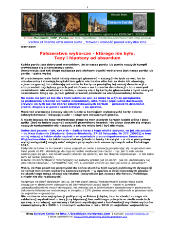 1 Strona Mancinelli_NMP_Polska na: http://jozefbizon.wordpress.com/mancinelli-nmp-polska/ Veritas et libertas ultra omnis sunto _ Prawda i wolność ponad wszystko inne Józef Bizoń Fałszerstwo wyborcze - którego nie było. Tezy i hipotezy ad absurdum Każda partia jest dobra pod warunkiem, że to nasza partia lub partie naszych kumpli wywodząca się z kanciastego stołu. Demokracja jest tak długo najlepsza pod słońcem dopóki wybierana jest nasza partia lub partie - patrz wyżej W przeciwnym razie ludzi należy nauczyć głosować – szczególnie tych ze wsi, bo to nieudacznicy i stawiają krzyżyki tam gdzie nie trzeba albo też za dużo ich stawiają, a jeszcze gorzej, bo zabierają oni sobie te karty na pamiątkę tej naszej demokracji – a to przecież najcięższy grzech pod słońcem – no i przeciw demokracji - bo z naszymi nazwiskami nie wiadomo co zrobią – znaczy się z tą kartą do głosowania z tymi naszymi nazwiskami. Mogą np. ją tam gdzieś przecież powiesić na nieodpowiedniej ścianie. No może nie jest aż tak źle z tymi ludźmi ze wsi, bo może to wójt ze sprzątaczką [o proboszczu przecież nie wolno wspominać], albo może i jego ludzie dostawiają krzyżyki na tych już raz dobrze zakrzyżykowanych kartach - przecież to dziecinnie proste; długopis w garść i szast krzyżyk - i po sprawie. Może też wyrzucają [znaczy się ich ludzie w komisjach wyborczych] karty dobrze zakrzyżykowane i wsypują puste – i stąd tyle nieważnych głosów. A może jeszcze do tego wszystkiego złego na tych pustych kartach ludzie wójta i jego spóła [boć to ludzie uczone] wstawili prawidłowo krzyżyk i do żłobu dostało się więcej naszych konkurentów niż naszych, a tak nie miało być i być nie może. Jedno jest pewne – tak, czy siak – będzie teraz z tego wielka zadyma, co już się zaczęło – bo Nasz Dziennik [Wydanie: Sobota-Niedziela, 27-28 listopada, Nr 277 (3903)] o tym mniej więcej w takim stylu napisał – w wywiadzie z euro-deputowanym Januszem Wojciechowskim - że takie bezeceństwa [chodzi o karty i krzyżyki - a nie o poczyniony wyżej wstępniak] mogły mieć miejsce przy wyborach samorządowych roku Pańskiego 2010. Zadymiarze tylko na to czekali i zaraz pognali po necie z sensacją podpierając się wypowiedziami Pana posła do PE i dokładając do tego od siebie niestworzone rzeczy – np. jak to robi osoba podpisująca się gen. Jan Grudniewski [znaczy się generał, ale nie stopnia wojskowego – o tak sobie sami od siebie generały]. Jeszcze inni korzystając z rozkręcającej się zadymy grzmią już po necie: jak np. podpisujący się jako Marek Chrapan: „ SZYKOWAĆ SIĘ !!!”, a wcześnie coś też on plótł po necie o „kałachach”. Myślę, że Pan poseł nie przemyślał do końca skutków tych swych publicznych dywagacji na temat minionych wyborów samorządowych – w oparciu o ilość nieważnych głosów bo skutki tego mogą okazać się fatalne [oczywiście jak zawsze dla Narodu Polskiego, a nigdy nie dla rządzących]. Najgorsze na dzień dzisiejszy jest to, że Pan poseł Janusz Wojciechowski bardzo lecce sobie dywaguje w absolutnym oderwaniu od elementarnych zasad logiki – nawet w zakresie uprawdopodobnienia swych dywagacji, nie mówiąc już o jakimkolwiek uzasadnionym podejrzeniu dokonania fałszerstwa wyborczego w związku z 12% głosów nieważnych oddanych w głosowaniach do sejmików województw. Nie można w obecnej sytuacji politycznej w Polsce [chyba, że o to chodzi – czego nie zakładam] wyskakiwać z tezą [czy hipotezą] bez solidnego pokrycia w okolicznościach sprawy, a co więcej sprzeczną z faktami wynikającymi z konfrontacji wyników wyborów samorządowych z 2006 r. i obecnych wyborów z roku 2010 do sejmików województw. Blog Sursum Corda na http://jozefbizon.wordpress.com | Kontakt: [email protected] z także uprzednio na: http://www.propolonia.pl/blog.php?bid=142 2 Pana poseł Janusza Wojciechowski [na tle ilości głosów nieważnych do sejmików w wysokości 12%] publicznie rzekł: „Stawiam hipotezę, że wybory samorządowe mogły zostać sfałszowane. Wskazuje na to zdumiewająca liczba prawie 2 milionów głosów nieważnych. Niewykluczone, że ktoś je unieważniał już po głosowaniu.” Rzecz w tym, że ta teza [hipoteza] jest z gruntu fałszywa – o tym mowa jest niżej - a co gorsza niezmiernie szkodliwą – mogącą doprowadzić do nieprzewidywalnych zachowań ludzi i niemożliwych do opanowania zwykłymi środkami. Zaś udział „Naszego Dziennika” w nagłośnieniu tej absurdalnej tezy w wydaniu sobotnioniedzielnym [największa poczytność w tym okresie czasu] pozwala – również i w oparciu o jego dotychczasowy kurs - na publiczne postawienie pytania: „nasz” to znaczy konkretnie czyj jest ten „Nasz Dziennik”? I w pytaniu tym pomijam ludzi zwiedzionych – co powinno być oczywiste. Wykonanie zestawienia wyników wyborów samorządowych roku 2006 i roku 2010 [w szczególność w odniesieniu do sejmików wojewódzkich, ale i nie tylko] w sposób oczywisty zaraz na wstępie przeczy stawianej tezie przez Pana posła J. Wojciechowskiego. Więcej analiza porównawcza wyników roku 2006 i roku 2010 ukazuje pewną stałą już w czasie zależność przejawiającą się właśnie w liczbie głosów nieważnych – i nie jest bynajmniej winą ludzi [szczególnie tych ze wsi] nieumiejących stawiać krzyżyki na kartach do głosowania. Ludziska umieją Panie pośle stawiać te krzyżyki . Aby się o tym przekonać wystarczy prześledzić wyniki głosowań do Sejmu i Senatu RP z kolejnych poprzednich wyborów /ok. 3% nieważnych głosów/. No i nie pierwszy raz ludzie te krzyżyki stawiają na kartach, a potem władza już po wyborach kładzie krzyżyk na tych ludziach – i tak do następnych wyborów. Nie jest to też wynikiem działania jakichś wrażych sił - chyba, że za takowe wraże siły uznamy właśnie takie świadome zachowanie się wyborcó