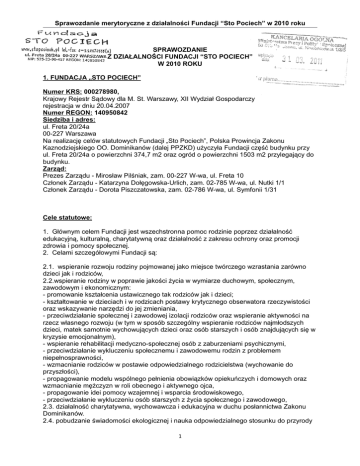 Sprawozdanie merytoryczne z działalności Fundacji “Sto Pociech” w 2010 roku SPRAWOZDANIE Z DZIAŁALNOŚCI FUNDACJI “STO POCIECH” W 2010 ROKU 1. FUNDACJA „STO POCIECH” Numer KRS: 000278980, Krajowy Rejestr Sądowy dla M. St. Warszawy, XII Wydział Gospodarczy rejestracja w dniu 20.04.2007 Numer REGON: 140950842 Siedziba i adres: ul. Freta 20/24a 00-227 Warszawa Na realizację celów statutowych Fundacji „Sto Pociech”, Polska Prowincja Zakonu Kaznodziejskiego OO. Dominikanów (dalej PPZKD) użyczyła Fundacji część budynku przy ul. Freta 20/24a o powierzchni 374,7 m2 oraz ogród o powierzchni 1503 m2 przylegający do budynku. Zarząd: Prezes Zarządu - Mirosław Pilśniak, zam. 00-227 W-wa, ul. Freta 10 Członek Zarządu - Katarzyna Dołęgowska-Urlich, zam. 02-785 W-wa, ul. Nutki 1/1 Członek Zarządu - Dorota Piszczatowska, zam. 02-786 W-wa, ul. Symfonii 1/31 Cele statutowe: 1. Głównym celem Fundacji jest wszechstronna pomoc rodzinie poprzez działalność edukacyjną, kulturalną, charytatywną oraz działalność z zakresu ochrony oraz promocji zdrowia i pomocy społecznej. 2. Celami szczegółowymi Fundacji są: 2.1. wspieranie rozwoju rodziny pojmowanej jako miejsce twórczego wzrastania zarówno dzieci jak i rodziców, 2.2.wspieranie rodziny w poprawie jakości życia w wymiarze duchowym, społecznym, zawodowym i ekonomicznym: - promowanie kształcenia ustawicznego tak rodziców jak i dzieci; - kształtowanie w dzieciach i w rodzicach postawy krytycznego obserwatora rzeczywistości oraz wskazywanie narzędzi do jej zmieniania, - przeciwdziałanie społecznej i zawodowej izolacji rodziców oraz wspieranie aktywności na rzecz własnego rozwoju (w tym w sposób szczególny wspieranie rodziców najmłodszych dzieci, matek samotnie wychowujących dzieci oraz osób starszych i osób znajdujących się w kryzysie emocjonalnym), - wspieranie rehabilitacji medyczno-społecznej osób z zaburzeniami psychicznymi, - przeciwdziałanie wykluczeniu społecznemu i zawodowemu rodzin z problemem niepełnosprawności, - wzmacnianie rodziców w postawie odpowiedzialnego rodzicielstwa (wychowanie do przyszłości), - propagowanie modelu wspólnego pełnienia obowiązków opiekuńczych i domowych oraz wzmacnianie mężczyzn w roli obecnego i aktywnego ojca, - propagowanie idei pomocy wzajemnej i wsparcia środowiskowego, - przeciwdziałanie wykluczeniu osób starszych z życia społecznego i zawodowego, 2.3. działalność charytatywna, wychowawcza i edukacyjna w duchu posłannictwa Zakonu Dominikanów. 2.4. pobudzanie świadomości ekologicznej i nauka odpowiedzialnego stosunku do przyrody 1 Sprawozdanie merytoryczne z działalności Fundacji “Sto Pociech” w 2010 roku i środowiska naturalnego, kształtowanie postaw działania zgodnie z zasadą zrównoważonego rozwoju. 2. ZASADY, FORMY I ZAKRES DZIAŁALNOŚCI STATUTOWEJ FUNDACJI “STO POCIECH” W 2010 2.1. W RAMACH DZIAŁALNOŚCI STATUTOWEJ W 2010 ROKU FUNDACJA REALIZOWAŁA NASTĘPUJĄCE PROJEKTY: 2.1.1. PROJEKT “STO POCIECH - MIEJSCE WCZESNEJ PROFILAKTYKI I INTEGRACJI. ZANIM MAŁE PROBLEMY STANĄ SIĘ WILEKIMI PROBLEMAMI SPOŁECZNYMI” Warsztaty, wykłady, spotkania oraz oferta konsultacyjna wspierająca rozwój najmłodszych dzieci (od 0 do 4 lat) oraz wzmacniająca rodziców w postawie odpowiedzialnego rodzicielstwa. Zajęcia pomyślane tak, by w ich trakcie dzieci były wraz z rodzicami. Działania realizowane w ramach Klubiku Maluchów i Rodziców „Sto Pociech”. Cele: wspieranie rozwoju rodziny pojmowanej jako miejsce twórczego wzrastania zarówno dzieci, jak i rodziców; wczesna profilaktyka ukierunkowana na prawidłowy rozwój emocjonalny, społeczny i osobowy dziecka; kształtowanie prawidłowej komunikacji interpersonalnej rodzic-dziecko; kształtowanie dobrej relacji między rodzicami; zapobieganie wszelkim dysfunkcjom, które pojawiają się w rodzinach z maluchami. Realizacja: Kontynuacja projektu realizowanego od momentu założenia Fundacji. styczeń – czerwiec 2010 we wtorki i czwartki wrzesień - grudzień 2010 od poniedziałku do soboty W ramach projektu zrealizowano: a) cykle warsztatowe dla najmłodszych dzieci i i ich rodziców: Maluchy, raki, pełzaki - grupy zabawowe dla najmłodszych dzieci (6-18 miesięcy) umożliwiające maluchom odkrywanie i poznanie otaczającego świata oraz ćwiczenie nowych umiejętności w przestrzeni stymulującej zmysły i w towarzystwie rówieśników. Realizacja: 68 warsztatów Liczba uczestników warsztatów – ok. 984 dzieci i ich rodziców Czuję, patrzę, słucham - grupy zabawowe dla maluchów (18 -36 miesięcy) pomyślane tak, aby poprzez ukierunkowaną zabawę jak najefektywniej stymulować rozwój dziecka (m.in. koordynację wzrokowo - ruchową, inteligencję emocjonalną i muzyczną). Realizacja: 91 warsztatów Liczba uczestników warsztatów – ok. 1032 dzieci i ich rodziców Brykanki, przewalanki - grupy zabawowe dla maluchów (18-36 miesięcy) umożliwiające dzieciom radosną zabawę poprzez ćwiczenia ruchowo-przestrzenne (z zakresu motoryki dużej) i proste zadania plastyczne (ćwiczenia z zakresu motoryki małej), zaś rodzicom podpowiadające, jak w przestrzeni domowej wspierać rozwój dziecka poprzez zabawę. Realizacja: 56 warsztatów, Liczba uczestników warsztatów – ok. 600 dzieci i ich rodziców Śpiewanki, tańcowanki – warsztaty muzyczno-ruchowe dla dzieci (1,5 -3 lata) przy muzyce granej na żywo, metodycznie odwołujące się do choreoterapii oraz kinezjologii edukacyjnej. Realizacja: 10 warsztatów Liczba uczestników warsztatów – ok. 300 dzieci i ich rodziców 2 Sprawozdanie merytoryczne z działalności Fundacji “Sto Pociech” w 2010 roku Czytanie na dywanie – warsztaty literacko-plastyczne dla najmłodszych miłośników książek (2,5-4 lata). Realizacja:19 warsztatów Liczba uczestników warsztatów – ok. 245 dzieci i ich rodziców Zabawy z dźwiękiem - warsztaty muzyczne dla dzieci (1,5-3 lata) rozbudzające i 
