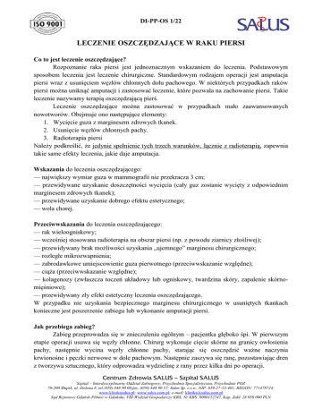 DI-PP-OS 1/22 LECZENIE OSZCZĘDZAJĄCE W RAKU PIERSI Co to jest leczenie oszczędzające? Rozpoznanie raka piersi jest jednoznacznym wskazaniem do leczenia. Podstawowym sposobem leczenia jest leczenie chirurgiczne. Standardowym rodzajem operacji jest amputacja piersi wraz z usunięciem węzłów chłonnych dołu pachowego. W niektórych przypadkach raków piersi można uniknąć amputacji i zastosować leczenie, które pozwala na zachowanie piersi. Takie leczenie nazywamy terapią oszczędzającą pierś. Leczenie oszczędzające można zastosować w przypadkach mało zaawansowanych nowotworów. Obejmuje ono następujące elementy: 1. Wycięcie guza z marginesem zdrowych tkanek. 2. Usunięcie węzłów chłonnych pachy. 3. Radioterapia piersi Należy podkreślić, że jedynie spełnienie tych trzech warunków, łącznie z radioterapią, zapewnia takie same efekty leczenia, jakie daje amputacja. Wskazania do leczenia oszczędzającego: — największy wymiar guza w mammografii nie przekracza 3 cm; — przewidywane uzyskanie doszczętności wycięcia (cały guz zostanie wycięty z odpowiednim marginesem zdrowych tkanek); — przewidywane uzyskanie dobrego efektu estetycznego; — wola chorej. Przeciwwskazania do leczenia oszczędzającego: — rak wieloogniskowy; — wcześniej stosowana radioterapia na obszar piersi (np. z powodu ziarnicy złośliwej); — przewidywany brak możliwości uzyskania „ujemnego” marginesu chirurgicznego; — rozległe mikrozwapnienia; — zabrodawkowe umiejscowienie guza pierwotnego (przeciwwskazanie względne); — ciąża (przeciwwskazanie względne); — kolagenozy (zwłaszcza toczeń układowy lub ogniskowy, twardzina skóry, zapalenie skórnomięśniowe); — przewidywany zły efekt estetyczny leczenia oszczędzającego. W przypadku nie uzyskania bezpiecznego marginesu chirurgicznego w usuniętych tkankach konieczne jest poszerzenie zabiegu lub wykonanie amputacji piersi. Jak przebiega zabieg? Zabieg przeprowadza się w znieczuleniu ogólnym – pacjentka głęboko śpi. W pierwszym etapie operacji usuwa się węzły chłonne. Chirurg wykonuje cięcie skórne na granicy owłosienia pachy, następnie wycina węzły chłonne pachy, starając się oszczędzić ważne naczynia krwionośne i pęczki nerwowe w dole pachowym. Następnie zaszywa się ranę, pozostawiając dren z tworzywa sztucznego, który odprowadza wydzielinę z rany przez kilka dni po operacji. Centrum Zdrowia SALUS – Szpital SALUS Szpital – Interdyscyplinarny Oddział Zabiegowy, Przychodnia Specjalistyczna, Przychodnie POZ 76-200 Słupsk, ul. Zielona 8, tel./059) 848 90 00,fax. (059) 848 90 57; Salus Sp. z o.o., NIP: 839-27-53-401; REGON: 771478724; www.klinikasalus.pl; www.salus.com.pl; e-mail: [email protected] Sąd Rejonowy Gdańsk-Północ w Gdańsku, VIII Wydział Gospodarczy KRS; Nr KRS: 0000152747, Kap. Zakł. 28 050 000 PLN DI-PP-OS 1/22 W drugim etapie operacji usuwa się guz. Cięcie skórne wykonuje się nad guzem, usuwa się go z marginesem około 1-2 cm tkanek zdrowych, po czym zaszywa się ranę, najczęściej pozostawiając w niej sączek gumowy, w celu odprowadzania wydzieliny z rany. Niekiedy zakładany jest opatrunek uciskowy z bandaża elastycznego. Tkanki usunięte podczas zabiegu badane są później histopatologicznie, a wyniki badania gotowe są w przeciągu 3-4 tygodni. Przebieg pooperacyjny. Po zabiegu operacyjnym pacjentka najczęściej powraca na swoją salę, jedynie w wyjątkowej sytuacji wymagać może dłuższego pobytu na sali pooperacyjnej. Po zbiegu pacjentami opiekuje się pielęgniarka dyżurna, do niej należy zwracać się w przypadku dolegliwości, bólów, chęci wstania z łóżka itp. Ponadto w oddziale szpitalnym jest lekarz dyżurny, który interweniuje w nagłych przypadkach. W przypadkach niepowikłanych pacjentka może pić i jeść już w ciągu pierwszych 24 godzin po zabiegu operacyjnym Następnego dnia po operacji pacjentka powinna zacząć siadać na łóżku, a następnie wstawać i chodzić, choć zwykle pierwszy spacer po zabiegu powinien odbyć się pod opieką pielęgniarki lub członka rodziny. Ponadto już w tym dniu należy rozpoczynać ćwiczenia rehabilitacyjne w celu usprawniania kończyny górnej. Pobyt w szpitalu po operacji trwa zazwyczaj 3-4 doby. Codziennie odbywa się wizyta chirurga, który przeprowadzał zabieg, zmieniane są opatrunki i kontrolowany jest przebieg gojenia się rany. Przed wyjściem do domu najczęściej usuwany jest dren z rany pooperacyjnej, choć zdarza się, że pacjentki wypisywane są do domu z drenem i jest on usuwany w poradni ambulatoryjnie. W takim przypadku pacjentka jest instruowana, jak obchodzić się z drenem w domu. W dniu wypisu pacjentka otrzymuje kartę informacyjną, recepty na potrzebne leki, dodatkowe ustne zalecenia od operatora oraz w razie potrzeby zwolnienie z pracy. Ponadto skierowanie do poradni rehabilitacyjnej w celu kontynuowania procesu rehabilitacji. Ma też wyznaczony termin kontrolnej wizyty u lekarza, który ją operował. Jak postępować po wyjściu ze szpitala? Przed operacją pacjentka powinna zapewnić sobie transport do domu – nie powinna prowadzić samochodu ani jechać środkami transportu publicznego. Powinna mieć zapewnioną opiekę bliskich w ciągu pierwszej doby po wypisaniu. Należy zrealizować przepisane recepty i przyjmować leki zgodnie z zaleceniami lekarza. Opatrunki należy zmieniać codziennie przemywając rany środkami odkażającymi (woda utleniona, octenisept, spirytus) i utrzymywać je w czystości. Można brać prysznic obmywając okolicę ran delikatnie i osuszać ją po kąpieli czystym ręcznikiem. W przypadku zaczerwienienia, bólu i obrzęku rany pooperacyjnej oraz gorączki, należy skontaktować się z lekarzem. Po około 9-10 dniach w poradni chirurgicznej zdejmuje się szwy i kontroluje gojenie. Regułą jest, że po usunięciu drenu, w ranie zbiera się płyn surowiczy, który co kilka dni Centrum Zdrowia SALUS – Szpital 