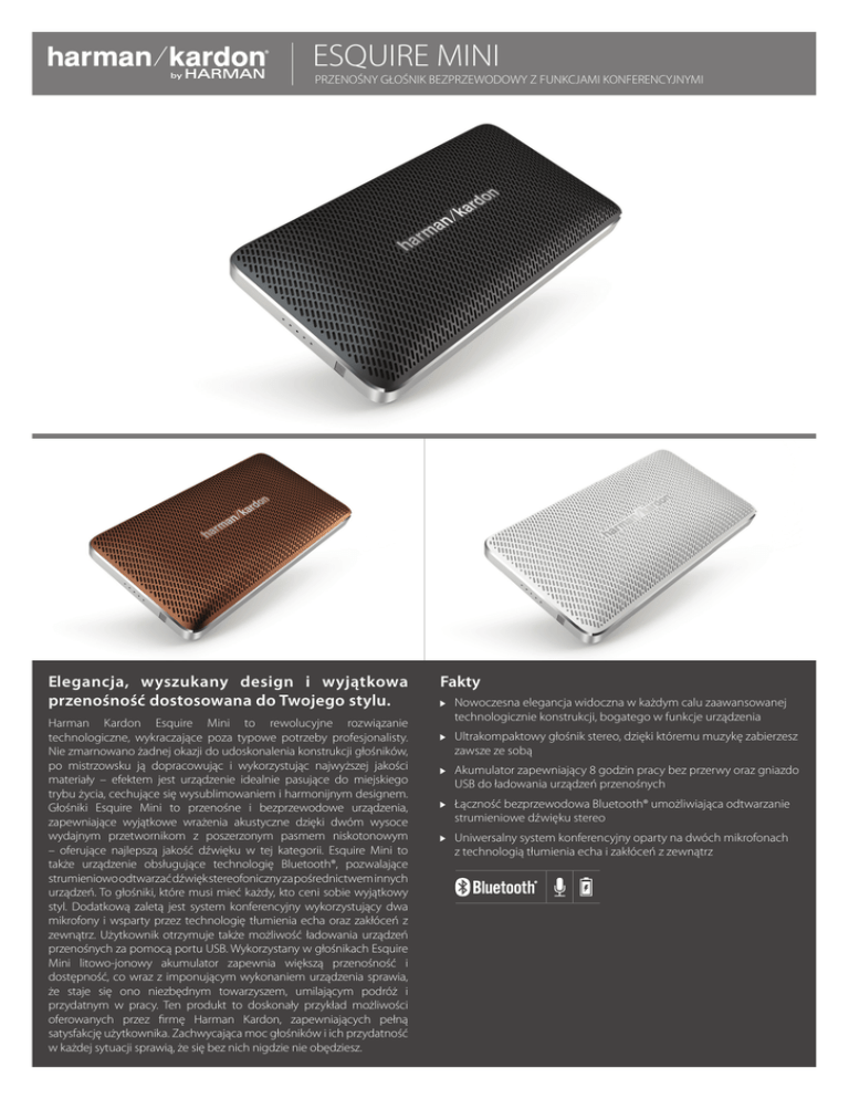 ESQUIRE MINI PRZENOŚNY GŁOŚNIK BEZPRZEWODOWY Z FUNKCJAMI KONFERENCYJNYMI Elegancja, wyszukany design i wyjątkowa przenośność dostosowana do Twojego stylu. Harman Kardon Esquire Mini to rewolucyjne rozwiązanie technologiczne, wykraczające poza typowe potrzeby profesjonalisty. Nie zmarnowano żadnej okazji do udoskonalenia konstrukcji głośników, po mistrzowsku ją dopracowując i wykorzystując najwyższej jakości materiały – efektem jest urządzenie idealnie pasujące do miejskiego trybu życia, cechujące się wysublimowaniem i harmonijnym designem. Głośniki Esquire Mini to przenośne i bezprzewodowe urządzenia, zapewniające wyjątkowe wrażenia akustyczne dzięki dwóm wysoce wydajnym przetwornikom z poszerzonym pasmem niskotonowym – oferujące najlepszą jakość dźwięku w tej kategorii. Esquire Mini to także urządzenie obsługujące technologię Bluetooth®, pozwalające strumieniowo odtwarzać dźwięk stereofoniczny za pośrednictwem innych urządzeń. To głośniki, które musi mieć każdy, kto ceni sobie wyjątkowy styl. Dodatkową zaletą jest system konferencyjny wykorzystujący dwa mikrofony i wsparty przez technologię tłumienia echa oraz zakłóceń z zewnątrz. Użytkownik otrzymuje także możliwość ładowania urządzeń przenośnych za pomocą portu USB. Wykorzystany w głośnikach Esquire Mini litowo-jonowy akumulator zapewnia większą przenośność i dostępność, co wraz z imponującym wykonaniem urządzenia sprawia, że staje się ono niezbędnym towarzyszem, umilającym podróż i przydatnym w pracy. Ten produkt to doskonały przykład możliwości oferowanych przez firmę Harman Kardon, zapewniających pełną satysfakcję użytkownika. Zachwycająca moc głośników i ich przydatność w każdej sytuacji sprawią, że się bez nich nigdzie nie obędziesz. Fakty Nowoczesna elegancja widoczna w każdym calu zaawansowanej technologicznie konstrukcji, bogatego w funkcje urządzenia Ultrakompaktowy głośnik stereo, dzięki któremu muzykę zabierzesz zawsze ze sobą Akumulator zapewniający 8 godzin pracy bez przerwy oraz gniazdo USB do ładowania urządzeń przenośnych Łączność bezprzewodowa Bluetooth® umożliwiająca odtwarzanie strumieniowe dźwięku stereo Uniwersalny system konferencyjny oparty na dwóch mikrofonach z technologią tłumienia echa i zakłóceń z zewnątrz ESQUIRE MINI PRZENOŚNY GŁOŚNIK BEZPRZEWODOWY Z FUNKCJAMI KONFERENCYJNYMI Nowoczesna elegancja widoczna w każdym calu zaawansowanej technologicznie konstrukcji, bogatego w funkcje urządzenia Szczotkowane aluminium, prawdziwa skóra i warstwa ceramiki pozwoliły stworzyć dzieło sztuki, oferujące niezwykłą moc i czystość dźwięków w najlepszym wydaniu – Esquire Mini to przenośne, kompleksowe akcesorium muzyczne, które może mówić samo za siebie. Ultrakompaktowy głośnik stereo, dzięki któremu muzykę zabierzesz zawsze ze sobą Esquire Mini firmy Harman Kardon jest niewielki i wytrzymały – stworzony do każdej podróży – gotowy zabrać Cię w miejsca, których jeszcze nie znasz. Zgrabna, harmonijna konstrukcja i najwyższej jakości materiały – w tym skórzana oprawa, aluminiowa obudowa i odporna na zarysowania kratka pokryta warstwą ceramiki – sprawią, że poczujesz się wyróżniony, jak mało kto. Zawartość zestawu: 1 bezprzewodowy głośnik Harman Kardon Esquire Mini 1 kabel USB Micro firmy Harman Kardon 1 arkusz informacji o produkcie 1 przewodnik szybkiego startu 1 skórzany pasek Dane techniczne • • • • • • • • • Akumulator zapewniający 8 godzin pracy bez przerwy oraz gniazdo USB do ładowania urządzeń przenośnych • Jeśli łączność bezprzewodowa jest priorytetem, to brak konieczności zasilania z sieci tym bardziej Ci się spodoba. Dzięki wbudowanemu akumulatorowi litowo-jonowemu Esquire Mini pozwala odtwarzać muzykę bezprzewodowo przez 8 godzin bez przerwy, a także ładować inne urządzenia przenośne za pomocą przydatnego portu USB. • • • • • Przetworniki: 2 × 27mm Moc znamionowa: 2 × 4W Pasmo przenoszenia: 180~20kHz Stosunek sygnał-szum: 80dB Typ akumulatora: litowo-polimerowy (3.7V, 2000mAh) Gniazdo Micro USB: 5V, 1.0A Gniazdo USB: 5V, 1.0A Mozliwości połączenia: Bluetooth®, Aux-in Czas odtwarzania muzyki: do 8h (zależnie od poziomu głośności i zawartości audio) Czas ładowania akumulatora: 3 do 5 h (zależy od ładowarki) Wymiary (szer × gł × wys): 140mm × 24mm × 75.4mm Waga: 238g Pasmo transmitera Bluetooth®: 2.402GHz~2.480GHz Moc transmitera Bluetooth®: 0~4dBm Modulacja transmitera Bluetooth®: GFSK, 8DPSK, _/4DQPSK Strumieniowe odtwarzanie dźwięku stereo przez Bluetooth® Zapewnij sobie w łatwy sposób nieprzerwaną łączność z ulubionymi urządzeniami i możliwość strumieniowego odtwarzania muzyki stereo dzięki technologii Bluetooth® Dzięki technologii bezprzewodowej słuchasz doskonale brzmiącej muzyki – odbierasz połączenie – i zaraz znowu wracasz do słuchania. Uniwersalny system konferencyjny oparty na dwóch mikrofonach z technologią tłumienia echa i zakłóceń z zewnątrz Bądź w kontakcie z każdym tak, jakby znajdował się w jednym pomieszczeniu z Tobą, za sprawą najwyższej jakości dźwięku i technologii tłumienia zakłóceń wbudowanej w zgrabną konstrukcję urządzenia Esquire Mini, zapewniającego 8 godzin pracy na baterii, a więc także komfort w razie niespodziewanej utraty zasilania. HARMAN International Industries, Incorporated 8500 Balboa Boulevard, Northridge, CA 91329 USA © 2014 HARMAN International Industries, Incorporated. Wszelkie prawa zastrzeżone. Znak i logo Bluetooth® to zastrzeżone znaki towarowe należące do firmy Bluetooth SIG, Inc. używane przez firmę HARMAN International Industries, Incorporated na podstawie licencji. Inne znaki towarowe i nazwy towarowe należą do odpowiednich właścicieli. Cechy, dane techniczne i wygląd produktu mogą ulec zmianie bez powiadomienia. www.harma
