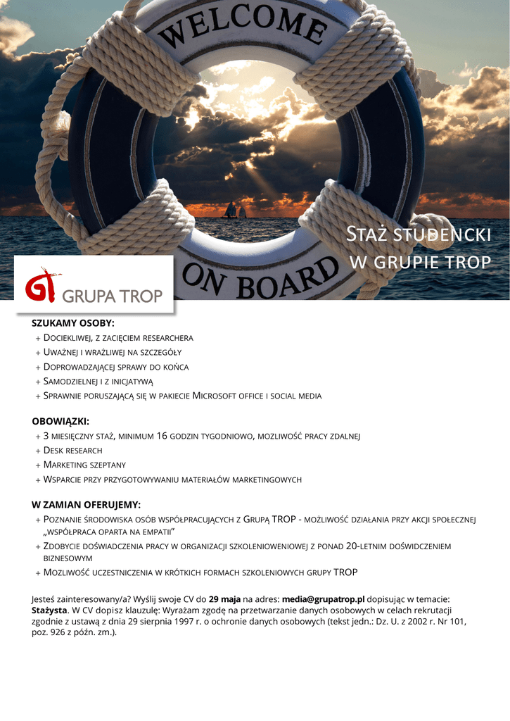 Staż studencki w grupie trop SZUKAMY OSOBY: DOCIEKLIWEJ, Z ZACIĘCIEM RESEARCHERA UWAŻNEJ I WRAŻLIWEJ NA SZCZEGÓŁY DOPROWADZAJĄCEJ SPRAWY DO KOŃCA SAMODZIELNEJ I Z INICJATYWĄ SPRAWNIE PORUSZAJĄCĄ SIĘ W PAKIECIE MICROSOFT OFFICE I SOCIAL MEDIA OBOWIĄZKI: 3 MIESIĘCZNY STAŻ, MINIMUM 16 GODZIN TYGODNIOWO, MOZLIWOŚĆ PRACY ZDALNEJ DESK RESEARCH MARKETING SZEPTANY WSPARCIE PRZY PRZYGOTOWYWANIU MATERIAŁÓW MARKETINGOWYCH W ZAMIAN OFERUJEMY: POZNANIE ŚRODOWISKA OSÓB WSPÓŁPRACUJĄCYCH Z GRUPĄ TROP - MOŻLIWOŚĆ DZIAŁANIA PRZY AKCJI SPOŁECZNEJ „WSPÓŁPRACA OPARTA NA EMPATII” ZDOBYCIE DOŚWIADCZENIA PRACY W ORGANIZACJI SZKOLENIOWENIOWEJ Z PONAD 20-LETNIM DOŚWIDCZENIEM BIZNESOWYM MOZLIWOŚĆ UCZESTNICZENIA W KRÓTKICH FORMACH SZKOLENIOWYCH GRUPY TROP Jesteś zainteresowany/a? Wyślij swoje CV do 29 maja na adres: [email protected] dopisując w temacie: Stażysta. W CV dopisz klauzulę: Wyrażam zgodę na przetwarzanie danych osobowych w celach rekrutacji zgodnie z ustawą z dnia 29 sierpnia 1997 r. o ochronie danych osobowych (tekst jedn.: Dz. U. z 2002 r. Nr 101, poz. 926 z późn. zm.).