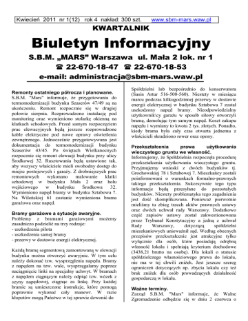 Kwiecień 2011 nr 1(12) rok 4 nakład: 300 szt. www.sbm-mars.waw.pl KWARTALNIK Biuletyn Informacyjny S.B.M. „MARS” Warszawa ul. Mała 2 lok. nr 1 22-670-18-47 22-670-18-53 e-mail: [email protected] Remonty ostatniego półrocza i planowane. S.B.M. "Mars" informuje, że przygotowania do termomodernizacji budynku Szaserów 47/49 są na ukończeniu. Remont rozpocznie się w drugiej połowie sierpnia. Rozprowadzono instalację pod monitoring oraz wymieniono stolarkę okienną na klatkach schodowych. Przed samym rozpoczęciem prac elewacyjnych będą jeszcze rozprowadzone kable elektryczne pod nowe oprawy oświetlenia zewnętrznego. Jednocześnie przygotowywana jest dokumentacja do termomodernizacji budynku Szaserów 43/45. Po świętach Wielkanocnych rozpocznie się remont elewacji budynku przy ulicy Środkowej 32. Rusztowania będą ustawione tak, aby wszyscy właściciele mieli swobodny dostęp do miejsc postojowych i garaży. Z drobniejszych prac remontowych wykonano malowanie klatki schodowej w budynku Mała 2 oraz holu wejściowego w budynku Środkowa 32. Wymieniono napęd bramy w budynku Sztabowa 7. Na Wileńskiej 61 zostanie wymieniona brama garażowa oraz napęd. Bramy garażowe a sytuacje awaryjne. Problemy z bramami garażowymi możemy zasadniczo podzielić na trzy rodzaje: - uszkodzenia pilota - uszkodzenia samej bramy - przerwy w dostawie energii elektrycznej. Każdą bramę segmentową zamontowaną w elewacji budynku można otworzyć awaryjnie. W tym celu należy dokonać tzw. wysprzęglenia napędu. Bramy z napędem na tzw. wale, wysprzęgalamy poprzez naciągnięcie linki na specjalny uchwyt. W bramach z napędem ciągnącym należy odpiąć tzw. wózek z szyny napędowej, ciągnąc za linkę. Przy każdej bramie są umieszczone instrukcje, które pomogą poprawnie wykonać cały manewr. W razie kłopotów mogą Państwo w tej sprawie dzwonić do Spółdzielni lub bezpośrednio do konserwatora (Sasin Artur 516-500-560). Niestety w miesiącu marcu podczas kilkugodzinnej przerwy w dostawie energii elektrycznej w budynku Sztabowa 7 został uszkodzony napęd bramy. Nieodpowiedzialny użytkownik\cy garażu w sposób siłowy otworzyli bramę, demolując tym samym napęd. Koszt zakupu napędu i wymiany to kwota 2 tys. złotych. Ponadto, kiedy brama była cały czas otwarta jednemu z właścicieli skradziono rower oraz opony. Przekształcenia prawa użytkowania wieczystego gruntu we własność. Informujemy, że Spółdzielnia rozpoczęła procedurę przekształcenia użytkowania wieczystego gruntu. Przyjmujemy wnioski z dwóch budynków tj. Grochowskiej 78 i Sztabowej 7. Mieszkańcy zostali poinformowani o warunkach formalno-prawnych takiego przekształcenia. Sukcesywnie tego typu informacje będą przesyłane do pozostałych budynków. Niestety problematyka tego zagadnienia jest dość skomplikowana. Ponieważ pierwotnie mieliśmy tu zbieg trzech aktów prawnych ustawy oraz dwóch uchwał rady Warszawy. Dodatkowo część zapisów ustawy został zakwestionowana przez Trybunał Konstytucyjny a jedną z uchwał Rady Warszawy, dotyczącą spółdzielni mieszkaniowych unieważnił sąd. Według obecnych przepisów przekształcenie jest atrakcyjne tylko wyłącznie dla osób, które posiadają odrębną własność lokalu i spełniają kryterium dochodowe (3438,21 brutto na osobę). Dla lokali o statusie spółdzielczego własnościowego prawa do lokalu, nie ma w tej chwili zniżek. Jest jeszcze szereg ograniczeń dotyczących np. zbycia lokalu czy też brak zniżek dla osób prowadzących działalność gospodarczą w lokalu. Ważne terminy. Zarząd S.B.M. "Mars" informuje, że Walne Zgromadzenie odbędzie się w dniu 2 czerwca o godz. 18. Stosowne zawiadomienia oraz ogłoszenia zostaną podane do wiadomości w miesiącu maju. Pierwszy termin odczytów podzielników ciepła został przewidziany na 11-12 maja, zaś wodomierzy na 8-9 czerwca. Dokładne terminy dla poszczególnych budynków zostaną podane w ogłoszeniach. Prosimy o obecność w lokalach podczas odczytów. W dniu 2 maja i 24 czerwca biuro spółdzielni będzie nieczynne. Stany środków zgromadzonych na kontach funduszu remontowego budynków na 31.03.2011. Wileńska ............................. 16 285 zł Letnia .................................. 36 565 zł Mała...................................... 14 095 zł Radzymińska.................... -302 477 zł Środkowa........................... 166 367 zł Szaserów 43/45............................ 198 843 zł Szaserów 47/49.......................... 117 805 zł Sztabowa..................................... 35 381 zł Trembowelska............................. 21 423 zł Grochowska................................ 16 300 zł Zaległości w opłatach za lokale (stan na 31.03.2011) Oznaczenia : s (sprawa w sądzie). Budynek do 1 m/c do 3 m/c Do 6 m/c powyżej 6m/c Razem Grochowska Liczba lokali: (31) Letnia Liczba lokali: (18) Mała Liczba lokali: (18) Radzymińska Liczba lokali: (74) 809,53 zł 5 1030,95zł 7 247,54 zł 6 475,08 zł 7 5 699,54 zł 5 378,52 zł 1 472,57 zł 1 9 228,91 zł 12 1 438,57 zł 1 Brak Brak 5 115,4 zł 2 5 742,25 zł 3 Brak 7 231,25 zł 1 (s) 7 947,64 zł 11 1 409,47 zł 8 5 835,51 zł 9 22 677,49 zł 23 Szaserów 43/45 Liczba lokali: (44) 2 723,91zł 14 5 291,03 zł 7 Brak 15 128,16 zł 1 (s) 23143,10 zł 22 Szaserów 47/49 Liczba lokali: (32) 1 052,36 zł 7 1 483,93zł 2 3 200,25 zł 1 3 606,59 zł 1 9 343,13 zł 11 Sztabowa Liczba lokali: (29) Środkowa Liczba lokali: (29) Trembowelska Liczba lokali: (8) Wileńska Liczba lokali: (18) 856,10 zł 6 1 797,61 zł 6 331,43 zł 5 346,06 zł 4 2 941,90 zł 4 4 146,68 zł 4 Brak 1787,47 zł 1 Brak 3 766,94 zł 1 (s) 11 082,44 zł 2 (s) Brak 2 442,70 zł 3 1 651,13 zł 1 Brak 9 352,41 zł 12 17 026,73 zł 12 331, 43 zł 5 4 439,89 zł 8 Razem 9 670,57 zł 67 32 085,78 zł 39 18 935,07 zł 9 40 815,38 zł 6 Brak Brak Z okazji nadchodzących Świąt Wielkanocnych, życzenia szczęścia, zdrowia i radośc
