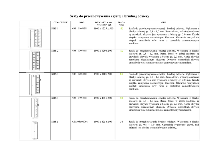 Szafy do przechowywania czystej i brudnej odzieży OZNACZENIE KOD WYMIARY w mm. Wys. x szer. x gł. WAGA w kg OPIS KBS 1 KBS 01050201 1900 x 1225 x 500 133 Szafa do przechowywania czystej i brudnej odzieży. Wykonana z blachy stalowej gr. 0,8 – 1,0 mm. Rama drzwi, w której osadzane są drzwiczki skrytek jest wykonana z blachy gr. 2,0 mm. Każda skrytka zamykana niezależnym kluczem. Otwarcie wszystkich skrytek umożliwia w/w rama z centralnie zamontowanym zamkiem. KBS 2 KBS 03050601 1900 x 820 x 500 103 Szafa do przechowywania czystej odzieży. Wykonana z blachy stalowej gr. 0,8 – 1,0 mm. Rama drzwi, w której osadzane są drzwiczki skrytek wykonana z blachy gr. 2,0 mm. Każda skrytka zamykana niezależnym kluczem. Otwarcie wszystkich skrytek umożliwia w/w rama z centralnie zamontowanym zamkiem. KBS 3 KBS 02050201 1900 x 840 x 500 83 Szafa do przechowywania czystej i brudnej odzieży. Wykonana z blachy stalowej gr. 0,8 – 1,0 mm. Rama drzwi, w której osadzane są drzwiczki skrytek jest wykonana z blachy gr. 2,0 mm. Każda skrytka zamykana niezależnym kluczem. Otwarcie wszystkich skrytek umożliwia w/w rama z centralnie zamontowanym zamkiem. KBS 4 KBS 04050601 1900 x 435 x 500 58 Szafa do przechowywania czystej odzieży. Wykonana z blachy stalowej gr. 0,8 – 1,0 mm. Rama drzwi, w której osadzane są drzwiczki skrytek wykonana z blachy gr. 2,0 mm. Każda skrytka zamykana niezależnym kluczem. Otwarcie wszystkich skrytek umożliwia w/w rama z centralnie zamontowanym zamkiem. KBS 5 KBS 05100701 1900 x 425 x 500 34 Szafa do przechowywania brudnej odzieży. Wykonana z blachy stalowej gr. 0,8 – 1,0 mm. Centralnie ryglowane drzwi, nad którymi jest skośna wrzutnia brudnej odzieży. Szafki gospodarcze SMD OZNACZENIE KOD WYMIARY w mm. wys. x szer. x gł. WAGA w kg OPIS SMD 60 SAU 0401030201 1800 x 600 x 500 52 Szafka socjalna – gospodarcza wyposażona w 4 stałe półki Szafka zamykana zamkiem cylindrycznymi z ryglowaniem w 2 punktach. SMD 61 SAU 0401030401 1800 x 600 x 500 54 Szafka socjalna –gospodarcza, wyposażona wewnątrz lewego segmentu – w 4 półki, wewnątrz prawego segmentu – w górną półkę, poniżej w drążek z 3 przesuwanymi wieszakami na ubranie. Szafka zamykana zamkiem cylindrycznymi z ryglowaniem w 2 punktach. SMD 62 SAU 0401030501 1800 x 600 x 500 52 Szafka socjalna –gospodarcza, wyposażona wewnątrz lewego segmentu – w 4 półki. Prawy segment służy do przechowywania szczotek, mopa i innych narzędzi do sprzątania. Brak ścianki rozdzielającej na dole szafki pozwala na umieszczenie np.wiadra. Szafka zamykana zamkiem cylindrycznymi z ryglowaniem w 2 punktach.