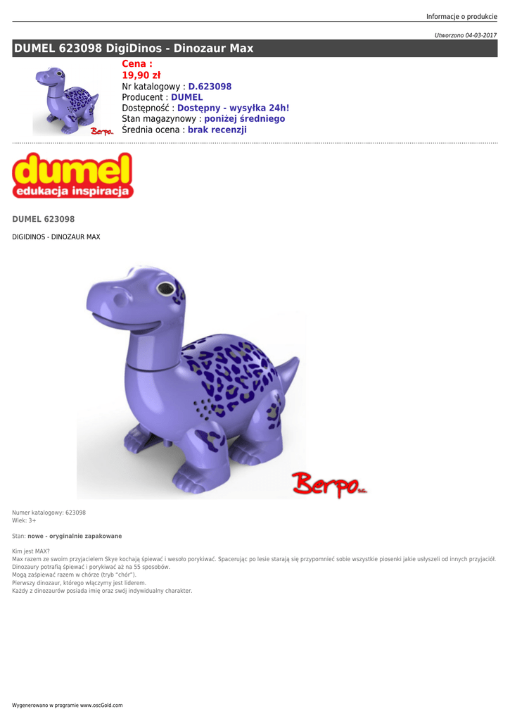 Informacje o produkcie Utworzono 04-03-2017 DUMEL 623098 DigiDinos - Dinozaur Max Cena : 19,90 zł Nr katalogowy : D.623098 Producent : DUMEL Dostępność : Dostępny - wysyłka 24h! Stan magazynowy : poniżej średniego Średnia ocena : brak recenzji DUMEL 623098 DIGIDINOS - DINOZAUR MAX Numer katalogowy: 623098 Wiek: 3+ Stan: nowe - oryginalnie zapakowane Kim jest MAX? Max razem ze swoim przyjacielem Skye kochają śpiewać i wesoło porykiwać. Spacerując po lesie starają się przypomnieć sobie wszystkie piosenki jakie usłyszeli od innych przyjaciół. Dinozaury potrafią śpiewać i porykiwać aż na 55 sposobów. Mogą zaśpiewać razem w chórze (tryb “chór”). Pierwszy dinozaur, którego włączymy jest liderem. Każdy z dinozaurów posiada imię oraz swój indywidualny charakter. Wygenerowano w programie www.oscGold.com Informacje o produkcie Dostępność w salonach: Ilość: Sklep - Złotniki: 4 Sklep - zlikwidowany: 0 Sklep - Szczepankowo: 1 Dostępne opcje DUMEL 623098 DigiDinos - Dinozaur Max » Wiek: 3 - 4 lat, 5 - 7 lat. Wygenerowano w programie www.oscGold.com