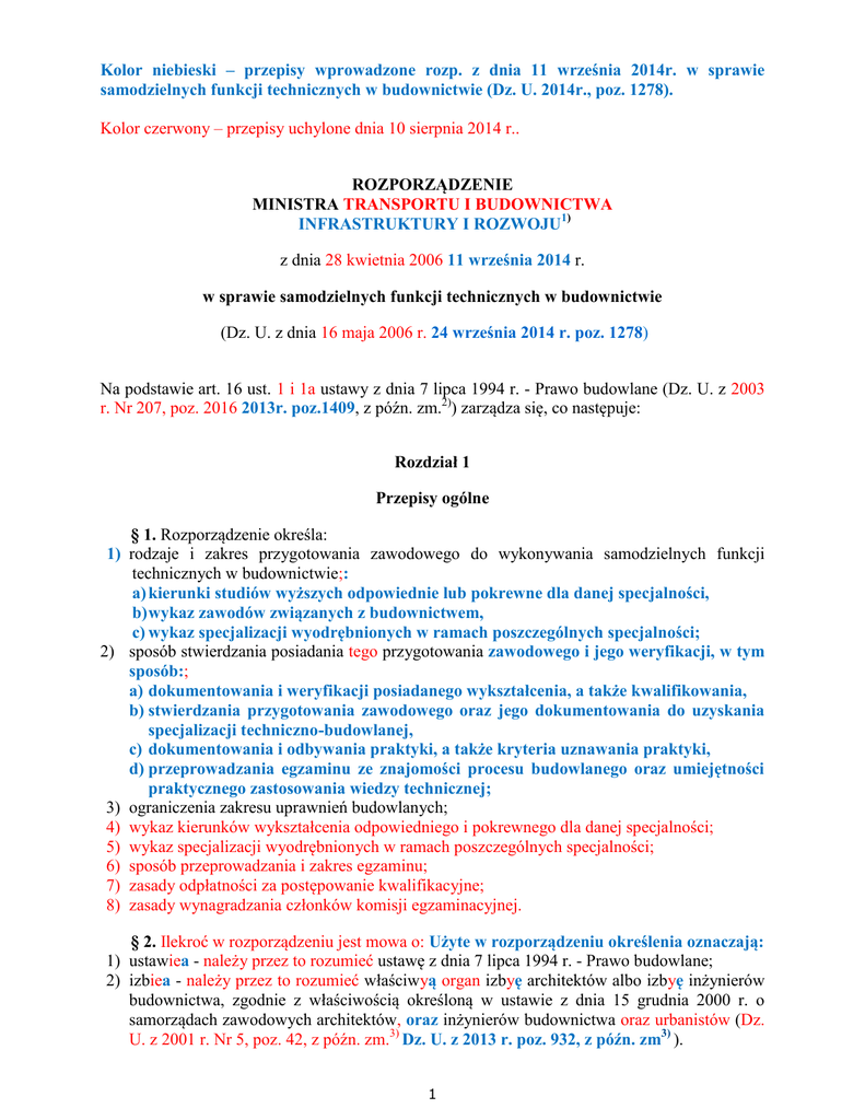 Kolor niebieski – przepisy wprowadzone rozp. z dnia 11 września 2014r. w sprawie samodzielnych funkcji technicznych w budownictwie (Dz. U. 2014r., poz. 1278). Kolor czerwony – przepisy uchylone dnia 10 sierpnia 2014 r.. ROZPORZĄDZENIE MINISTRA TRANSPORTU I BUDOWNICTWA INFRASTRUKTURY I ROZWOJU1) z dnia 28 kwietnia 2006 11 września 2014 r. w sprawie samodzielnych funkcji technicznych w budownictwie (Dz. U. z dnia 16 maja 2006 r. 24 września 2014 r. poz. 1278) Na podstawie art. 16 ust. 1 i 1a ustawy z dnia 7 lipca 1994 r. - Prawo budowlane (Dz. U. z 2003 r. Nr 207, poz. 2016 2013r. poz.1409, z późn. zm.2)) zarządza się, co następuje: Rozdział 1 Przepisy ogólne § 1. Rozporządzenie określa: 1) rodzaje i zakres przygotowania zawodowego do wykonywania samodzielnych funkcji technicznych w budownictwie;: a) kierunki studiów wyższych odpowiednie lub pokrewne dla danej specjalności, b) wykaz zawodów związanych z budownictwem, c) wykaz specjalizacji wyodrębnionych w ramach poszczególnych specjalności; 2) sposób stwierdzania posiadania tego przygotowania zawodowego i jego weryfikacji, w tym sposób:; a) dokumentowania i weryfikacji posiadanego wykształcenia, a także kwalifikowania, b) stwierdzania przygotowania zawodowego oraz jego dokumentowania do uzyskania specjalizacji techniczno-budowlanej, c) dokumentowania i odbywania praktyki, a także kryteria uznawania praktyki, d) przeprowadzania egzaminu ze znajomości procesu budowlanego oraz umiejętności praktycznego zastosowania wiedzy technicznej; 3) ograniczenia zakresu uprawnień budowlanych; 4) wykaz kierunków wykształcenia odpowiedniego i pokrewnego dla danej specjalności; 5) wykaz specjalizacji wyodrębnionych w ramach poszczególnych specjalności; 6) sposób przeprowadzania i zakres egzaminu; 7) zasady odpłatności za postępowanie kwalifikacyjne; 8) zasady wynagradzania członków komisji egzaminacyjnej. § 2. Ilekroć w rozporządzeniu jest mowa o: Użyte w rozporządzeniu określenia oznaczają: 1) ustawiea - należy przez to rozumieć ustawę z dnia 7 lipca 1994 r. - Prawo budowlane; 2) izbiea - należy przez to rozumieć właściwyą organ izbyę architektów albo izbyę inżynierów budownictwa, zgodnie z właściwością określoną w ustawie z dnia 15 grudnia 2000 r. o samorządach zawodowych architektów, oraz inżynierów budownictwa oraz urbanistów (Dz. U. z 2001 r. Nr 5, poz. 42, z późn. zm.3) Dz. U. z 2013 r. poz. 932, z późn. zm3) ). 1 Rozdział 2 Praktyka zawodowa i weryfikacja posiadanego wykształcenia § 3. 1. Praktyka zawodowa, o której mowa w art. 14 ust. 4 ustawy, odbywana jest po uzyskaniu dyplomu ukończenia wyższej uczelni pod kierownictwem osoby posiadającej uprawnienia budowlane bez ograniczeń we właściwej specjalności i będącej czynnym członkiem samorządu zawodowego. lub po uzyskaniu tytułu zawodowego technika lub mistrza albo dyplomu potwierdzającego kwalifikacje zawodowe w zawodzie nauczanym na poziomie technika oraz jest potwierdzona przez osobę wpisaną na listę członków izby, posiadającą odpowiednie uprawnienia budowlane. 2. Do praktyki zawodowej może zostać zaliczona praktyka odbyta po ukończeniu trzeciego roku studiów wyższych, z wyłączeniem praktyki objętej programem studiów. Zakres praktyki zawodowej powinien być zgodny z zakresem specjalności uprawnień budowlanych, o które ubiega się wnioskodawca. 3. Do praktyki zawodowej na budowie zalicza się wykonywanie czynności inspekcyjnokontrolnych w organach nadzoru budowlanego. Dwa lata pracy przy wykonywaniu czynności inspekcyjno-kontrolnych uznaje się za rok pracy na budowie praktykę odbytą po ukończeniu trzeciego roku studiów wyższych, potwierdzoną przez osobę posiadającą odpowiednie uprawnienia budowlane i wpisaną na listę członków izby. 4. Do praktyki zawodowej na budowie zalicza się: 1) wykonywanie czynności inspekcyjno-kontrolnych w organach nadzoru budowlanego; 2) pracę w organach administracji rządowej albo jednostek samorządu terytorialnego, realizujących zadania zarządcy drogi publicznej, albo polegającą na wykonywaniu czynności na terenie budowy i obejmującą konieczność fachowej oceny zjawisk lub samodzielnego rozwiązywania zagadnień architektonicznych oraz technicznoorganizacyjnych; 3) pracę u zarządcy infrastruktury kolejowej lub w podmiocie odpowiedzialnym za utrzymanie infrastruktury kolejowej we właściwym stanie technicznym działającym na zlecenie zarządcy infrastruktury kolejowej, polegającą na wykonywaniu czynności na terenie budowy lub czynności inspekcyjno-kontrolnych i obejmującą konieczność fachowej oceny zjawisk, stanu technicznego budowli i urządzeń budowlanych lub samodzielnego rozwiązywania zagadnień architektonicznych oraz techniczno-organizacyjnych, w wymiarze stanowiącym nie więcej niż połowę wymaganego okresu. 5. Dwa lata pracy przy wykonywaniu czynności, o których mowa w ust. 4, uznaje się za rok praktyki zawodowej na budowie. 6. Praktyka zawodowa, o której mowa w ust. 4, wymaga potwierdzenia przez osobę posiadającą odpowiednie uprawnienia budowlane i wpisaną na listę członków izby. 7. Dokumentem potwierdzającym odbycie: 1) praktyki, o której mowa w art. 14 ust. 4-4b ustawy, jest oświadczenie potwierdzające odbycie praktyki zawodowej, którego wzór określa załącznik nr 1 do rozporządzenia; 2) praktyki zawodowej przy projektowaniu lub budowie obiektów budowlanych usytuowanych na terenach zamkniętych w jednostce organizacyjnej podległej Ministrowi Obrony Narodowej, ministrowi właściwemu do spraw wewnętrznych albo Szefowi Agencji Bezpieczeństwa Wewnętrznego jest zaświadczenie potwierdzające odbycie praktyki zawodowej wydane przez właściwego wojewódzkiego inspektora nadzoru budowlanego, z wyszczególnieniem okresu odbywania praktyki zawodowej z podaniem terminów rozpoczęcia i ukończenia praktyki, z zakresu danej specjalności. § 4. 1. Osoba odbywająca praktykę zawodową do