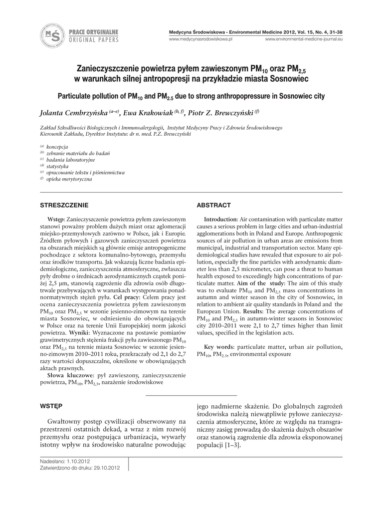 Medycyna Środowiskowa - Environmental Medicine 2012, Vol. 15, No. 4, 31-38 www.environmental-medicine-journal.eu www.medycynasrodowiskowa.pl Zanieczyszczenie powietrza pyłem zawieszonym PM10 oraz PM2,5 w warunkach silnej antropopresji na przykładzie miasta Sosnowiec Particulate pollution of PM10 and PM2.5 due to strong anthropopressure in Sosnowiec city Jolanta Cembrzyńska (a–e), Ewa Krakowiak (b, f), Piotr Z. Brewczyński (f) Zakład Szkodliwości Biologicznych i Immunoalergologii, Instytut Medycyny Pracy i Zdrowia Środowiskowego Kierownik Zakładu, Dyrektor Instytutu: dr n. med. P.Z. Brewczyński (a) (b) (c) (d) (e) (f) koncepcja zebranie materiału do badań badania laboratoryjne statystyka opracowanie tekstu i piśmiennictwa opieka merytoryczna STRESZCZENIE Wstęp: Zanieczyszczenie powietrza pyłem zawieszonym stanowi poważny problem dużych miast oraz aglomeracji miejsko-przemysłowych zarówno w Polsce, jak i Europie. Źródłem pyłowych i gazowych zanieczyszczeń powietrza na obszarach miejskich są głównie emisje antropogeniczne pochodzące z sektora komunalno-bytowego, przemysłu oraz środków transportu. Jak wskazują liczne badania epidemiologiczne, zanieczyszczenia atmosferyczne, zwłaszcza pyły drobne o średnicach aerodynamicznych cząstek poniżej 2,5 µm, stanowią zagrożenie dla zdrowia osób długotrwale przebywających w warunkach występowania ponadnormatywnych stężeń pyłu. Cel pracy: Celem pracy jest ocena zanieczyszczenia powietrza pyłem zawieszonym PM10 oraz PM2,5 w sezonie jesienno-zimowym na terenie miasta Sosnowiec, w odniesieniu do obowiązujących w Polsce oraz na terenie Unii Europejskiej norm jakości powietrza. Wyniki: Wyznaczone na postawie pomiarów grawimetrycznych stężenia frakcji pyłu zawieszonego PM10 oraz PM2,5 na terenie miasta Sosnowiec w sezonie jesienno-zimowym 2010–2011 roku, przekraczały od 2,1 do 2,7 razy wartości dopuszczalne, określone w obowiązujących aktach prawnych. Słowa kluczowe: pył zawieszony, zanieczyszczenie powietrza, PM10, PM2,5, narażenie środowiskowe WSTĘP Gwałtowny postęp cywilizacji obserwowany na przestrzeni ostatnich dekad, a wraz z nim rozwój przemysłu oraz postępująca urbanizacja, wywarły istotny wpływ na środowisko naturalne powodując Nadesłano: 1.10.2012 Zatwierdzono do druku: 29.10.2012 ABSTRACT Introduction: Air contamination with particulate matter causes a serious problem in large cities and urban-industrial agglomerations both in Poland and Europe. Anthropogenic sources of air pollution in urban areas are emissions from municipal, industrial and transportation sector. Many epidemiological studies have revealed that exposure to air pollution, especially the fine particles with aerodynamic diameter less than 2,5 micrometer, can pose a threat to human health exposed to exceedingly high concentrations of particulate matter. Aim of the study: The aim of this study was to evaluate PM10 and PM2,5 mass concentrations in autumn and winter season in the city of Sosnowiec, in relation to ambient air quality standards in Poland and the European Union. Results: The average concentrations of PM10 and PM2,5 in autumn-winter seasons in Sosnowiec city 2010–2011 were 2,1 to 2,7 times higher than limit values, specified in the legislation acts. Key words: particulate matter, urban air pollution, PM10, PM2.5, environmental exposure jego nadmierne skażenie. Do globalnych zagrożeń środowiska należą niewątpliwie pyłowe zanieczyszczenia atmosferyczne, które ze względu na transgraniczny zasięg prowadzą do skażenia dużych obszarów oraz stanowią zagrożenie dla zdrowia eksponowanej populacji [1–3]. 32 Medycyna Środowiskowa - Environmental Medicine 2012, Vol. 15, No. 4 Jolanta Cembrzyńska i wsp.: Zanieczyszczenie powietrza pyłem zawieszonym PM10 oraz PM2,5 w warunkach silnej antropopresji… Pył zawieszony stanowi złożoną mieszaninę cząstek stałych, ciekłych i gazowych, które ze względu na duży stopień dyspersji mogą przebywać w atmosferze w stanie zawieszonym przez długi czas. W kontekście oceny stopnia zagrożenia zdrowia, powszechnie stosowanym parametrem w odniesieniu do pyłu zawieszonego jest klasyfikacja według średnicy aerodynamicznej cząstek. Wyróżnia ona dwie główne frakcje (kategorie) pyłu, będące elementem monitoringu jakości powietrza w środowisku miejskim zarówno w Polsce jak i Europie: – PM10 (ang. coarse particles) – frakcja zgrubna, której cząstki pyłu mają średnice aerodynamiczne poniżej 10 µm, – PM2,5 (ang. fine particles) – frakcja drobna, której cząstki pyłu mają średnice aerodynamiczne poniżej 2,5 µm. Poszczególne frakcje pyłu zawieszonego, tworzą zróżnicowane grupy zanieczyszczeń, które oprócz wspomnianej średnicy aerodynamicznej różnią się między innymi procesem powstawania, składem chemicznym, zachowaniem oraz czasem półtrwania w atmosferze. W środowisku miejskim frakcja zgrubna pyłu jest emitowana bezpośrednio do atmosfery jako zanieczyszczenie pierwotne i obejmuje materiał uwalniany przez źródła stacjonarne i powierzchniowe w postaci cząstek pyłu, kurzu, popiołu, sadzy oraz pyłu drogowego ulegającego resuspensji [3, 4]. Frakcja drobna, którą stanowią cząstki o średnicy mniejszej niż 2,5 µm, powstaje w atmosferze, jako produkt utleniania prekursorów gazowych takich jak: dwutlenek siarki (SO2), tlenki azotu (NOx), amoniak (NH3), oraz lotne związki organiczne (LZO), których źródłem są wysokotemperaturowe procesy obróbki paliw stałych i płynnych [3]. Frakcja ta zawiera największą grupę związków chemicznych o udowodnionym działaniu rakotwórczym, mutagennym oraz cytotoksycznym, między innymi wielopierścieniowe węglowodory aromatyczne (WWA). Ze względu na powszechność występowania w środowisku człowieka oraz wysoki współczynnik kancerogenności, benzo(a)piren został uznany markerem dla całej grupy WWA [5–7]. Zapoczątkowane w drugiej połow
