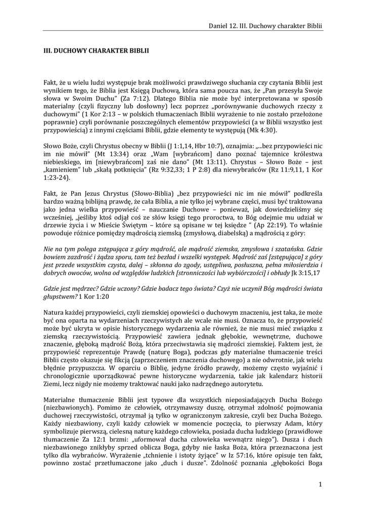 Daniel 12. III. Duchowy charakter Biblii III. DUCHOWY CHARAKTER BIBLII Fakt, że u wielu ludzi występuje brak możliwości prawdziwego słuchania czy czytania Biblii jest wynikiem tego, że Biblia jest Księgą Duchową, która sama poucza nas, że „Pan przesyła Swoje słowa w Swoim Duchu” (Za 7:12). Dlatego Biblia nie może być interpretowana w sposób materialny (czyli fizyczny lub dosłowny) lecz poprzez „porównywanie duchowych rzeczy z duchowymi” (1 Kor 2:13 – w polskich tłumaczeniach Biblii wyrażenie to nie zostało przełożone poprawnie) czyli porównanie poszczególnych elementów przypowieści (a w Biblii wszystko jest przypowieścią) z innymi częściami Biblii, gdzie elementy te występują (Mk 4:30). Słowo Boże, czyli Chrystus obecny w Biblii (J 1:1,14, Hbr 10:7), oznajmia: „...bez przypowieści nic im nie mówił” (Mt 13:34) oraz „Wam [wybrańcom] dano poznać tajemnice królestwa niebieskiego, im [niewybrańcom] zaś nie dano” (Mt 13:11). Chrystus – Słowo Boże – jest „kamieniem” lub „skałą potknięcia” (Rz 9:32,33; 1 P 2:8) dla niewybrańców (Rz 11:9,11, 1 Kor 1:23-24). Fakt, że Pan Jezus Chrystus (Słowo-Biblia) „bez przypowieści nic im nie mówił” podkreśla bardzo ważną biblijną prawdę, że cała Biblia, a nie tylko jej wybrane części, musi być traktowana jako jedna wielka przypowieść – nauczanie Duchowe – ponieważ, jak dowiedzieliśmy się wcześniej, „jeśliby ktoś odjął coś ze słów księgi tego proroctwa, to Bóg odejmie mu udział w drzewie życia i w Mieście Świętym – które są opisane w tej księdze ” (Ap 22:19). To właśnie powoduje różnice pomiędzy mądrością ziemską (zmysłową, diabelską) a mądrością z góry: Nie na tym polega zstępująca z góry mądrość, ale mądrość ziemska, zmysłowa i szatańska. Gdzie bowiem zazdrość i żądza sporu, tam też bezład i wszelki występek. Mądrość zaś [zstępująca] z góry jest przede wszystkim czysta, dalej – skłonna do zgody, ustępliwa, posłuszna, pełna miłosierdzia i dobrych owoców, wolna od względów ludzkich [stronniczości lub wybiórczości] i obłudy Jk 3:15,17 Gdzie jest mędrzec? Gdzie uczony? Gdzie badacz tego świata? Czyż nie uczynił Bóg mądrości świata głupstwem? 1 Kor 1:20 Natura każdej przypowieści, czyli ziemskiej opowieści o duchowym znaczeniu, jest taka, że może być ona oparta na wydarzeniach rzeczywistych ale wcale nie musi. Oznacza to, że przypowieść może być ukryta w opisie historycznego wydarzenia ale również, że nie musi mieć związku z ziemską rzeczywistością. Przypowieść zawiera jednak głębokie, wewnętrzne, duchowe znaczenie, głęboką mądrość Bożą, która przeciwstawia się mądrości ziemskiej. Faktem jest, że przypowieść reprezentuje Prawdę (naturę Boga), podczas gdy materialne tłumaczenie treści Biblii często okazuje się fikcją (zaprzeczeniem znaczenia duchowego) a nie odwrotnie, jak wielu błędnie przypuszcza. W oparciu o Biblię, jedyne źródło prawdy, możemy często wyjaśnić i chronologicznie uporządkować pewne historyczne wydarzenia, takie jak kalendarz historii Ziemi, lecz nigdy nie możemy traktować nauki jako nadrzędnego autorytetu. Materialne tłumaczenie Biblii jest typowe dla wszystkich nieposiadających Ducha Bożego (niezbawionych). Pomimo że człowiek, otrzymawszy duszę, otrzymał zdolność pojmowania duchowej rzeczywistości, otrzymał ją tylko w ograniczonym zakresie, czyli bez Ducha Bożego. Każdy niezbawiony, czyli każdy człowiek w momencie poczęcia, to pierwszy Adam, który symbolizuje pierwszą, cielesną naturę każdego człowieka, posiada ducha ludzkiego (prawidłowe tłumaczenie Za 12:1 brzmi: „uformował ducha człowieka wewnątrz niego”). Dusza i duch niezbawionego znikłyby sprzed oblicza Boga, gdyby nie łaska Boża, która przeznaczona jest tylko dla wybrańców. Wyrażenie „tchnienie i istoty żyjące” w Iz 57:16, które opisuje ten fakt, powinno zostać przetłumaczone jako „duch i dusze”. Zdolność poznania „głębokości Boga 1 Daniel 12. III. Duchowy charakter Biblii samego” (1 Kor 2:10) jest z góry przeznaczona wyłącznie dla Bożego wybrańca i zostanie w jego życiu urzeczywistniona dopiero po zbawieniu czyli po otrzymaniu przez niego Ducha Bożego. Dar ten nie był jednak przeznaczony dla zewnętrznych, instytucjonalnych strażników Biblii, to znaczy dla Izraela i nowotestamentowych kościołów. Jest on przeznaczony wyłącznie dla tych, których Bóg wybrał do tego jeszcze przed założeniem świata. Przykład Izraela, który reprezentuje cielesne umysły, i którego odbiciem są kościoły, pokazuje, że Żydzi oczekiwali króla (Łk 19:11), który przyjdzie w spektakularny sposób. Oczekiwali dosłownego, politycznego króla, który poprowadzi ich do zwycięstwa, i który zapewni im dobrobyt, podczas gdy Jezus pouczał ich wyraźnie, że „Królestwo Boże nie przyjdzie w sposób dostrzegalny” (Łk 17:20). To z kolei wskazuje, że Żydzi Go nie rozpoznali – „Przyszło (Słowo Boże) do swojej własności, a swoi Go nie przyjęli” (J 1:11). Co prawda, podążając za prawem ceremonialno-moralnym, byli w posiadaniu klucza wiedzy, którym jest Biblia, jednak brak duchowego nauczania przeszkodził tym, „którzy wejść chcieli (dosł. wchodzili)” (Łk 11:52). „Klucze do Królestwa Niebieskiego” (Biblia) będą skutecznie działać wyłącznie w rękach Bożych wybrańców po ich zbawieniu. Przypomnijmy raz jeszcze znamienne słowa Chrystusa: Jezus zapytał ich: A wy za kogo Mnie uważacie? Odpowiedział Szymon Piotr (obraz wybrańców Bożych): Ty jesteś Mesjasz, Syn Boga żywego. Na to Jezus mu rzekł: Błogosławiony jesteś, Szymonie, synu Jony. Albowiem nie objawiły Ci tego ciało i krew, lecz Ojciec mój, który jest w niebie. Otóż i Ja tobie powiadam: Ty jesteś Piotr [czyli Opoka] i na tej opoce [na duchowej skale czyli Chrystusie; 1 Ko