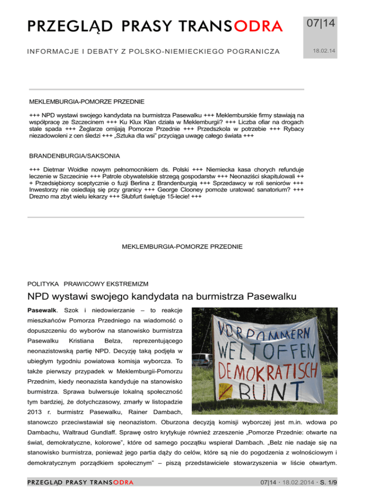 PRZEGLĄD PRASY TRANSODRA INFORMACJE I DEBAT Y Z POLSKO-NIEMIECKIEGO POGRANICZA 07|14 18.02.14 MEKLEMBURGIA-POMORZE PRZEDNIE +++ NPD wystawi swojego kandydata na burmistrza Pasewalku +++ Meklemburskie firmy stawiają na współpracę ze Szczecinem +++ Ku Klux Klan działa w Meklemburgii? +++ Liczba ofiar na drogach stale spada +++ Żeglarze omijają Pomorze Przednie +++ Przedszkola w potrzebie +++ Rybacy niezadowoleni z cen śledzi +++ „Sztuka dla wsi” przyciąga uwagę całego świata +++ BRANDENBURGIA/SAKSONIA +++ Dietmar Woidke nowym pełnomocnikiem ds. Polski +++ Niemiecka kasa chorych refunduje leczenie w Szczecinie +++ Patrole obywatelskie strzegą gospodarstw +++ Neonaziści skapitulowali ++ + Przedsiębiorcy sceptycznie o fuzji Berlina z Brandenburgią +++ Sprzedawcy w roli seniorów +++ Inwestorzy nie osiedlają się przy granicy +++ George Clooney pomoże uratować sanatorium? +++ Drezno ma zbyt wielu lekarzy +++ Słubfurt świętuje 15-lecie! +++ MEKLEMBURGIA-POMORZE PRZEDNIE POLITYKA PRAWICOWY EKSTREMIZM NPD wystawi swojego kandydata na burmistrza Pasewalku Pasewalk. Szok i niedowierzanie – to reakcje mieszkańców Pomorza Przedniego na wiadomość o dopuszczeniu do wyborów na stanowisko burmistrza Pasewalku Kristiana Belza, reprezentującego neonazistowską partię NPD. Decyzję taką podjęła w ubiegłym tygodniu powiatowa komisja wyborcza. To także pierwszy przypadek w Meklemburgii-Pomorzu Przednim, kiedy neonazista kandyduje na stanowisko burmistrza. Sprawa bulwersuje lokalną społeczność tym bardziej, że dotychczasowy, zmarły w listopadzie 2013 r. burmistrz Pasewalku, Rainer Dambach, stanowczo przeciwstawiał się neonazistom. Oburzona decyzją komisji wyborczej jest m.in. wdowa po Dambachu, Waltraud Gundlaff. Sprawę ostro krytykuje również zrzeszenie „Pomorze Przednie: otwarte na świat, demokratyczne, kolorowe”, które od samego początku wspierał Dambach. „Belz nie nadaje się na stanowisko burmistrza, ponieważ jego partia dąży do celów, które są nie do pogodzenia z wolnościowym i demokratycznym porządkiem społecznym” – piszą przedstawiciele stowarzyszenia w liście otwartym. PRZ EGL ĄD PRAS Y T RANS O DRA 07|14 · 18.02.2014 · S. 1/9 PRZEGLĄD PRASY TRANSODRA INFORMACJE I DEBAT Y Z POLSKO-NIEMIECKIEGO POGRANICZA 07|14 18.02.14 Mieszkańcy uważają decyzję o dopuszczeniu neonazisty do majowych wyborów tym bardziej za niezrozumiałą, gdyż podczas wyborów na stanowisko burmistrza w 2010 r. Kristianowi Belzowi odmówiono startu. » Fot. Stowarzyszenie „Pomorze Przednie: otwarte na świat, demokratyczne, kolorowe” powstało w 2012 r. z inicjatywy Rainera Dambacha. Jego celem jest m.in. walka z postawami rasistowskimi i neonazistowskimi. Autor: M. Stefanek. » Nordkurier, 16.02.2014 » Nordkurier, 16.02.2014 GOSPODARKA POLITYKA Meklemburskie firmy stawiają na współpracę ze Szczecinem Neubrandenburg. Przedsiębiorcy ze wschodniej części Meklemburgii-Pomorza Przedniego chcą rozwijać współpracę gospodarczą przede wszystkim ze Szczecinem i Berlinem. „Potrzebujemy od władz takiego samego wsparcia, jakie otrzymuje zachód regionu współpracując z Hamburgiem” – mówi Torsten Haasch, prezes Izby Przemysłowo-Handlowej w Neubrandenburgu. Przedsiębiorcy apelują do władz regionu przede wszystkim o szybką rozbudowę połączeń komunikacyjnych ze Szczecinem, w tym całkowitą elektryfikację trasy kolejowej Berlin-Szczecin. » Ostsee Zeitung, 14.02.2014 SPOŁECZEŃSTWO PRAWICOWY EKSTREMIZM Ku Klux Klan działa w Meklemburgii? Grabow/Kröpelin. Białe płaszcze z kapturami i przemarsze z pochodniami, podczas których palone są krzyże – to znaki rozpocznawcze rasistowskiej organizacji Ku Klux Klan. Wszystko wskazuje na to, że jej członkowie działają także w Meklemburgii-Pomorzu Przednim. Od pewnego czasu do władz landu docierają informacje o nocnych spotkaniach Ku Klux Klanu. Przynajmniej dwukrotnie doszło do spalenia krzyża – w miejscowości Grabow niedaleko Ludwigslust oraz w Kröpelin w powiecie Rostok. Świadkowie opisują, że na mejscu widzieli osoby ubrane w białe płaszcze z kapturami. Minister spraw wewnętrznych MeklemburgiiPomorza Przedniego, Loreny Caffier (CDU), przyznał, że działalność organizacji jest mu znana. Sprawą zajmują się służby wywiadowcze. Ministerstwo nie wyklucza, że rasistowska ideologia Ku Klux Klanu otrzymuje w nacjonalistycznych i prawicowo-ekstremistycznych kręgach poparcie. Sprawą ma zająć się Parlamentarna Komisja Kontrolna. » Lübecker Nachrichten, 17.02.2014 INFRASTRUKTURA BEZPIECZEŃSTWO Liczba ofiar na drogach stale spada Meklemburgia-Pomorze Przednie. Jeszcze nigdy w historii landu nie odnotowano tak dużego spadku liczby ofiar na drogach, jak w ubiegłym roku. W wyniku wypadków zginęło w 2013 r. 80 osób. Dla PRZ EGL ĄD PRAS Y T RANS O DRA 07|14 · 18.02.2014 · S. 2/9 PRZEGLĄD PRASY TRANSODRA INFORMACJE I DEBAT Y Z POLSKO-NIEMIECKIEGO POGRANICZA 07|14 18.02.14 porównania, w 1991 r. śmierć na drodze poniosły 624 osoby. Jako jedną z przyczyn wzrostu bezpieczeństwa kierowców i podróżnych specjaliści wymieniają rozwój techniki motoryzacyjnej. „Samochody stały się dużo bardziej bezpieczne” – mówi Christian Hieff, rzecznik ADAC Hansa. Inną przyczyną spadku liczby ofiar śmiertelnych jest poprawa infrastruktury drogowej w landzie. Od zjednoczenia Niemiec w MeklemburgiiPomorzu Przednim zainwestowano ok. 1,1 mld euro w rozbudowę i remont dróg krajowych. Dodatkowo wydano 562 mln euro na poprawę stanu dróg komunalnych. » Ostsee Zeitung, 14.02.2014 GOSPODARKA INFRASTUKTURA Żeglarze omijają Pomorze Przednie Stralsund. Między Stralsundem a Warnemünde nie ma ani jednego portu, w którym mogliby zatrzymać się żeglarze. Odległość między tymi miejscowościami wynosi 52 mile morskie i jest, zdaniem Matthiasa Horna z powiatu Pomorze Przednie-Rugia, niemożliwa do przebycia przez niedoświadczonych żeglarzy w ciągu