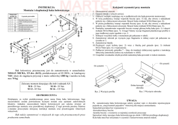 INSTRUKCJA MontaŜu i eksploatacji haka holowniczego Oznaczenie zacisku wg ISO PN 1 L 2 + 3 31 4 R 5 58R 6 54 7 58L Kierunkowskazy lewe Tylne światła przeciwmgłowe Masa Kierunkowskazy prawe Światła pozycyjne prawe Światła hamowania Światła pozycyjne lewe 7 4 10 Łączenie przewodów Kolejność czynności przy montaŜu 8 8 1 8 8 6 7 5 3 1. 2. 3. 4. Zdemontować zderzak. Opuścić tłumik z tylnych zawiesi. Odkręcić zaślepki znajdujące się w podłuŜnicach (nie będą ponownie montowane). W lewą podłuŜnicę wsunąć wspornik boczny (poz. 5) tak, aby otwory z nakrętkami pokryły się z fabrycznymi otworami. Skręcić luźno śrubami M10x30mm (poz. 8). 5. W prawą podłuŜnicę wsunąć wspornik boczny (poz. 4) tak, aby otwory z nakrętkami pokryły się z fabrycznymi otworami. Skręcić luźno śrubami M10x30mm (poz. 8). 6. Pomiędzy zamontowane wsporniki boczne wsunąć główną belkę haka (poz. 1) i skręcić śrubami M12x30mm (poz. 7). Uwaga! NaleŜy wyciąć fragment plastikowego profilu w jego środkowej części zgodnie z rys. 2. 7. Dokręcić wszystkie śruby z momentem jak pokazano w tabeli. 8. Zamontować zderzak po wycięciu jego fragmentu w dolnej części jak pokazano na rysunku nr 3. 9. Zamontować tłumik. 10. Przykręcić część kulistą (poz. 2) wraz z blachą pod gniazdo (poz. 3) śrubami M12x75mm (poz. 6) z wyposaŜenia. 11. Podłączyć przewody gniazdka 7 – bieg. do instalacji elektrycznej zgodnie z instrukcją fabryczną samochodu (zaleca się wykonanie w ASO). 12. Uzupełnić ewentualne ubytki powłoki malarskiej haka powstałe w trakcie montaŜu. 2 Oś symetrii Oś symetrii Hak holowniczy przeznaczony jest do zamontowania w samochodzie: NISSAN MICRA, 3/5 drz. (K12), produkowanym od 02.2003r., nr katalogowy V60 i słuŜy do ciągnięcia przyczep o masie całkowitej 1300 kg i nacisku na kulę max 75 kg. 75 60 Zalecany moment skręcający dla śrub i nakrętek 8,8: M 8 - 25 Nm M 10 - 55 Nm M 12 - 85 Nm M 14 - 135 Nm 60 Dolna krawędź zderzaka Rys. 3 Wycięcie zderzaka Rys. 2 Wycięcie profilu OD PRODUCENTA Dziękujemy za wybór produkowanego przez naszą firmę haka holowniczego. Jego niezawodność została potwierdzona licznymi testami oraz opiniami zadowolonych klientów. JednakŜe niezawodność haków holowniczych jest zaleŜna równieŜ od prawidłowego montaŜu oraz prawidłowej eksploatacji. Z tego powodu prosimy Państwa o staranne przeczytanie niniejszej instrukcji montaŜu oraz przestrzeganie właściwych wskazówek. Hak naleŜy zamontować w miejscach do tego celu przeznaczonych przez producenta samochodu. UWAGA Po zamontowaniu haka holowniczego naleŜy uzyskać wpis w dowodzie rejestracyjnym pojazdu na „stacji kontroli pojazdów” właściwej dla miejsca zamieszkania. Samochód powinien być wyposaŜony w : -kierunkowskazy boczne -lusterka boczne o rozstawie co najmniej szerokości przyczepy Sprawdzać śruby mocujące haka holowniczego po około 1 000 km przebiegu eksploatacji. Kula haka musi być utrzymana w czystości i konserwowana smarem stałym. PPUH AUTO-HAK S.J. WyposaŜenie haka: Produkcja Haków Holowniczych Henryk & Zbigniew Nejman 76-200 SŁUPSK ul. Słoneczna 16K tel/fax (059) 8-414-414; 8-414-413 E-mail: [email protected] www.autohak.com.pl Hak holowniczy bez wyposaŜenia elektrycznego Klasa: A50-X Nr kat. V60 Przeznaczony do zamontowania w samochodzie: Producent: NISSAN Model: MICRA Typ: 3/5 drz. (K12) produkowanym od 02.2003r. Dane techniczne: wartość siły D: 6,78 kN maksymalna masa przyczepy: 1300 kg maksymalny nacisk na kulę: 75 kg Numer homologacji zgodnie z wytycznymi regulaminu EKG/ONZ 55.01: E20-55R-01 1515 KARTA GWARANCYJNA Producent udziela gwarancji niniejszą kartą gwarancyjną na okres 24 miesięcy licząc od dnia zakupu haka holowniczego do samochodu: NISSAN MICRA 3/5 drz. (K12) produkowanego od 02.2003r. Data produkcji .............................. Data zakupu............................................. Zakres gwarancji obejmuje wyłącznie wady jakościowe wynikające z winy producenta. Gwarancja nie obejmuje natomiast uszkodzeń zawinionych przez nabywcę, wynikających z niewłaściwego montaŜu, uŜytkowania lub konserwacji, uszkodzeń mechanicznych, normalnego zuŜycia podczas eksploatacji itp. Gwarancja udzielona na zakupiony towar nie wyłącza, nie ogranicza ani nie zawiesza uprawnień kupującego wynikających z niezgodności towaru z umową. Reklamacje naleŜy zgłaszać w punkcie sprzedaŜy, składając jednocześnie kartę gwarancyjną. Usunięcie "wady" następuje po stwierdzeniu przez punkt sprzedaŜy wspólnie z producentem słuszności złoŜonej reklamacji. Reklamacja powinna być załatwiona w ciągu 14 dni od dnia uznania reklamacji. Karta gwarancyjna jest niewaŜna jeŜeli nie jest wypełniona i podpisana. Data zgłoszenia reklamacji: ................................................................... INFORMACJA WSTĘPNA Hak holowniczy jest skonstruowany zgodnie z zasadami bezpieczeństwa ruchu drogowego. Hak holowniczy jest elementem wpływającym na bezpieczeństwo jazdy i moŜe zostać zainstalowany wyłącznie przez personel wyspecjalizowany. Niedopuszczalne jest dokonywanie jakichkolwiek zmian w konstrukcji haka. Powoduje to wygaśniecie dopuszczenia do stosowania. W przypadku obecności masy izolacyjnej lub osłony podwozia w miejscu przylegania haka, naleŜy ją usunąć. Nieosłonięte miejsca karoserii oraz wywiercone otwory naleŜy pomalować farbą antykorozyjną. Informacjami wiąŜącymi odnośnie wartości obciąŜeń są dane podawane przez producenta samochodu, względnie wartości maksymalnej masy przyczepy oraz maksymalnego nacisku na kulę, przy czym wartości parametrów haka holowniczego nie mogą być przekroczone. Wzór do obliczania wartości siły D: Maks. masa przyczepy [kg] x Maks. masa samochodu [kg] Maks. masa przyczepy [kg] + Maks. masa samochodu [kg] X 9,81 = 1000 D [kN]