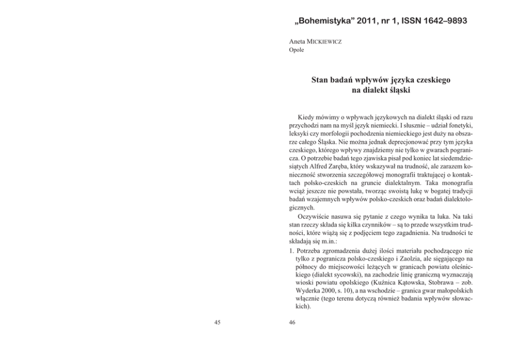„Bohemistyka” 2011, nr 1, ISSN 1642–9893 Aneta MICKIEWICZ Opole Stan badañ wp³ywów jêzyka czeskiego na dialekt œl¹ski Kiedy mówimy o wp³ywach jêzykowych na dialekt œl¹ski od razu przychodzi nam na myœl jêzyk niemiecki. I s³usznie – udzia³ fonetyki, leksyki czy morfologii pochodzenia niemieckiego jest du¿y na obszarze ca³ego Œl¹ska. Nie mo¿na jednak deprecjonowaæ przy tym jêzyka czeskiego, którego wp³ywy znajdziemy nie tylko w gwarach pogranicza. O potrzebie badañ tego zjawiska pisa³ pod koniec lat siedemdziesi¹tych Alfred Zarêba, który wskazywa³ na trudnoœæ, ale zarazem koniecznoœæ stworzenia szczegó³owej monografii traktuj¹cej o kontaktach polsko-czeskich na gruncie dialektalnym. Taka monografia wci¹¿ jeszcze nie powsta³a, tworz¹c swoist¹ lukê w bogatej tradycji badañ wzajemnych wp³ywów polsko-czeskich oraz badañ dialektologicznych. Oczywiœcie nasuwa siê pytanie z czego wynika ta luka. Na taki stan rzeczy sk³ada siê kilka czynników – s¹ to przede wszystkim trudnoœci, które wi¹¿¹ siê z podjêciem tego zagadnienia. Na trudnoœci te sk³adaj¹ siê m.in.: 1. Potrzeba zgromadzenia du¿ej iloœci materia³u pochodz¹cego nie tylko z pogranicza polsko-czeskiego i Zaolzia, ale siêgaj¹cego na pó³nocy do miejscowoœci le¿¹cych w granicach powiatu oleœnickiego (dialekt sycowski), na zachodzie liniê graniczn¹ wyznaczaj¹ wioski powiatu opolskiego (KuŸnica K¹towska, Stobrawa – zob. Wyderka 2000, s. 10), a na wschodzie – granica gwar ma³opolskich w³¹cznie (tego terenu dotycz¹ równie¿ badania wp³ywów s³owackich). 45 46 2. Trudnoœæ w okreœleniu pochodzenia wyrazu – czy dany leksem jest zapo¿yczeniem czeskim czy s³owackim (zob. Zarêba 1988, s. 103). Niejednokrotnie badacz musi uwzglêdniæ szersze t³o porównawcze – siêgn¹æ równie¿ do innych jêzyków s³owiañskich, aby nie przypisaæ b³êdnie Ÿród³a pochodzenia danego leksemu. Do tego dochodzi równie¿ zagadnienie zapo¿yczeñ bezpoœrednich i poœrednich, czyli np. latynizmów i germanizmów przejêtych drog¹ czesk¹ (zob. Czarnecki 1970). 3. Najwiêksz¹ pu³apk¹ czyhaj¹c¹ na badacza jest „utajona” historia wyrazu – zdarza³o siê, ¿e wyraz uwa¿any przez jêzykoznawców za bohemizm, okazywa³ siê staropolskim archaizmem, który w jêzyku literackim wyszed³ z u¿ycia, natomiast zachowa³ siê w gwarze. Przyk³adem mo¿e byæ wyraz ko¿a ‘skóra’ (cz. kùûe), który jak okaza³o siê póŸniej u¿ywany by³ w tej formie w jêzyku polskim do XV w. Konieczne zatem jest przyjêcie postawy „podejrzliwoœci” wobec ka¿dego badanego leksemu w fazie interpretacji. 4. Do badania wp³ywów jêzyka czeskiego na gwary œl¹skie konieczne jest korzystanie z kliku kryteriów, na co wskazywa³ Alfred Zarêba (Zarêba 1988, s. 101–113). Jest to m.in. kryterium formalne, historyczno-jêzykowe, semantyczne, porównawcze itd. Zastosowanie kilku metod badawczych mo¿e dopiero daæ nadziejê na prawid³owoœæ naszych badañ. Literatura dotycz¹ca wp³ywów jêzyka czeskiego na polski jest obszerna i historycznie zakorzeniona w jêzykoznawstwie. Zw³aszcza na pocz¹tku XX w. powsta³o wiele cennych prac slawistycznych z zakresu komparatystyki jêzyka czeskiego i polskiego. Do najwa¿niejszych badaczy tamtego okresu nale¿¹ tak wybitne postacie naukowe jak W³adys³aw Nehring, Kazimierz Nitsch, Aleksander Brückner, Edward Klich, Mieczys³aw Ma³ecki, Witold Taszycki, Stanis³aw Urbañczyk1. Prawdziwy rozkwit przypada jednak na drug¹ po³owê XX w., 1 Dorobek naukowy wymienionych badaczy bli¿ej przedstawia Janusz Siatkow- ski w artykule Wp³ywy czeskie w jêzyku polskim (historia badañ, zakres i rola wp³ywów), Warszawa 1996, s. 238246. 47 kiedy to podjêto ró¿ne kierunki badawcze z zakresu jêzykowych kontaktów polsko-czeskich. Do rozwoju nauki w tym zakresie przyczyni³o siê powstanie w 1955 r. periodyku Studia z Filologii Polskiej i S³owiañskiej, skupiaj¹cego wybitnych slawistów polskich i zagranicznych. Wœród licznych prac, których powstanie przypada na drug¹ po³owê ubieg³ego stulecia mo¿na wyró¿niæ publikacje prezentuj¹ce ró¿ne krêgi tematyczne badañ: – badania wp³ywów jêzyka czeskiego na polski jêzyk literacki, zw³aszcza w zabytkach XV i XVI-wiecznych oraz u poszczególnych autorów. Na tym polu znane s¹ prace Janusza Siatkowskiego (1959, 1964), Zdzis³awa Stiebera (1955), Mieczys³awa Basaja (1966), Józefa Reczka (1968) i in.; – prace jêzykoznawcze z zakresu fonetyki, morfologii, fleksji, leksyki, frazeologii, tu: liczne prace powsta³e w Instytucie S³owianoznawstwa PAN dotycz¹ce polsko-czeskich interferencji jêzykowych, prace Janusza Siatkowskiego (m.in. 1959, 1965, 1970, 1996), Mieczys³awa Basaja (1966, 1964 i n.), Stanis³awa Rosponda (1959), Stanis³awa B¹ka (1974), artyku³y Alfreda Zarêby zebrane w monografii Szkice z dialektologii œl¹skiej (1988) oraz wielotomowe dzie³o Atlas jêzykowy Œl¹ska (1969–1996), prace Teresy Zofii Or³oœ (1993) i in.; – badania Teresy Zofii Or³oœ dotycz¹ce zwi¹zków historycznych i kulturowych (1993), prace Janiny Labochy dotycz¹ce Œl¹ska Cieszyñskiego (1997) czy badania Zbigniewa Grenia (2000); – warto wspomnieæ prace jêzykoznawców czeskich, którzy badaj¹ jêzykowe wp³ywy czesko-polskie, m. in. Edward Lotko (1997, 1992), Jiøi Damborský (1977), Irena Bogoczová (2006). Na tym tle osobny kierunek badawczy stanowi¹ badania dialektologiczne. Równie¿ tu mo¿na wydzieliæ krêgi tematyczne (m.in. jêzykowe, historyczne, socjologiczne, socjolingwistyczne, kulturowe), wokó³ których by³y i nadal s¹ prowadzone badania naukowe. Najbardziej znane, bo wzbudzaj¹ce niema³e emocje, by³y badania gwar przejœciowych, których zacz¹tki da³ Zdzis³aw Stieber w latach trzydziestych, a na dobre rozwinê³y siê przy okazji dyskursu naukowego 48 o pochodzeniu gwar przejœciowych miêdzy jêzykoznawcami polskimi i czeskimi. Du¿¹