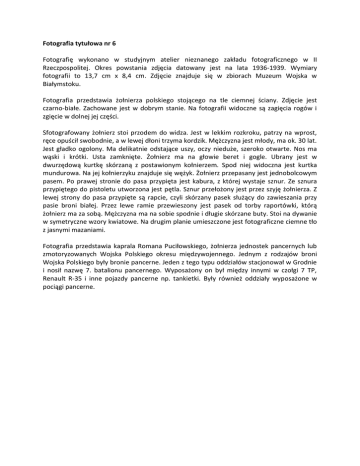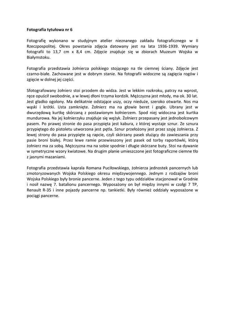 Fotografia tytułowa nr 6 Fotografię wykonano w studyjnym atelier nieznanego zakładu fotograficznego w II Rzeczpospolitej. Okres powstania zdjęcia datowany jest na lata 1936-1939. Wymiary fotografii to 13,7 cm x 8,4 cm. Zdjęcie znajduje się w zbiorach Muzeum Wojska w Białymstoku. Fotografia przedstawia żołnierza polskiego stojącego na tle ciemnej ściany. Zdjęcie jest czarno-białe. Zachowane jest w dobrym stanie. Na fotografii widoczne są zagięcia rogów i zgięcie w dolnej jej części. Sfotografowany żołnierz stoi przodem do widza. Jest w lekkim rozkroku, patrzy na wprost, ręce opuścił swobodnie, a w lewej dłoni trzyma kordzik. Mężczyzna jest młody, ma ok. 30 lat. Jest gładko ogolony. Ma delikatnie odstające uszy, oczy nieduże, szeroko otwarte. Nos ma wąski i krótki. Usta zamknięte. Żołnierz ma na głowie beret i gogle. Ubrany jest w dwurzędową kurtkę skórzaną z postawionym kołnierzem. Spod niej widoczna jest kurtka mundurowa. Na jej kołnierzyku znajduje się wężyk. Żołnierz przepasany jest jednobolcowym pasem. Po prawej stronie do pasa przypięta jest kabura, z której wystaje sznur. Ze sznura przypiętego do pistoletu utworzona jest pętla. Sznur przełożony jest przez szyję żołnierza. Z lewej strony do pasa przypięte są rapcie, czyli skórzany pasek służący do zawieszania przy pasie broni białej. Przez lewe ramie przewieszony jest pasek od torby raportówki, którą żołnierz ma za sobą. Mężczyzna ma na sobie spodnie i długie skórzane buty. Stoi na dywanie w symetryczne wzory kwiatowe. Na drugim planie umieszczone jest fotograficzne ciemne tło z jasnymi mazaniami. Fotografia przedstawia kaprala Romana Puciłowskiego, żołnierza jednostek pancernych lub zmotoryzowanych Wojska Polskiego okresu międzywojennego. Jednym z rodzajów broni Wojska Polskiego były bronie pancerne. Jeden z tego typu oddziałów stacjonował w Grodnie i nosił nazwę 7. batalionu pancernego. Wyposażony on był między innymi w czołgi 7 TP, Renault R-35 i inne pojazdy pancerne np. tankietki. Były również oddziały wyposażone w pociągi pancerne.