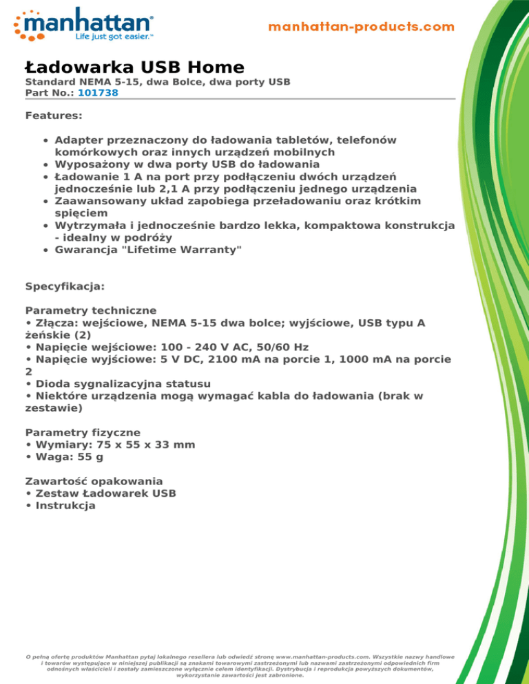 Ładowarka USB Home Standard NEMA 5-15, dwa Bolce, dwa porty USB Part No.: 101738 Features: Adapter przeznaczony do ładowania tabletów, telefonów komórkowych oraz innych urządzeń mobilnych Wyposażony w dwa porty USB do ładowania Ładowanie 1 A na port przy podłączeniu dwóch urządzeń jednocześnie lub 2,1 A przy podłączeniu jednego urządzenia Zaawansowany układ zapobiega przeładowaniu oraz krótkim spięciem Wytrzymała i jednocześnie bardzo lekka, kompaktowa konstrukcja - idealny w podróży Gwarancja "Lifetime Warranty" Specyfikacja: Parametry techniczne • Złącza: wejściowe, NEMA 5-15 dwa bolce; wyjściowe, USB typu A żeńskie (2) • Napięcie wejściowe: 100 - 240 V AC, 50/60 Hz • Napięcie wyjściowe: 5 V DC, 2100 mA na porcie 1, 1000 mA na porcie 2 • Dioda sygnalizacyjna statusu • Niektóre urządzenia mogą wymagać kabla do ładowania (brak w zestawie) Parametry fizyczne • Wymiary: 75 x 55 x 33 mm • Waga: 55 g Zawartość opakowania • Zestaw Ładowarek USB • Instrukcja O pełną ofertę produktów Manhattan pytaj lokalnego resellera lub odwiedź stronę www.manhattan-products.com. Wszystkie nazwy handlowe i towarów występujące w niniejszej publikacji są znakami towarowymi zastrzeżonymi lub nazwami zastrzeżonymi odpowiednich firm odnośnych właścicieli i zostały zamieszczone wyłącznie celem identyfikacji. Dystrybucja i reprodukcja powyższych dokumentów, wykorzystanie zawartości jest zabronione. O pełną ofertę produktów Manhattan pytaj lokalnego resellera lub odwiedź stronę www.manhattan-products.com. Wszystkie nazwy handlowe i towarów występujące w niniejszej publikacji są znakami towarowymi zastrzeżonymi lub nazwami zastrzeżonymi odpowiednich firm odnośnych właścicieli i zostały zamieszczone wyłącznie celem identyfikacji. Dystrybucja i reprodukcja powyższych dokumentów, wykorzystanie zawartości jest zabronione.