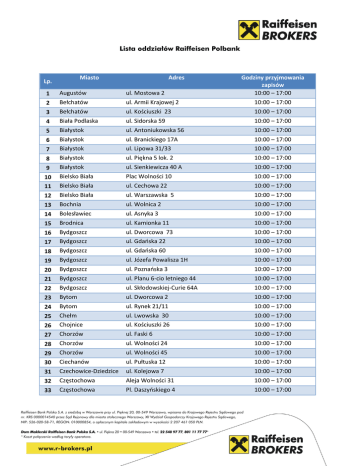 Lista oddziałów Raiffeisen Polbank Miasto Lp. Adres Godziny przyjmowania zapisów 10:00 – 17:00 1 Augustów ul. Mostowa 2 2 Bełchatów ul. Armii Krajowej 2 10:00 – 17:00 3 Bełchatów ul. Kościuszki 23 10:00 – 17:00 4 Biała Podlaska ul. Sidorska 59 10:00 – 17:00 5 Białystok ul. Antoniukowska 56 10:00 – 17:00 6 Białystok ul. Branickiego 17A 10:00 – 17:00 7 Białystok ul. Lipowa 31/33 10:00 – 17:00 8 Białystok ul. Piękna 5 lok. 2 10:00 – 17:00 9 Białystok ul. Sienkiewicza 40 A 10:00 – 17:00 10 Bielsko Biała Plac Wolności 10 10:00 – 17:00 11 Bielsko Biała ul. Cechowa 22 10:00 – 17:00 12 Bielsko Biała ul. Warszawska 5 10:00 – 17:00 13 Bochnia ul. Wolnica 2 10:00 – 17:00 14 Bolesławiec ul. Asnyka 3 10:00 – 17:00 15 Brodnica ul. Kamionka 11 10:00 – 17:00 16 Bydgoszcz ul. Dworcowa 73 10:00 – 17:00 17 Bydgoszcz ul. Gdaoska 22 10:00 – 17:00 18 Bydgoszcz ul. Gdaoska 60 10:00 – 17:00 19 Bydgoszcz ul. Józefa Powalisza 1H 10:00 – 17:00 20 Bydgoszcz ul. Poznaoska 3 10:00 – 17:00 21 Bydgoszcz ul. Planu 6-cio letniego 44 10:00 – 17:00 22 Bydgoszcz ul. Skłodowskiej-Curie 64A 10:00 – 17:00 23 Bytom ul. Dworcowa 2 10:00 – 17:00 24 Bytom ul. Rynek 21/11 10:00 – 17:00 25 Chełm ul. Lwowska 30 10:00 – 17:00 26 Chojnice ul. Kościuszki 26 10:00 – 17:00 27 Chorzów ul. Faski 6 10:00 – 17:00 28 Chorzów ul. Wolności 24 10:00 – 17:00 29 Chorzów ul. Wolności 45 10:00 – 17:00 30 Ciechanów ul. Pułtuska 12 10:00 – 17:00 31 Czechowice-Dziedzice ul. Kolejowa 7 10:00 – 17:00 32 Częstochowa Aleja Wolności 31 10:00 – 17:00 33 Częstochowa Pl. Daszyoskiego 4 10:00 – 17:00 Raiffeisen Bank Polska S.A. z siedzibą w Warszawie przy ul. Pięknej 20, 00-549 Warszawa, wpisana do Krajowego Rejestru Sądowego pod nr. KRS 0000014540 przez Sąd Rejonowy dla miasta stołecznego Warszawy, XII Wydział Gospodarczy Krajowego Rejestru Sądowego, NIP: 526-020-58-71, REGON: 010000854, o opłaconym kapitale zakładowym w wysokości 2 207 461 050 PLN. Dom Maklerski Raiffeisen Bank Polska S.A. • ul. Piękna 20 • 00-549 Warszawa • tel. 22 548 97 77, 801 11 77 77* * Koszt połączenia według taryfy operatora. 34 Częstochowa ul. Jasnogórska 96 10:00 – 17:00 35 Częstochowa ul. Najświętszej Marii Panny 35 10:00 – 17:00 36 Dąbrowa Górnicza ul. 3 Maja 3 10:00 – 17:00 37 Dębica ul. Kolejowa 32 10:00 – 17:00 38 Dzierżoniów ul. Rynek 51 B 10:00 – 17:00 39 Elbląg ul. 12 Lutego 2 lok.2 10:00 – 17:00 40 Elbląg ul. Grunwaldzka 2 10:00 – 17:00 41 Ełk ul. Mickiewicza 15 10:00 – 17:00 42 Gdaosk Aleja Grunwaldzka 65/67 10:00 – 17:00 43 Gdaosk Aleja Zwycięstwa 13A 10:00 – 17:00 44 Gdaosk ul. Klonowa 4c 10:00 – 17:00 45 Gdaosk ul. Kołobrzeska 30 10:00 – 17:00 46 Gdaosk ul. Rajska 4 10:00 – 17:00 47 Gdaosk ul. Wały Jagiellooskie 28/30 10:00 – 17:00 48 Gdynia Pl. Kaszubski 11 10:00 – 17:00 49 Gdynia ul. Redłowska 52 10:00 – 17:00 50 Gdynia ul. Świętojaoska 108 10:00 – 17:00 51 Gdynia ul. Świętojaoska 75 10:00 – 17:00 52 Gdynia ul. Władysława IV 30 10:00 – 17:00 53 Giżycko ul. Kętrzyoskiego 6 10:00 – 17:00 54 Gliwice ul. Dolnych Wałów 7 10:00 – 17:00 55 Gliwice ul. Zwycięstwa 47 10:00 – 17:00 56 Głogów Al. Wolności 36-38 10:00 – 17:00 57 Głogów ul. Grodzka 31 10:00 – 17:00 58 Gniezno ul. Dąbrówki 28 10:00 – 17:00 59 Gorzów Wielkopolski ul. Górczyoska 23 10:00 – 17:00 60 Gorzów Wielkopolski ul. Obotrycka 9 10:00 – 17:00 61 Gorzów Wielkopolski ul. Pionierów 3-5 10:00 – 17:00 62 Grodzisk Mazowiecki ul. Sienkiewicza 54 10:00 – 17:00 63 Grójec ul. Niepodległości 7 10:00 – 17:00 64 Grudziądz ul. Groblowa 19 10:00 – 17:00 65 Iława ul. Kopernika 6 10:00 – 17:00 66 Inowrocław ul. Królowej Jadwigi 14 10:00 – 17:00 67 Jarocin ul. Wrocławska 11 10:00 – 17:00 68 Jarosław ul. Grodzka 4 10:00 – 17:00 69 Jasło ul. Rynek 20 10:00 – 17:00 70 Jastrzębie Zdrój ul. Łowicka 35 10:00 – 17:00 71 Jaworzno ul. Rynek 5 10:00 – 17:00 Raiffeisen Bank Polska S.A. z siedzibą w Warszawie przy ul. Pięknej 20, 00-549 Warszawa, wpisana do Krajowego Rejestru Sądowego pod nr. KRS 0000014540 przez Sąd Rejonowy dla miasta stołecznego Warszawy, XII Wydział Gospodarczy Krajowego Rejestru Sądowego, NIP: 526-020-58-71, REGON: 010000854, o opłaconym kapitale zakładowym w wysokości 2 207 461 050 PLN. Dom Maklerski Raiffeisen Bank Polska S.A. • ul. Piękna 20 • 00-549 Warszawa • tel. 22 548 97 77, 801 11 77 77* * Koszt połączenia według taryfy operatora. 73 Jelenia Góra Pl. Kardynała Stefana Wyszyoskiego 56 ul. Konopnickiej 12 74 Kalisz Aleja Wolności 12 10:00 – 17:00 75 Kalisz ul. Górnośląska 58 10:00 – 17:00 76 Katowice Al. Korfantego 9 10:00 – 17:00 77 Katowice ul. Józefowska 91 10:00 – 17:00 78 Katowice ul. Sowioskiego 46 10:00 – 17:00 79 Katowice ul. Św.Jana 11 10:00 – 17:00 80 Katowice ul. Warszawska 3 10:00 – 17:00 81 Kędzierzyn-Koźle al. Jana Pawła II 19 10:00 – 17:00 82 Kielce ul. Hipoteczna 8 10:00 – 17:00 83 Kielce ul. Sienkiewicza 39 10:00 – 17:00 84 Kielce ul. Warszawska 31 A 10:00 – 17:00 85 Kielce ul. Zagnaoska 61 10:00 – 17:00 86 Koło ul. Sienkiewicza 31 10:00 – 17:00 87 Kołobrzeg ul. Walki Młodych 32-33 10:00 – 17:00 88 Konin ul. 1 Maja 6A 10:00 – 17:00 89 Konin ul. Kolejowa 2 10:00 – 17:00 90 Koszalin Rynek Staromiejski 4 10:00 – 17:00 91 Koszalin ul. Zwycięstwa 8/2 10:00 – 17:00 92 Kościerzyna ul. Rynek 17 10:00 – 17:00 93 Kraków Aleja Pokoju 44 10:00 – 17:00 94 Kraków ul. Armii Krajowej 18 10:00 – 17:00 95 Kraków ul. Celna 1 10:00 – 17:00 96 Kraków ul. Karmelicka 11 10:00 – 17:00 97 Kraków ul. Królewska 90 10:00 – 17:00 98 Kraków ul. Mogilska 21 10:00 – 17:00 99 Kraków ul. Starowiślna 48 10:00 – 17:00 100 Kraków 101 Kraków ul. Stradomska 21 10:00 – 17:00 ul. Szlak 20 10:00 – 17:00 102 Kraków 103 Kraków ul. Wielopole 17 10:00 – 17:00 ul. Zakopiaoska 105 10:00 – 17: