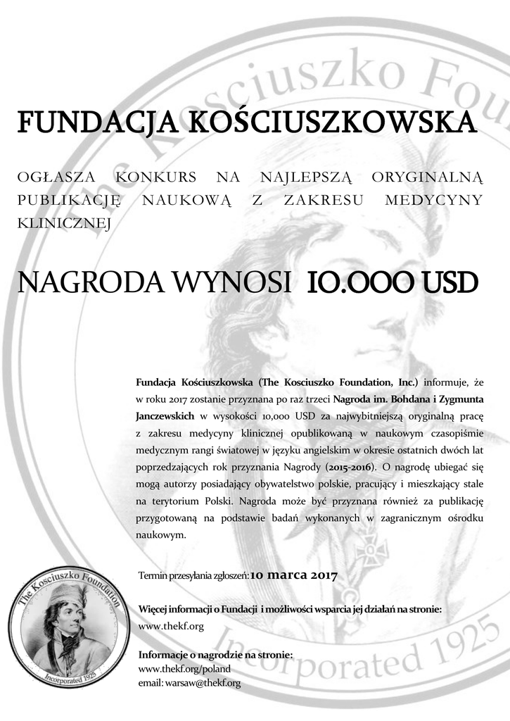 FUNDACJA KOŚCIUSZKOWSKA OGŁASZA KONKURS NA NAJLEPSZĄ ORYGINALNĄ PUBLIKACJĘ NAUKOWĄ Z ZAKRESU MEDYCYNY KLINICZNEJ NAGRODA WYNOSI IO.OOO USD Fundacja Kościuszkowska (The Kosciuszko Foundation, Inc.) informuje, że w roku 2017 zostanie przyznana po raz trzeci Nagroda im. Bohdana i Zygmunta Janczewskich w wysokości 10,000 USD za najwybitniejszą oryginalną pracę z zakresu medycyny klinicznej opublikowaną w naukowym czasopiśmie medycznym rangi światowej w języku angielskim w okresie ostatnich dwóch lat poprzedzających rok przyznania Nagrody (2015-2016). O nagrodę ubiegać się mogą autorzy posiadający obywatelstwo polskie, pracujący i mieszkający stale na terytorium Polski. Nagroda może być przyznana również za publikację przygotowaną na podstawie badań wykonanych w zagranicznym ośrodku naukowym. Termin przesyłania zgłoszeń: 10 marca 2017 Więcej informacji o Fundacji i możliwości wsparcia jej działań na stronie: www.thekf.org Informacje o nagrodzie na stronie: www.thekf.org/poland email: [email protected]