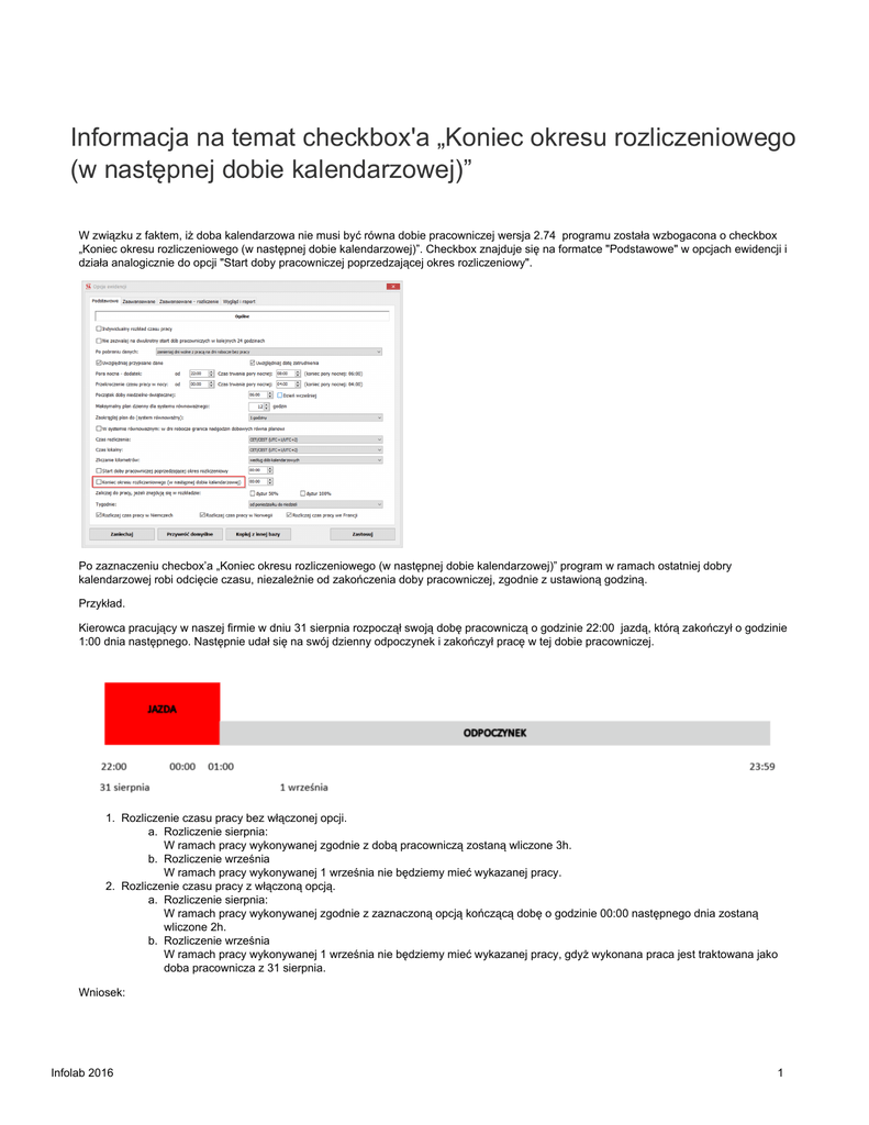 Informacja na temat checkbox'a „Koniec okresu rozliczeniowego (w następnej dobie kalendarzowej)” W związku z faktem, iż doba kalendarzowa nie musi być równa dobie pracowniczej wersja 2.74 programu została wzbogacona o checkbox „Koniec okresu rozliczeniowego (w następnej dobie kalendarzowej)”. Checkbox znajduje się na formatce "Podstawowe" w opcjach ewidencji i działa analogicznie do opcji "Start doby pracowniczej poprzedzającej okres rozliczeniowy". Po zaznaczeniu checbox’a „Koniec okresu rozliczeniowego (w następnej dobie kalendarzowej)” program w ramach ostatniej dobry kalendarzowej robi odcięcie czasu, niezależnie od zakończenia doby pracowniczej, zgodnie z ustawioną godziną. Przykład. Kierowca pracujący w naszej firmie w dniu 31 sierpnia rozpoczął swoją dobę pracowniczą o godzinie 22:00 jazdą, którą zakończył o godzinie 1:00 dnia następnego. Następnie udał się na swój dzienny odpoczynek i zakończył pracę w tej dobie pracowniczej. 1. Rozliczenie czasu pracy bez włączonej opcji. a. Rozliczenie sierpnia: W ramach pracy wykonywanej zgodnie z dobą pracowniczą zostaną wliczone 3h. b. Rozliczenie września W ramach pracy wykonywanej 1 września nie będziemy mieć wykazanej pracy. 2. Rozliczenie czasu pracy z włączoną opcją. a. Rozliczenie sierpnia: W ramach pracy wykonywanej zgodnie z zaznaczoną opcją kończącą dobę o godzinie 00:00 następnego dnia zostaną wliczone 2h. b. Rozliczenie września W ramach pracy wykonywanej 1 września nie będziemy mieć wykazanej pracy, gdyż wykonana praca jest traktowana jako doba pracownicza z 31 sierpnia. Wniosek: Infolab 2016 1 Po zaznaczeniu opcji nie została rozliczona jedna godzina pracy. UWAGA 1: Rozwiązanie może być wykorzystywane tylko i wyłącznie dla porównania czasu pracy na terenie Francji i w spornych przypadkach Jednakże rozliczanie czasu pracy przy włączonym checkbox’ie może prowadzić do wyników niezgodnych z prawem. UWAGA 2: Jeśli korzystamy z tej opcji należy zaznaczyć również opcję "Start doby pracowniczej poprzedzającej okres rozliczeniowy", aby uniknąć sytuacji jak opisana w przykładzie. Infolab 2016 2
