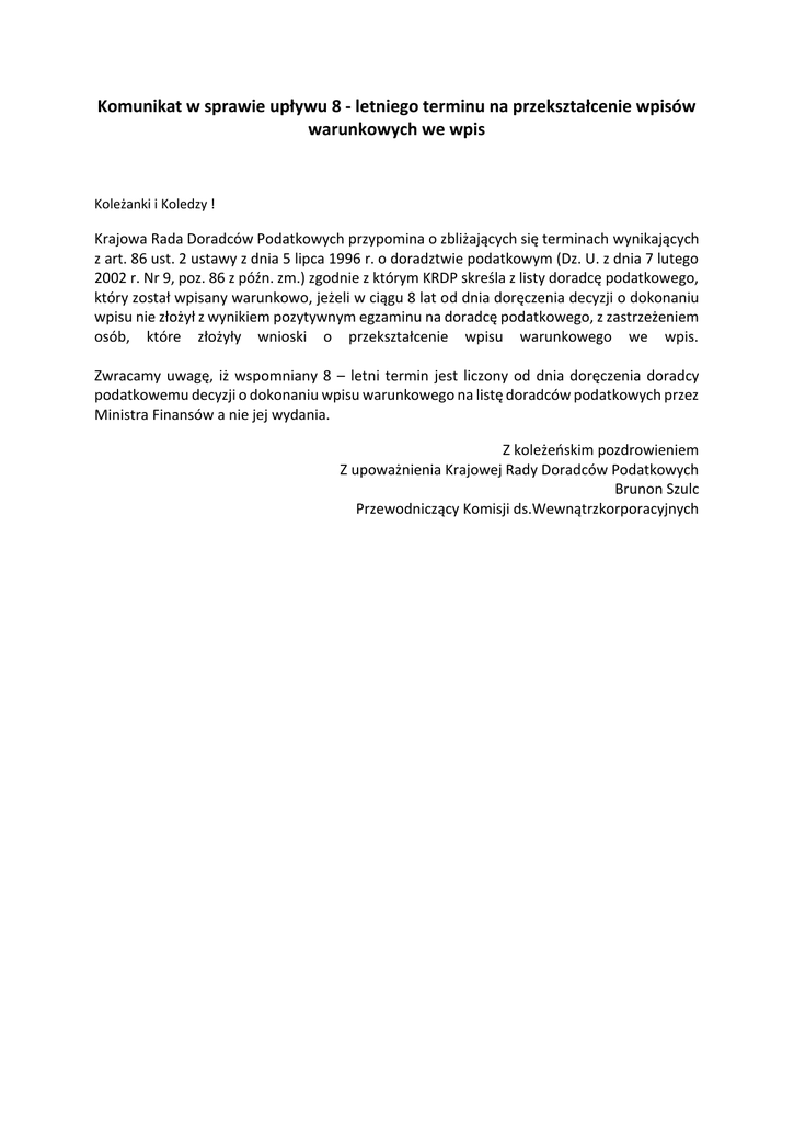 Komunikat w sprawie upływu 8 - letniego terminu na przekształcenie wpisów warunkowych we wpis Koleżanki i Koledzy ! Krajowa Rada Doradców Podatkowych przypomina o zbliżających się terminach wynikających z art. 86 ust. 2 ustawy z dnia 5 lipca 1996 r. o doradztwie podatkowym (Dz. U. z dnia 7 lutego 2002 r. Nr 9, poz. 86 z późn. zm.) zgodnie z którym KRDP skreśla z listy doradcę podatkowego, który został wpisany warunkowo, jeżeli w ciągu 8 lat od dnia doręczenia decyzji o dokonaniu wpisu nie złożył z wynikiem pozytywnym egzaminu na doradcę podatkowego, z zastrzeżeniem osób, które złożyły wnioski o przekształcenie wpisu warunkowego we wpis. Zwracamy uwagę, iż wspomniany 8 – letni termin jest liczony od dnia doręczenia doradcy podatkowemu decyzji o dokonaniu wpisu warunkowego na listę doradców podatkowych przez Ministra Finansów a nie jej wydania. Z koleżeńskim pozdrowieniem Z upoważnienia Krajowej Rady Doradców Podatkowych Brunon Szulc Przewodniczący Komisji ds.Wewnątrzkorporacyjnych