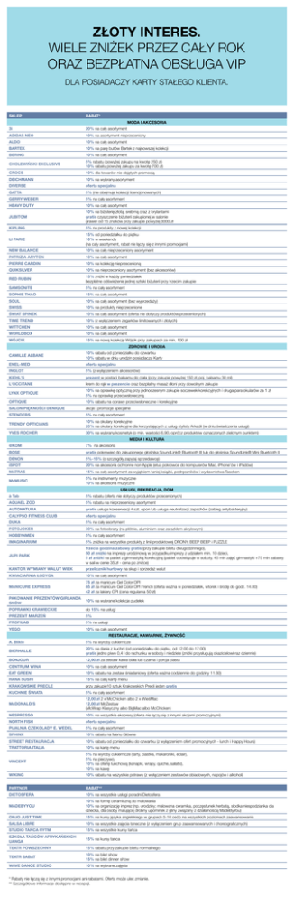 ZŁOTY INTERES. WIELE ZNIŻEK PRZEZ CAŁY ROK ORAZ BEZPŁATNA OBSŁUGA VIP DLA POSIADACZY KARTY STAŁEGO KLIENTA. SKLEP RABAT* 3i 20% na cały asortyment ALDO 10% na cały asortyment ADIDAS NEO BARTEK BERING CHOLEWIŃSKI EXCLUSIVE CROCS DEICHMANN DIVERSE GATTA GERRY WEBER HEAVY DUTY MODA I AKCESORIA 10% na asortyment nieprzeceniony 10% na parę butów Bartek z najnowszej kolekcji 10% na cały asortyment 5% rabatu (powyżej zakupu na kwotę 250 zł) 10% rabatu powyżej zakupu za kwotę 700 zł) 10% dla towarów nie objętych promocją 10% na wybrany asortyment oferta specjalna 5% (nie obejmuje kolekcji licencjonowanych) 5% na cały asortyment 10% na cały asortyment JUBITOM 10% na biżuterię złotą, srebrną oraz z brylantami gratis czyszczenie biżuterii zakupionej w salonie grawer od 15 znaków przy zakupie powyżej 3000 zł KIPLING 5% na produkty z nowej kolekcji LI PARIE 15% od poniedziałku do piątku 10% w weekendy (na cały asortyment, rabat nie łączy się z innymi promocjami) NEW BALANCE 10% na cały nieprzeceniony asortyment PIERRE CARDIN 10% na kolekcję nieprzecenioną PATRIZIA ARYTON QUIKSILVER 10% na cały asortyment 10% na nieprzeceniony asortyment (bez akcesoriów) RED RUBIN 15% zniżki w każdy poniedziałek bezpłatne odświeżenie jednej sztuki biżuterii przy trzecim zakupie SAMSONITE 5% na cały asortyment SOUL 10% na cały asortyment (bez wyprzedaży) SOPHIE THAO SWISS ŚWIAT SPINEK TIME TREND WITTCHEN WORLDBOX WÓJCIK CAMILLE ALBANE ENEL-MED INGLOT KIEHL'S L'OCCITANE LYNX OPTIQUE OPTIQUE SALON PIĘKNOŚCI DENIQUE STENDERS TRENDY OPTICIANS YVES ROCHER 15% na cały asortyment 10% na produkty nieprzecenione 10% na cały asortyment (oferta nie dotyczy produktów przecenionych) 10% (z wyłączeniem zegarków limitowanych i złotych) 10% na cały asortyment 10% na cały asortyment 15% na nową kolekcję Wójcik przy zakupach za min. 100 zł ZDROWIE I URODA 10% rabatu od poniedziałku do czwartku 10% rabatu w dniu urodzin posiadacza Karty oferta specjalna 5% (z wyłączeniem akcesoriów) prezent w postaci balsamu do ciała (przy zakupie powyżej 150 zł, poj. balsamu 30 ml) krem do rąk w prezencie oraz bezpłatny masaż dłoni przy dowolnym zakupie 10% na oprawkę optyczną przy jednoczesnym zakupie soczewek korekcyjnych i druga para okularów za 1 zł 5% na oprawkę przeciwsłoneczną 10% rabatu na oprawy przeciwsłoneczne i korekcyjne akcje i promocje specjalne 5% na cały asortyment 10% na okulary korekcyjne 20% na okulary korekcyjne dla korzystających z usług stylisty Arkadii (w dniu świadczenia usługi) 30% na wybrany kosmetyk (o min. wartości 6,90, oprócz produktów oznaczonych zielonym punktem) MEDIA I KULTURA @KOM 7% na akcesoria DENON 5%-15% (o szczegóły zapytaj sprzedawcę) BOSE iSPOT MATRAS gratis pokrowiec do zakupionego głośnika SoundLink® Bluetooth III lub do głośnika SoundLink® Mini Bluetooth II 20% na akcesoria ochronne non Apple (etui, pokrowce do komputerów Mac, iPhone’ów i iPadów) 15% na cały asortyment za wyjątkiem taniej książki, podręczników i wydawnictwa Taschen MxMUSIC 5% na instrumenty muzyczne 10% na akcesoria muzyczne à Tab 5% rabatu (oferta nie dotyczy produktów przecenionych) AUTONATURA gratis usługa konserwacji 4 szt. opon lub usługa neutralizacji zapachów (zabieg antybakteryjny) AQUAEL ZOO CALYPSO FITNESS CLUB DUKA FOTOJOKER HOBBY4MEN IMAGINARIUM USŁUGI, REKREACJA, DOM 5% rabatu na nieprzeceniony asortyment oferta specjalna 5% na cały asortyment 30% na fotoobrazy (na płótnie, aluminium oraz za szkłem akrylowym) 5% na cały asortyment 5% zniżka na wszystkie produkty z linii produktowej DRONY, BEEP BEEP i PUZZLE JUPI PARK trzecia godzina zabawy gratis (przy zakupie biletu dwugodzinnego), 50 zł zniżki na imprezę urodzinową w przypadku imprezy z udziałem min. 10 dzieci, 5 zł zniżki na pakiet z gimnastyką korekcyjną (pakiet obowiązuje w soboty, 45 min zajęć gimnastyki +75 min zabawy w sali w cenie 35 zł - cena po zniżce) KANTOR WYMIANY WALUT WIEK przelicznik hurtowy na skup i sprzedaż walut MANICURE EXPRESS 75 zł za manicure Gel Color OPI 85 zł za manicure Gel Color OPI French (oferta ważna w poniedziałek, wtorek i środę do godz. 14.00) 42 zł za lakiery OPI (cena regularna 50 zł) KWIACIARNIA ŁODYGA PAKOWANIE PREZENTÓW GIRLANDA SNÓW 10% na cały asortyment 10% na wybrane kolekcje pudełek POPRAWKI KRAWIECKIE do 15% na usługi PROFILAB 5% na usługi PREZENT MARZEŃ YEGO A. Blikle BIERHALLE BONJOUR CENTRUM WINA EAT GREEN HANA SUSHI KRAKOWSKIE PRECLE KUCHNIE ŚWIATA 5% 10% na cały asortyment RESTAURACJE, KAWIARNIE, ŻYWNOŚĆ 5% na wyroby cukiernicze 20% na dania z kuchni (od poniedziałku do piątku, od 12:00 do 17:00) gratis jedno piwo 0,4 l do rachunku w soboty i niedziele (zniżki przysługują okazicielowi raz dziennie) 12,90 zł za zestaw kawa biała lub czarna i porcja ciasta 10% na cały asortyment 10% rabatu na zestaw śniadaniowy (oferta ważna codziennie do godziny 11.30) 15% na całą kartę menu przy zakupie10 sztuk Krakowskich Precli jeden gratis 5% na cały asortyment McDONALD'S 12,00 zł 2 x McChicken albo 2 x WieśMac 12,00 zł McZestaw (McWrap Klasyczny albo BigMac albo McChicken) NESPRESSO 10% na wszystkie ekspresy (oferta nie łączy się z innymi akcjami promocyjnymi) PIJALNIA CZEKOLADY E. WEDEL 5% na cały asortyment NORTH FISH SPHINX STREET RESTAURACJA TRATTORIA ITALIA VINCENT WIKING oferta specjalna 10% rabatu na Menu Główne 10% rabatu od poniedziałku do czwartku (z wyłączeniem ofert promocyjnych - lunch i Happy Hours) 10% na kartę menu 5% na wyroby cukiernicze (tarty, ciastka, makaroniki, eclair), 5% na pieczywo, 10% na ofertę lunchową (kanapki, wrapy, quiche, sałatki), 10% na kawę 10% rabatu na wszystkie potrawy (z wyłączeniem zestawów obiadowych, napojów i alkoholi) PARTNER RABAT** MADEBYYOU 10% na formę ceramiczną do malowania 10% na organizację imprez (np. urodziny; malowana ceramika, poczęstunek herbatą, słodka niespodzianka dla dziecka,
