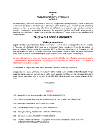 WAKACJE W MUZEUM NARODOWYM W POZNANIU LATO 2012 Na okres wakacji Muzeum Narodowe w Poznaniu przygotowało kilka propozycji, które adresowane są zarówno do dzieci i młodzieży jak i dorosłych. Obok znanych już z wcześniejszych propozycji Muzeum na lato w postaci zajęć dla dzieci pt. „Wakacje w muzeum” oraz „Letniego minikursu rysunku i malarstwa”- warsztatów malarskich dla dorosłych, istnieje możliwość uczestnictwa w specjalnych trzydniowych „Wakacyjnych zajęciach projektowych”, które przeznaczone są dla widzów indywidualnych. ZAJĘCIA DLA DZIECI I MŁODZIEŻY Wakacje w muzeum Zajęcia warsztatowe adresowane do dzieci w wieku 6 – 10 lat, które spędzają indywidualnie wakacje w Poznaniu lub okolicach. Odbywają się w miesiącach lipiec i sierpień od wtorku do piątku i w wybrane soboty. Rozpoczynają się o godzinie 12.15 w Muzeum Narodowym w Poznaniu przy Al. Marcinkowskiego 9 albo w oddziałach Muzeum Narodowego: Wielkopolskim Muzeum Wojskowym (Stary Rynek 9) oraz w Muzeum Etnograficznym (wejście przez park przy ul. Mostowej 7). Na wszystkie zajęcia w Muzeum Narodowym w Galerii Malarstwa i Rzeźby obowiązują zapisy z tygodniowym wyprzedzeniem, ze względu na ograniczoną ilość miejsc. Za zajęcia w oddziałach wstęp bez zapisów. Uczestnictwo w zajęciach w cenie 8 PLN. Muzeum zapewnia materiały plastyczne. Uwaga: zajęcia z cyklu „Wakacje w muzeum” adresowane są do widzów indywidualnych. Grupy zorganizowane prosimy o korzystanie ze stałej oferty edukacyjnej Muzeum Narodowego. Zgłoszenia przyjmowane są osobno pod nr tel. 061 8 568 136, 137 od poniedziałku do piątku od godz. 8.00 – 15.30. Plan spotkań SIERPIEŃ 1.08 –Niezwykła historia pewnego krzesła. MUZEUM NARODOWE 2.08 – Dzikie, oswojone, fantastyczne. O zwierzętach w sztuce. MUZEUM NARODOWE 3.08 –Wszystko o kwadracie. MUZEUM NARODOWE 4.08 – Fatałaszki na każdą okazję. MUZEUM NARODOWE 7.08 – Koloryści, kolory, kolorowanki. MUZEUM NARODOWE 8.08 – Bałkański skarbiec. MUZEUM ETNOGRAFICZNE 9.08 – "Jeszcze Polska nie umarła" – Zwycięskie Powstanie Wielkopolskie 1918-1919 roku". WIELKOPOLSKIE MUZEUM WOJSKOWE 10.08 – O zwyczajach i zachowaniu się przy stole. MUZEUM NARODOWE 11.08 – Tajemnicze życie kwiatów. MUZEUM NARODOWE 14.08 – Krajobrazy z różnych stron. MUZEUM NARODOWE 16.08 - Nerwy Minerwy i zmora Amora – o mitach greckich i rzymskich MUZEUM NARODOWE 17.08 – Zabawy dziecięce. MUZEUM NARODOWE 18.08 – O zwierzaku, który kochał lodówkę. MUZEUM NARODOWE 21.08 – Fryzury i nakrycia głowy w dawnych czasach. MUZEUM NARODOWE 22.08 – Wątek i osnowa czyli tajemnice tkackiego krosna. Z cyklu: Zapomniane umiejętności ludowe – Tkactwo. MUZEUM ETNOGRAFICZNE 23.08 – O rety, portrety! MUZEUM NARODOWE 24.08 – Święci znani i mniej znani. MUZEUM NARODOWE 28.08 – W trzech wymiarach. MUZEUM NARODOWE 29.08 – Widoki miast i przyrody. MUZEUM NARODOWE 30.08 - Rycerze, żołnierze... wakacyjne spotkanie z historią. WIELKOPOLSKIE MUZEUM WOJSKOWE 31.08 - Kopiujemy dzieła mistrzów. MUZEUM NARODOWE Projekty wakacyjne 3-dniowe Sierpień wtorek 21.08 – czwartek 23.08 – Zajęcia projektowe o architekturze Warsztaty dla młodzieży w wieku od 12 do 16 lat Miejsce: Galeria Malarstwa i Rzeźby Muzeum Narodowego w Poznaniu środa 29.08 – piątek 31.08 – Sztuka – nie – sztuka Warsztaty dla dzieci w wieku od 6 do 12 lat. Zajęcia projektowe, które pozwolą uczestnikom m. in. w sposób swobodny poznać nie tylko różne oblicza sztuki, ale także podyskutować czym jest dzieło sztuki. Miejsce: Galeria Malarstwa i Rzeźby Muzeum Narodowego w Poznaniu W godzinach od 12:00 do 15:00 Koszt: 40 PLN. Muzeum zapewnia materiały plastyczne. Zgłoszenia na warsztaty pod nr tel. 8 568 136, 137. Liczba miejsc ograniczona (max. 12 osób)