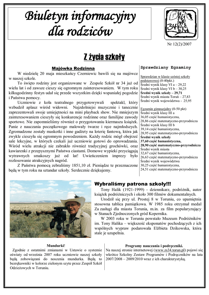 Biuletyn informacyjny dla rodziców Nr 12(2)/2007 Z życia szkoły Majówka Rodzinna W niedzielę 20 maja mieszkańcy Czerniewic bawili się na majówce w naszej szkole. To święto rodziny jest organizowane w Zespole Szkół nr 34 już od wielu lat i od zawsze cieszy się ogromnym zainteresowaniem. W tym roku kilkugodzinny festyn udał się przede wszystkim dzięki wspaniałej pogodzie i Państwa pomocy. Uczniowie z koła teatralnego przygotowywali spektakl, który wzbudził aplauz wśród widowni. Najzdolniejsi muzycznie i tanecznie zaprezentowali swoje umiejętności na mini playback show. Nie mniejszym zainteresowaniem cieszyły się konkurencje rodzinne oraz familijne zawody sportowe. Nie zapomnieliśmy również o przygotowaniu kiermaszu książek. Panie z nauczania początkowego malowały twarze i ręce najmłodszych. Zgromadzone zostały maskotki i inne gadżety na loterię fantową, która jak zwykle cieszyła się ogromnym powodzeniem. Każdy rodzic mógł obejrzeć sale lekcyjne, w których czekali już uczniowie gotowi do oprowadzania. Wśród wielu atrakcji nie zabrakło również tradycyjnej grochówki, oraz kawiarenki z przepysznymi Państwa ciastami. Domowe wypieki przyciągają wytrawnych smakoszy już od lat! Uwieńczeniem imprezy było rozlosowanie atrakcyjnych nagród. Z Państwa pomocą zebraliśmy 1851,10 zł. Pieniądze te przeznaczone będą w tym roku na sztandar szkoły. Serdecznie dziękujemy. Sprawdziany Egzaminy Sprawdzian w klasie szóstej szkoły podstawowej (0-40pkt.) Średni wynik klasy VI a – 29,22 Średni wynik klasy VI b – 30,25 Średni wynik szkoły – 29,71 Średni wynik miasta Toruń – 27,83 Średni wynik województwa - 25,95 Egzamin gimnazjalny (0-50 pkt) Średni wynik klasy III a 36,05 część humanistyczna, 28,86 część matematyczno-przyrodnicza Średni wynik klasy III b 39,14 część humanistyczna, 28,95 część matematyczno-przyrodnicza Średni wynik szkoły 37,60 część humanistyczna, 28,90 część matematyczno-przyrodnicza Średni wynik miasta 32,67 część humanistyczna, 26,63 część matematyczno-przyrodnicza Średni wynik województwa 30,25 część humanistyczna, 24,51 część matematyczno-przyrodnicza Wybraliśmy patrona szkoły!!! Tony Halik (1921-1999) - dziennikarz, podróżnik, autor książek podróżniczych i około 300 filmów dokumentalnych. Urodził się przy ul. Prostej 8 w Toruniu, co upamiętnia stosowna tablica pamiątkowa. W 1985 roku otrzymał medal Za zasługi dla miasta Torunia, m.in. za film popularyzujący w Stanach Zjednoczonych gród Kopernika. W 2003 roku w Toruniu powstało Muzeum Podróżników im. Tony Halika – większość eksponatów pochodzących z ich wspólnych wypraw podarowała Elżbieta Dzikowska, która stale je uzupełnia. Mundurki! Programy nauczania i podręczniki. Zgodnie z ostatnimi zmianami w Ustawie o systemie Na naszej stronie internetowej (www.zs34.torun.pl) pojawi się oświaty od września 2007 roku uczniowie naszej szkoły wkrótce Szkolny Zestaw Programów i Podręczników na lata będą zobowiązani do noszenia mundurka. Będą to 2007/2008 – 2009/2010 wraz z ich charakterystyką. bezrękawniki w kolorze zielonym szyte przez Zespół Szkół Odzieżowych w Toruniu. Z życia szkoły VII Bieg Czerniewicki Po raz siódmy odbył się w naszej szkole Bieg Czerniewicki. Na imprezę przybyło 320 biegaczy z Torunia i okolic. Humorów sportowcom nie popsuła nawet deszczowa pogoda. Biegi odbywały się w pobliskim lasku. Bardzo dobrze pobiegły najmłodsze uczestniczki zawodów. Najlepsza z naszej szkoły wśród dziewcząt rocznika 1997 i młodsze okazała się Agnieszka Dzido, która przybiegła na metę jako trzecia. Na dalszych miejscach znalazły się Maja Bezerowska, Magdalena Ciechoń i Kinga Ostrowska (odpowiednio miejsca VI, VIII i X). W tej samej kategorii wiekowej wśród chłopców najlepsi byli Jan Stanisławski (IV miejsce) i Stanisław Łątkowski (IX). Dominika Smól zajęła II miejsce w biegu dziewcząt rocznika 1996. Jej rówieśnicy – Łukasz Ostrowski i Maciej Zieliński zajęli odpowiednio VI i X miejsce. Spośród uczniów rocznika 1995 na wyróżnienie zasłużyli: Aneta Rygielska (IV miejsce), Natalia Wojtecka (IX), Mateusz Parzyszek (IV), Piotr Kumorek (VII) i Damian Mielniczek (X). A nasi szóstoklasiści (rocznik 1994) stanęli na podium. Marta Kamińska była II a Filip Biskupski III. Ich koledzy Ineza Ciechoń i Beniamin Majkót zajęli odpowiednio VII i VI miejsce. Drużynowo nasza szkoła zajęła IV miejsce za SP 14, SP 8 i SP 31. Po „podstawówce” do biegów przystąpili gimnazjaliści. I zaczęli wygrywać. I miejsce zajęli w swoich kategoriach Krzysztof Kolczyński (rocznik 1993) i Michał Wierzbowski (1992). Na podium stanęła również Karolina Kotkiewicz (III miejsce, rocznik 1993). Na dalszych miejscach do mety przybiegli: Emilia Babicka, Angelika Łukasik, Szymon Gołaszewski, Tomasz Czermiński (wszyscy rocznik 1993; odpowiednio na miejscach IX, X, VI i IX), Klaudia Majewska, Paulina Czarnecka i Damian Szulc (rocznik 1992, odpowiednio miejsca VIII, IX i VII). Wśród najstarszych uczniów (rocznik 1991) najlepsza okazała się Sylwia Lewandowska (IV miejsce). Na dalszych miejscach usytuowali się: Marta Czajkowska (VII), Marta Kotkiewicz (IX), Natalia Niszczak (X), Patryk Malinowski (VI) i Robert Iżykowski (IX). Nasi gimnazjaliści poprawili swoją pozycję sprzed roku i wywalczyli drużynowo drugą pozycję. Lepsze okazało się tylko Gimnazjum nr 14. Wszystkim gratulujemy bardzo dobrych wyników! Sponsorzy VII Biegu Czerniewickiego NESTLE WYDZIAŁ EDUKACJI I SPORTU UM TORUNIA COMERCIAL UNION JG SPORT TORSEED Zawal Państwo Chmurzyńscy NADWIŚLANKA S.A. SKLEP TURYSTYCZNY „PRZYLĄDEK” ARPOL RADA SZKOŁY ZS NR 34 Państwo Strzyżewscy Jan Kowalski Konkursy! Konkursy! Konkursy! Szkoła Podstawowa – sukcesy uczniów GIMNAZJUM – sukcesy uczniów MIĘDZYNARODOWY KONKURS MATEMATYCZNY VII Miejski Konkurs Historyczny „DZIEJ