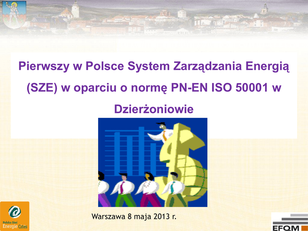 Pierwszy w Polsce System Zarządzania Energią (SZE) w oparciu o normę PN-EN ISO 50001 w Dzierżoniowie Warszawa 8 maja 2013 r. Efektywne zarządzanie energią jest jednym z warunków krytycznych do osiągnięcia sukcesu każdej działalności gospodarczej. Dla wielu organizacji najlepszym rozwiązaniem jest System Zarządzania Energią (SZE) podstawa systemowa dla systematycznego zarządzania energią. System ten zarówno wzmacniając efektywność energetyczną, może obniżyć koszty i zmniejszyć emisję gazów cieplarnianych zapewniając Państwu przewagę konkurencyjną. Standard ISO 50001: 2011 jest odzwierciedleniem najlepszych praktyk z zakresu zarządzania energią "Najbogatszym ze wszystkich ludzi jest człowiek oszczędny. Najbiedniejszym jest skąpiec." - Nicolas Sébastien Roch Chamfort Międzynarodowa Organizacja Normalizacyjna (International Organisation for Standarisation) wychodząc naprzeciw potrzebom rynkowym opracowała w 2011 normę, która ma umożliwić wprowadzenia takiego systemu. Norma ISO 50001 (zastępująca standard BS EN 16001) pozwala na systemowe stosowanie praktyk umożliwiających efektywne wykorzystywanie energii pierwotnej (zawartej w nośnikach energii pozyskiwanych bezpośrednio ze środowiska np. paliwa kopalne) jak i energii finalnej (zużywanej przez odbiorców końcowych). Zakres stosowania Norma ISO 50001: 2011 jest odpowiednia dla każdej organizacji - bez względu na jej rozmiar, branżę lub położenie geograficzne. Jest szczególnie istotny w przypadku funkcjonowania w energochłonnej gałęzi przemysłu lub w przypadku konieczności sprostania wymogom i regulacjom dotyczącym emisji gazów cieplarnianych. Certyfikacja na zgodność z ISO 50001 , będzie ostatecznym dowodem dla wszystkich stron zainteresowanych, że procesy w organizacji są zgodne z najlepszymi praktykami zarządzania energią. POLITYKA ENERGETYCZNA Dążąc do ciągłego rozwoju gospodarczo-społecznego Dzierżoniowa zobowiązuję się do podejmowania działań zmierzających do poprawy wyniku energetycznego Gminy Miejskiej Dzierżoniów oraz bezpieczeństwa energetycznego przy jednoczesnym respektowaniu zasad zrównoważonego rozwoju. Przy realizacji niniejszej Polityki zobowiązuję się do ciągłego doskonalenia procesów zarządzania energią i uzyskiwania coraz lepszych wyników energetycznych, przestrzegania wymagań prawnych oraz innych wymagań związanych z wykorzystywaniem energii. Działania Gminy ukierunkowane są w szczególności na: • racjonalne wykorzystywane energii w obiektach znajdujących się w zasobach Gminy Miejskiej Dzierżoniów, • zakup przez Urząd oraz jednostki podległe Gminie energooszczędnych produktów i usług, • zwiększanie ilości odnawialnych źródeł energii w obiektach znajdujących się w zasobach Gminy Miejskiej Dzierżoniów, • projektowaniu obiektów gminnych przy uwzględnieniu zasady racjonalnego wykorzystywania energii, • planowanie zagospodarowania przestrzennego gminy w sposób gwarantujący bezpieczeństwo energetyczne, • współpracę z podmiotami dostarczającymi energię w celu zagwarantowania bezpieczeństwa energetycznego mieszkańców, • zwiększenie efektywności i sprawności funkcjonowania oświetlenia ulicznego, • propagowaniu wśród mieszkańców racjonalnych sposobów użytkowania energii w tym wykorzystywaniu odnawialnych źródeł energii. Realizacja Polityki energetycznej uwzględniać będzie stanowiska i możliwości Gminy, naszych klientów, partnerów oraz innych zainteresowanych stron. Mając na uwadze ważność podjętych zobowiązań deklaruję osobiste zaangażowanie w celu zapewnienia dostępności informacji i zasobów niezbędnych do osiągania zaplanowanych celów i realizacji zadań. Niniejsza Polityka jest zakomunikowana społeczności lokalnej i innym zainteresowanym stronom, publicznie dostępna oraz w miarę potrzeb aktualizowana. Marek Piorun Burmistrz Dzierżoniowa Zakres i granice stosowania SZE •obiekt Urzędu Miasta w Dzierżoniowie, obiekty użyteczności publicznej należące do Gminy Miejskiej Dzierżoniów, oraz oświetlenie uliczne w Dzierżoniowie. •zakres funkcjonowania procesów prowadzonych w Urzędzie Miasta w Dzierżoniowie i w jednostkach podległych mających wpływ na wynik energetyczny Gminy Miejskiej Dzierżoniów. Mając na uwadze rolę i uprawnienia Burmistrza Dzierżoniowa Urząd Miasta jest jednostką odpowiedzialną za wdrożenie SZE i odpowiada za proces ciągłego doskonalenia, którego celem jest osiąganie coraz lepszych wyników energetycznych. W tym celu Burmistrz Dzierżoniowa stworzył ramy organizacyjne oraz zabezpieczył odpowiednie zasoby, które umożliwią wdrożenie, utrzymywanie i doskonalenie SZE Standard ISO 50001 obejmuje m.in.: •opracowanie deklaracji kierownictwa odnośnie polityki energetycznej organizacji, •przeprowadzanie przeglądów energetycznych celem analizy zużycia zasobów energetycznych, identyfikacji obszarów znaczącego wykorzystania zasobów energetycznych, identyfikacji możliwości doskonalenia efektów działalności energetycznej, •monitorowanie, pomiary oraz benchmarking efektów działalności energetycznej, •zapewnienie odpowiedniej komunikacji oraz szkoleń umożliwiających uzyskanie przez pracowników odpowiednich kompetencji, w odniesieniu do zadań powierzonych w zakresie realizacji postanowień systemu zarządzania energią, Standard ISO 50001 obejmuje cd. •wprowadzenie odpowiednich rozwiązań operacyjnych umożliwiających osiągnięcie celów zmierzających do zwiększania efektywności wykorzystywanych zasobów energetycznych, •określenie wymagań dotyczących zakupów produktów i usług jak również dostaw energii, •przejrzystość w zarządzaniu zasobami energetycznymi; •ocenę postępów we wdrażaniu efektywnych technologii energetycznych; •promocję efektywnego użytkowania energii w organizacji; •pomoc w zakresie ustalania i wdrażania dobrych praktyk w użyt