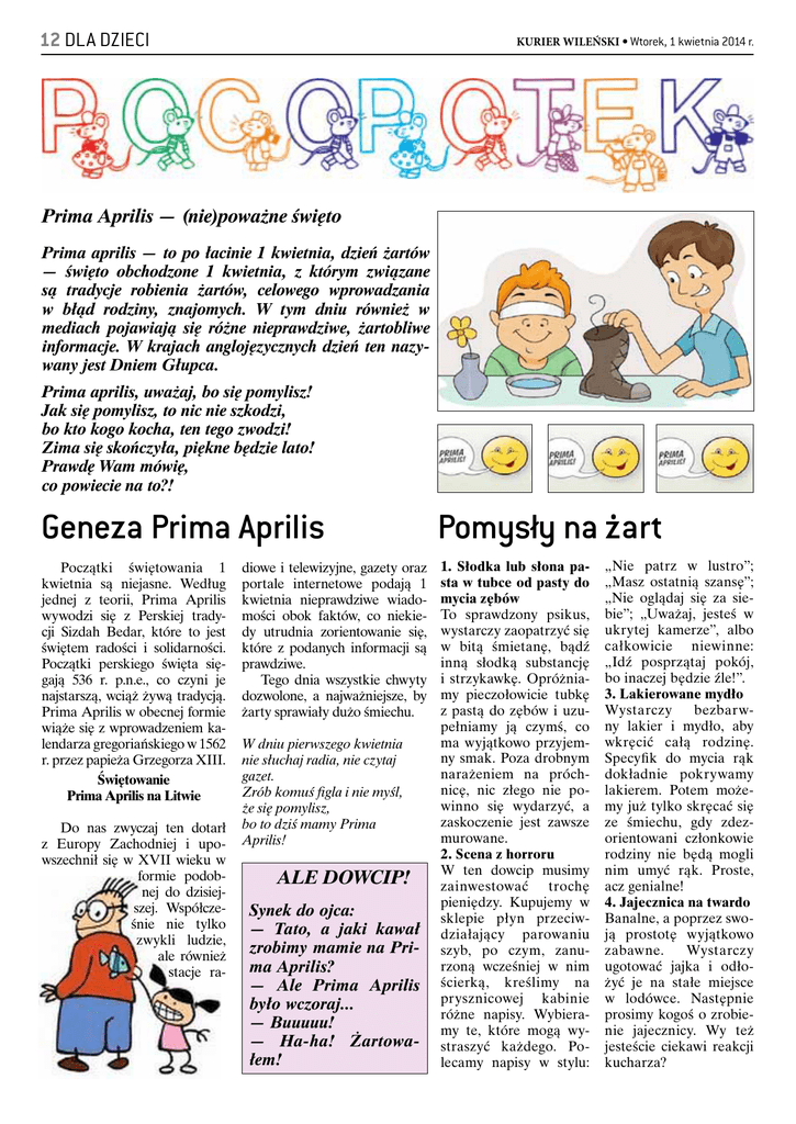 12 DLA DZIECI KURIER WILEŃSKI • Wtorek, 1 kwietnia 2014 r. Prima Aprilis — (nie)poważne święto Prima aprilis — to po łacinie 1 kwietnia, dzień żartów — święto obchodzone 1 kwietnia, z którym związane są tradycje robienia żartów, celowego wprowadzania w błąd rodziny, znajomych. W tym dniu również w mediach pojawiają się różne nieprawdziwe, żartobliwe informacje. W krajach anglojęzycznych dzień ten nazywany jest Dniem Głupca. Prima aprilis, uważaj, bo się pomylisz! Jak się pomylisz, to nic nie szkodzi, bo kto kogo kocha, ten tego zwodzi! Zima się skończyła, piękne będzie lato! Prawdę Wam mówię, co powiecie na to?! Geneza Prima Aprilis Początki świętowania 1 kwietnia są niejasne. Według jednej z teorii, Prima Aprilis wywodzi się z Perskiej tradycji Sizdah Bedar, które to jest świętem radości i solidarności. Początki perskiego święta sięgają 536 r. p.n.e., co czyni je najstarszą, wciąż żywą tradycją. Prima Aprilis w obecnej formie wiąże się z wprowadzeniem kalendarza gregoriańskiego w 1562 r. przez papieża Grzegorza XIII. Świętowanie Prima Aprilis na Litwie Do nas zwyczaj ten dotarł z Europy Zachodniej i upowszechnił się w XVII wieku w formie podobnej do dzisiejszej. Współcześnie nie tylko zwykli ludzie, ale również stacje ra- diowe i telewizyjne, gazety oraz portale internetowe podają 1 kwietnia nieprawdziwe wiadomości obok faktów, co niekiedy utrudnia zorientowanie się, które z podanych informacji są prawdziwe. Tego dnia wszystkie chwyty dozwolone, a najważniejsze, by żarty sprawiały dużo śmiechu. W dniu pierwszego kwietnia nie słuchaj radia, nie czytaj gazet. Zrób komuś figla i nie myśl, że się pomylisz, bo to dziś mamy Prima Aprilis! ALE DOWCIP! Synek do ojca: — Tato, a jaki kawał zrobimy mamie na Prima Aprilis? — Ale Prima Aprilis było wczoraj... — Buuuuu! — Ha-ha! Żartowałem! Pomysły na żart 1. Słodka lub słona pasta w tubce od pasty do mycia zębów To sprawdzony psikus, wystarczy zaopatrzyć się w bitą śmietanę, bądź inną słodką substancję i strzykawkę. Opróżniamy pieczołowicie tubkę z pastą do zębów i uzupełniamy ją czymś, co ma wyjątkowo przyjemny smak. Poza drobnym narażeniem na próchnicę, nic złego nie powinno się wydarzyć, a zaskoczenie jest zawsze murowane. 2. Scena z horroru W ten dowcip musimy zainwestować trochę pieniędzy. Kupujemy w sklepie płyn przeciwdziałający parowaniu szyb, po czym, zanurzoną wcześniej w nim ścierką, kreślimy na prysznicowej kabinie różne napisy. Wybieramy te, które mogą wystraszyć każdego. Polecamy napisy w stylu: „Nie patrz w lustro”; „Masz ostatnią szansę”; „Nie oglądaj się za siebie”; „Uważaj, jesteś w ukrytej kamerze”, albo całkowicie niewinne: „Idź posprzątaj pokój, bo inaczej będzie źle!”. 3. Lakierowane mydło Wystarczy bezbarwny lakier i mydło, aby wkręcić całą rodzinę. Specyfik do mycia rąk dokładnie pokrywamy lakierem. Potem możemy już tylko skręcać się ze śmiechu, gdy zdezorientowani członkowie rodziny nie będą mogli nim umyć rąk. Proste, acz genialne! 4. Jajecznica na twardo Banalne, a poprzez swoją prostotę wyjątkowo zabawne. Wystarczy ugotować jajka i odłożyć je na stałe miejsce w lodówce. Następnie prosimy kogoś o zrobienie jajecznicy. Wy też jesteście ciekawi reakcji kucharza? DLA DZIECI 13 KURIER WILEŃSKI • Wtorek, 1 kwietnia 2014 r. Uwaga — czas letni! Przywykliśmy już do tego, że dwa razy w roku przestawiamy nasze zegarki i albo wstajemy wcześniej, albo śpimy o godzinę dłużej. Ale kto i kiedy wymyślił zmianę czasu? Zmiana czasu z zimowego na letni i odwrotnie to niemiecki wynalazek. Pierwszy raz zegarki o godzinę w przód przesunęli podczas I wojny światowej, dokładnie 30 kwietnia 1916 roku. A 1 października 1916 roku znów cofnęli je o godzinę. Wkrótce w ślady Niemiec poszli Anglicy, a 19 marca 1918 r. Kongres Stanów Zjednoczonych ustalił podział na strefy czasowe w USA i wprowadził na czas trwania wojny obowiązek stosowania czasu letniego. Miało to na celu oszczędności paliwa służącego do produkcji energii elektrycznej. Kilka ciekawostek związanych ze zmianą czasu na letni • Są kraje, które sto- sowały zmianę czasu, ale z biegiem czasu zaprzestały. Tak stało się w Rosji, gdy w 2011 roku prezydent Miedwiediew zrezygnował z przestawiania zegarów. W Europie wskazówek zegarów nie przestawiają też na Islandii i w Białorusi. • Zdaniem szwedzkich naukowców zmiana czasu z zimowego na letni jest niezdrowa dla serca człowieka. Z ich badań wynika, że zmianie czasu na letni towarzyszy wzrost zawałów serca! • Zmiana czasu z zimowego na letni wpływa jednak pozytywnie na nasze samopoczucie. Mamy możliwość dłuższego obcowania ze słońcem, a co za tym idzie — światło słoneczne pobudza wytwarzanie krwinek w organizmie oraz wzmacnia przemianę materii! • Pierwszą osobą na świecie, która wpadła na pomysł zmiany czasu z zimowego na letni i zaczęła postulować w tej sprawie, był Beniamin Franklin. REBUS: Co to za piękne wiosenne kwiatki? P OK OL OR U J!!! Książka to najlepszy przyjaciel Czarne koty i Prima Aprilis. Skąd się wzięły przesądy w naszym życiu? Autorstwa Olivera Harry’ego Gdy czarny kot przebiegnie nam drogę, skręcamy wtedy w bok, albo zawracamy. Na widok kominiarza łapiemy się za guzik. Aktorowi przed spektaklem życzymy połamania nóg. A gdy zbijemy lustro… pukamy w niemalowane drewno. Do dziś konstruktorzy mostów wrzucają do zaprawy kilka groszy, gdyż ma to chronić most i przynosić szczęście podróżującym. Bokserzy spluwają przed walką w rękawicę, a piłkarze zakładają najpierw lewy but. W XXI wieku żyjemy nadal otoczeni przez przesądy, odczytujemy złowróżbne znaki na niebie, zaklinamy dobry los, sięgając po podkowę z siedmioma otworami bądź czterolistną koniczynę. Ta książeczka to un