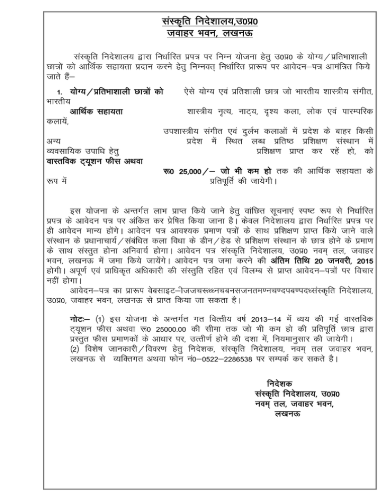 laLd`fr funs'kky; }kjk fu/kkZfjr izi= ij fuEu ;kstuk gsrq m0iz0 ds ;ksX;@izfrHkk'kkyh