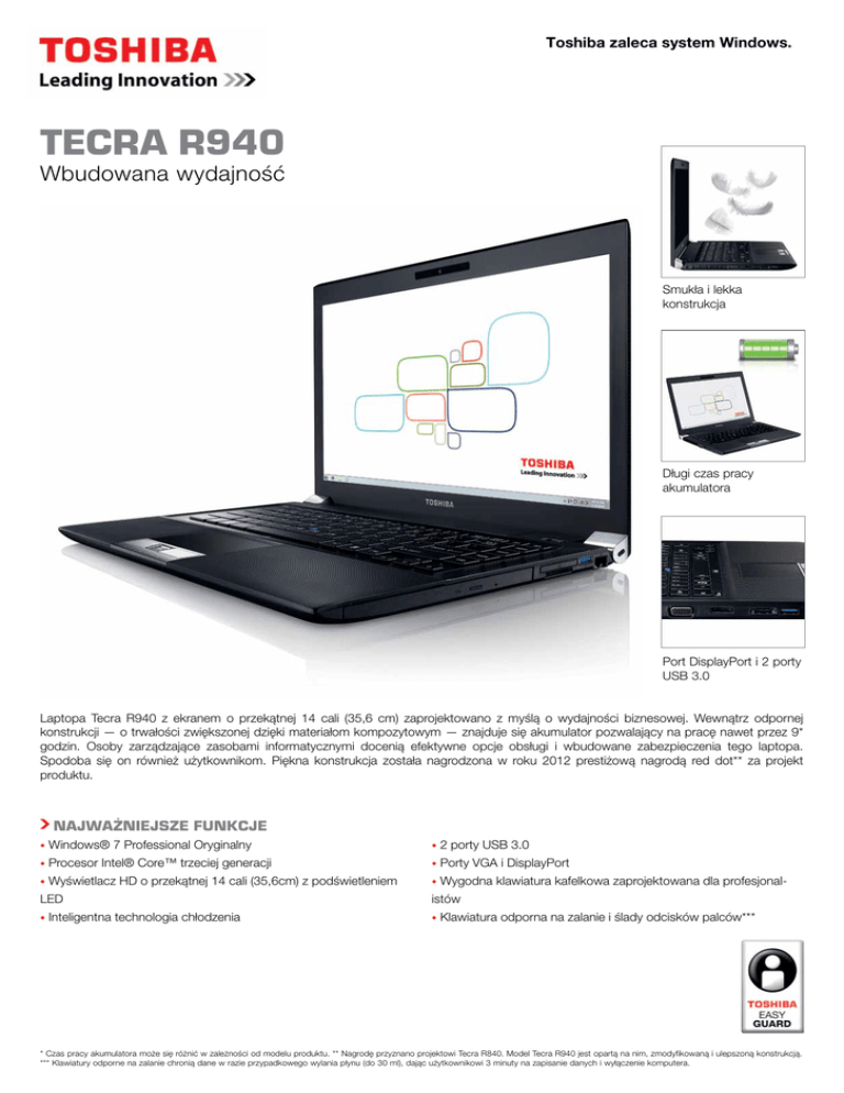 Toshiba zaleca system Windows. TECRA R940 Wbudowana wydajność Smukła i lekka konstrukcja Długi czas pracy akumulatora Port DisplayPort i 2 porty USB 3.0 Laptopa Tecra R940 z ekranem o przekątnej 14 cali (35,6 cm) zaprojektowano z myślą o wydajności biznesowej. Wewnątrz odpornej konstrukcji — o trwałości zwiększonej dzięki materiałom kompozytowym — znajduje się akumulator pozwalający na pracę nawet przez 9* godzin. Osoby zarządzające zasobami informatycznymi docenią efektywne opcje obsługi i wbudowane zabezpieczenia tego laptopa. Spodoba się on również użytkownikom. Piękna konstrukcja została nagrodzona w roku 2012 prestiżową nagrodą red dot** za projekt produktu. NAJWAŻNIEJSZE FUNKCJE • Windows® 7 Professional Oryginalny • 2 porty USB 3.0 • Procesor Intel® Core™ trzeciej generacji • Porty VGA i DisplayPort • Wyświetlacz HD o przekątnej 14 cali (35,6cm) z podświetleniem • Wygodna klawiatura kafelkowa zaprojektowana dla profesjonal- LED • Inteligentna technologia chłodzenia istów • Klawiatura odporna na zalanie i ślady odcisków palców*** * Czas pracy akumulatora może się różnić w zależności od modelu produktu. ** Nagrodę przyznano projektowi Tecra R840. Model Tecra R940 jest opartą na nim, zmodyfikowaną i ulepszoną konstrukcją. *** Klawiatury odporne na zalanie chronią dane w razie przypadkowego wylania płynu (do 30 ml), dając użytkownikowi 3 minuty na zapisanie danych i wyłączenie komputera. Tecra R940-1RQ PT43GE-0E204UPL Procesor/ Technologia Procesor Intel® Core™ i5-3340M vPro™ trzeciej generacji z technologią Intel® Turbo Boost 2.0 (2,70/3,40 Turbo GHz, 3 MB Pamięć podręczna trzeciego poziomu) System operacyjny / platforma Windows® 7 Professional (w wersji 64-bitowej; preinstalowany) oraz Windows 8 Pro (w wersji 64-bitowej; na dysku DVD) Grafitowa czerń z rowkowaną fakturą wykończenia i czarna, matowa klawiatura Kolor obudowy Ekran 14,0 cala (35,6cm) Wyświetlacz nieodblaskowy Toshiba HD o wysokiej jasności i proporcjach 16: 9 z podświetleniem LED, Rozdzielczość wewnętrzna: 1 366 x 768 500 GB (7,200 obr./min) Serial ATA Dysk twardy 4096 (1x) MB, Możliwość rozszerzenia do: 8,192 MB, Technologia: DDR3 RAM (1600 MHz) Pamięć systemowa Urządzenia optyczne Stacja dysków DVD Super Multi (Double Layer) Karta graficzna Intel® HD Graphics 4000, Do 1696 MB pamięci wspólnej przy zainstalowanych 4 GB pamięci systemowej (w preinstalowanym 64-bitowym systemie operacyjnym) Urządzenie wskazujące DualPoint Komunikacja przewodowa Gigabit Ethernet LAN Komunikacja bezprzewodowa Bluetooth® 4.0 + LE (Intel®), Bezprzewodowa sieć LAN 802.11a/b/g/n (Intel®), UMTS/3G (HSDPA 14,4 Mb/s, HSPA Evolution 21 Mb/s, HSUPA 5,76 Mb/s) UMTS/HSPA o częstotliwości 2100 MHz oraz cztery pasma GSM/GPRS/EDGE o częstotliwości 850/900/1800/1900 MHz (Ericsson), Intel® Wireless Display (Intel®) System dźwiękowy Wbudowane głośniki stereofoniczne z dźwiękiem ulepszonym dzięki technologii SRS Premium Sound HD™ , Pokrętło regulacji głośności: za pomocą funkcji klawiszy dostępu, Realtek (ALC269Q-VB5-GR) Interfejsy 1 x Wejście zasilające (prąd stały) , 1 x RJ-45 , 1 x wejście mikrofonu zewnętrznego , 1 x Wyjście monitora zewnętrznego , 1 x DisplayPort , 1 x wyjście słuchawkowe (stereofoniczne) , 1 (z lewej strony) x Port eSATA/USB 2.0 z funkcją USB Sleep-and-Charge , 1 (z prawej) x USB 3,0 , 1 x Czytnik wielu formatów kart (obsługujący karty SD™ o pojemności do 2 GB, miniSD™/microSD™ z adapterem do 2 GB, SDHC™ do 32 GB, SDXC™ do 64 GB i MultiMedia Card™ do 2 GB) , 1 x Zintegrowana kamera internetowa HD o rozdzielczości 1 megapiksela (1280 x 800) z wbudowanym mikrofonem , 1 (z lewej strony) x USB 3,0 Rozbudowa 2 gniazda pamięci (brak dostępnych do skonfigurowania), 1 Złącze ultraszybkiego replikatora portów II firmy Toshiba, 1 Gniazdo Express Card™ (34 mm) Akumulator Technologia: Litowo-jonowy, 6 ogniw, Do 9 godzin (Mobile Mark™ 2007) ZGODNE AKCESORIA FIRMY TOSHIBA ••Torba Premium na laptopy o przekątnej 16 cali (40,6 cm), PX1787E-1NCA ••Bezprzewodowa mysz optyczna firmy Toshiba 2,4 GHz — czarna, PA3844E1ETB ••Ultraszybki replikator portów II, PA3916E-1PRC Ultraszybki replikator portów II Torba Premium na laptopy do 16 cali (40,6 cm) Mysz optyczna R300 — czarna Wydajność procesora może być różna od podanych specyfikacji w określonych warunkach, na przykład podczas używania akumulatora zamiast zasilania sieciowego, w przypadku używania urządzeń zewnętrznych, aplikacji multimedialnych lub połączeń sieciowych i oprogramowania do modelowania złożonego, a także w obszarach o niskim ciśnieniu atmosferycznym spowodowanym dużą wysokością (1000 metrów nad poziomem morza) i/lub w pewnych temperaturach. Różnice w wydajności procesora mogą być również spowodowane konfiguracją konstrukcji. W pewnych sytuacjach komputer może zostać automatycznie zamknięty w ramach standardowej procedury zabezpieczającej. Aby zminimalizować ryzyko utraty danych, należy wykonywać okresowe kopie zapasowe. W celu osiągnięcia optymalnej wydajności należy używać komputera tylko w zalecanych warunkach. Aby uzyskać szczegółowe informacje o ograniczeniach, należy skorzystać z przewodnika po produktach w witrynie sieci Web firmy Toshiba: www.computers.toshiba-europe.com i/lub skontaktować się z pomocą techniczną firmy Toshiba. - Wydajność procesora graficznego (GPU) może się różnić w zależności od modelu produktu, konfiguracji konstrukcji, używanych aplikacji, ustawień zarządzania energią oraz wykorzystywanych funkcji. - Część głównej pamięci systemowej może być używana przez system graficzny, co zmniejsza ilość dostępnej głównej pamięci systemowej. - W przypadku komputera w konfiguracji z 4 GB pamięci systemowej całkowity obszar pamięci na obliczenia będzie znacznie mniejszy i będzie się różnić w