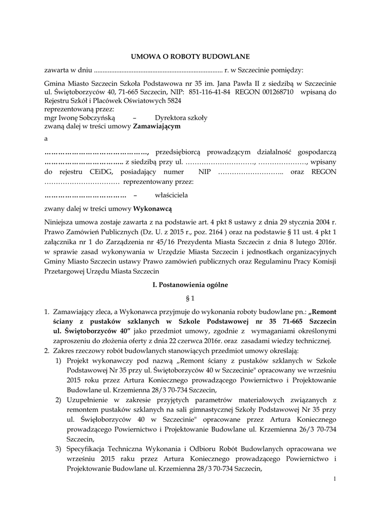 UMOWA O ROBOTY BUDOWLANE zawarta w dniu ........................................................................... r. w Szczecinie pomiędzy: Gmina Miasto Szczecin Szkoła Podstawowa nr 35 im. Jana Pawła II z siedzibą w Szczecinie ul. Świętoborzyców 40, 71-665 Szczecin, NIP: 851-116-41-84 REGON 001268710 wpisaną do Rejestru Szkół i Placówek Oświatowych 5824 reprezentowaną przez: mgr Iwonę Sobczyńską – Dyrektora szkoły zwaną dalej w treści umowy Zamawiającym a ………………………………………, przedsiębiorcą prowadzącym działalność gospodarczą …………………………….. z siedzibą przy ul. …………………………, …………………, wpisany do rejestru CEiDG, posiadający numer NIP ……………………….. oraz REGON …………………………… reprezentowany przez: ……………………………… – właściciela zwany dalej w treści umowy Wykonawcą Niniejsza umowa zostaje zawarta z na podstawie art. 4 pkt 8 ustawy z dnia 29 stycznia 2004 r. Prawo Zamówień Publicznych (Dz. U. z 2015 r., poz. 2164 ) oraz na podstawie § 11 ust. 4 pkt 1 załącznika nr 1 do Zarządzenia nr 45/16 Prezydenta Miasta Szczecin z dnia 8 lutego 2016r. w sprawie zasad wykonywania w Urzędzie Miasta Szczecin i jednostkach organizacyjnych Gminy Miasto Szczecin ustawy Prawo zamówień publicznych oraz Regulaminu Pracy Komisji Przetargowej Urzędu Miasta Szczecin I. Postanowienia ogólne §1 1. Zamawiający zleca, a Wykonawca przyjmuje do wykonania roboty budowlane pn.: „Remont ściany z pustaków szklanych w Szkole Podstawowej nr 35 71-665 Szczecin ul. Świętoborzyców 40” jako przedmiot umowy, zgodnie z wymaganiami określonymi zaproszeniu do złożenia oferty z dnia 22 czerwca 2016r. oraz zasadami wiedzy technicznej. 2. Zakres rzeczowy robót budowlanych stanowiących przedmiot umowy określają: 1) Projekt wykonawczy pod nazwą „Remont ściany z pustaków szklanych w Szkole Podstawowej Nr 35 przy ul. Świętoborzyców 40 w Szczecinie" opracowany we wrześniu 2015 roku przez Artura Koniecznego prowadzącego Powiernictwo i Projektowanie Budowlane ul. Krzemienna 28/3 70-734 Szczecin, 2) Uzupełnienie w zakresie przyjętych parametrów materiałowych związanych z remontem pustaków szklanych na sali gimnastycznej Szkoły Podstawowej Nr 35 przy ul. Święłoborzyców 40 w Szczecinie" opracowane przez Artura Koniecznego prowadzącego Powiernictwo i Projektowanie Budowlane ul. Krzemienna 26/3 70-734 Szczecin, 3) Specyfikacja Techniczna Wykonania i Odbioru Robót Budowlanych opracowana we wrześniu 2015 raku przez Artura Koniecznego prowadzącego Powiernictwo i Projektowanie Budowlane ul. Krzemienna 28/3 70-734 Szczecin, 1 4) Zaproszenie do złożenia oferty z dnia 22.06.2016r. Znak: SP35/MŻ-1/2016 5) Oferta wykonawcy, której kopia stanowi załącznik nr 1 do umowy 1. 2. 1. 2. §2 Wykonawca oświadcza, że zapoznał się z dokumentami dotyczącymi wykonania przedmiotu umowy, nie wnosi do nich uwag i uznaje je za podstawę do realizacji przedmiotu niniejszej umowy. Przedmiot umowy zostanie wykonany w całości z materiałów dostarczonych przez Wykonawcę spełniających wymagania jakościowe i techniczne dla tego rodzaju robót. §3 Zamawiającego na terenie budowy reprezentować będzie Marek Żukowski – kierownik obiektów sportowych Przedstawiciel Zamawiającego działa w granicach umocowania nadanego przez Zamawiającego. §4 1) Przedstawicielem Wykonawcy na budowie będzie kierownik robót …………………………………. posiadający uprawnienia budowlane w specjalności konstrukcyjno - budowlanej nr ………………………………. wydane w dniu …………………………………r. 2) Wykonawca zobowiązany jest zapewnić osobistą obecność kierownika robót na terenie budowy co najmniej trzy razy w tygodniu. §5 Przedmiot umowy zostanie wykonany własnymi siłami przez wykonawcę. II. Prawa i obowiązki stron umowy §6 1. Poza innymi obowiązkami wynikającymi z treści umowy, do obowiązków Zamawiającego należy: 1) protokolarne przekazanie Wykonawcy terenu robót budowlano – remontowych ( zwanych dalej robotami ), 2) dokonanie odbioru końcowego wykonanych robót. 2. Poza innymi obowiązkami wynikającymi z treści umowy, do obowiązków Wykonawcy należy: 1) dostarczenie Zamawiającemu, na moment podpisania umowy, oświadczenia o podjęciu obowiązków kierownika robót przez osobę wskazaną w § 4, uwierzytelnionej kopii zaświadczenia właściwej izby samorządu zawodowego potwierdzającego wpis ww. osoby na listę członków tej izby i uwierzytelnionej kopii uprawnień budowlanych; 2) protokolarne przejęcie od Zamawiającego terenu budowy; 3) przeprowadzenie robót przygotowawczych na terenie objętym przedmiotem zamówienia, roboty rozbiórkowe i porządkowe; 2 4) dostarczenie i uzyskanie akceptacji Zamawiającego, w terminie 7 dni od daty podpisania umowy, szczegółowego harmonogramu rzeczowo-finansowego robót (harmonogram rzeczowo-finansowy powinien zawierać elementy robót, terminy ich wykonania i wartości - opisane i wyliczone w kosztorysie ofertowym); 5) szczelne wygrodzenie miejsca realizacji robót od terenu jednostki oświatowej w sposób uniemożliwiający dostęp osób trzecich ze szczególnym uwzględnieniem dzieci i młodzieży; 6) zapewnienie ochrony mienia znajdującego się na terenie budowy, w szczególności pod względem przeciwpożarowym; 7) oznaczenie terenu budowy oraz odpowiednie oznakowanie i zabezpieczenie miejsc prowadzenia robót, wygrodzenie stref niebezpiecznych - zgodnie z obowiązującymi przepisami; 8) przeprowadzenie odbiorów przewidzianych warunkami technicznymi wykonania i odbioru robót budowlano – montażowych na własny koszt; 9) uzyskanie zatwierdzenia materiałów budowlanych przed wbudowaniem udzielanego przez przedstawiciela Zamawiającego - oraz przekazywanie mu na bieżąco: certyfikatów na znak bezpieczeństwa, deklaracji zgodności wyro