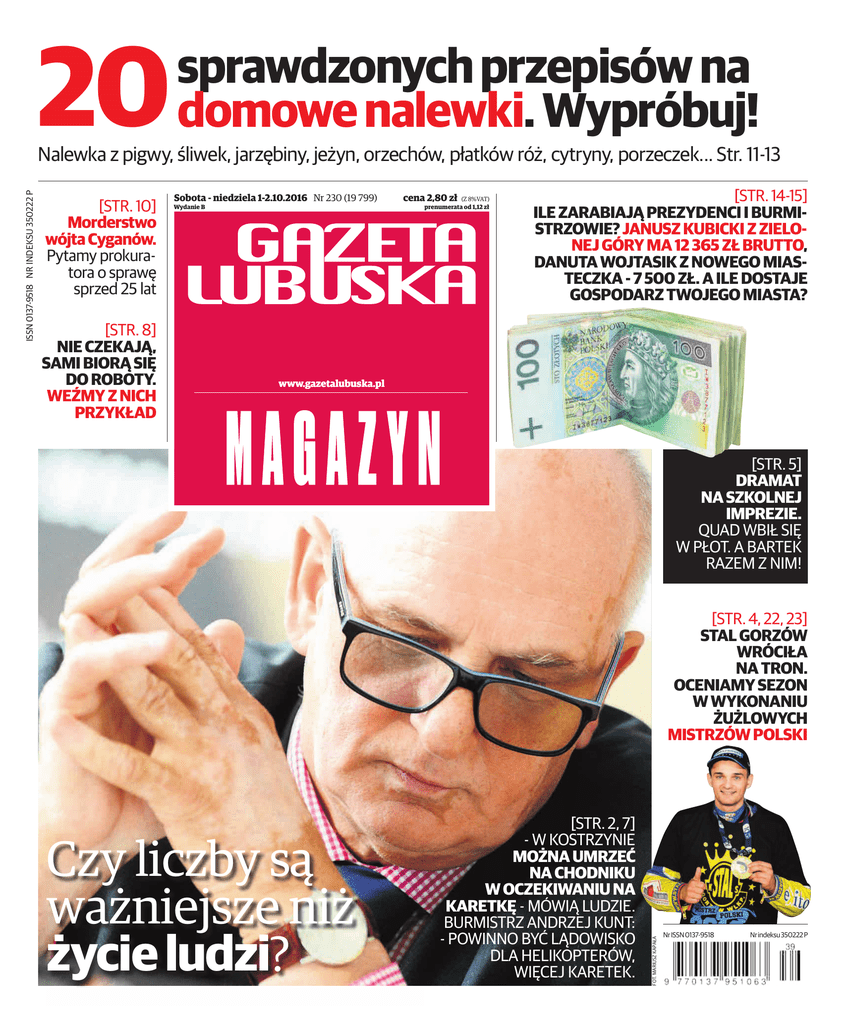 20 sprawdzonych przepisów na domowe nalewki. Wypróbuj! [STR. 10] Morderstwo wójta Cyganów. Pytamy prokuratora o sprawę sprzed 25 lat [STR. 8] NIE CZEKAJĄ, SAMI BIORĄ SIĘ DO ROBOTY. WEŹMY Z NICH PRZYKŁAD Sobota - niedziela 1-2.10.2016 Nr 230 (19 799) Wydanie B cena 2,80 zł (Z 8%VAT) prenumerata od 1,12 zł [STR. 14-15] ILE ZARABIAJĄ PREZYDENCI I BURMISTRZOWIE? JANUSZ KUBICKI Z ZIELONEJ GÓRY MA 12 365 ZŁ BRUTTO, DANUTA WOJTASIK Z NOWEGO MIASTECZKA - 7 500 ZŁ. A ILE DOSTAJE GOSPODARZ TWOJEGO MIASTA? www.gazetalubuska.pl [STR. 5] DRAMAT NA SZKOLNEJ IMPREZIE. QUAD WBIŁ SIĘ W PŁOT. A BARTEK RAZEM Z NIM! [STR. 4, 22, 23] STAL GORZÓW WRÓCIŁA NA TRON. OCENIAMY SEZON W WYKONANIU ŻUŻLOWYCH MISTRZÓW POLSKI Czy liczby są ważniejsze niż życie ludzi? [STR. 2, 7] - W KOSTRZYNIE MOŻNA UMRZEĆ NA CHODNIKU W OCZEKIWANIU NA KARETKĘ - MÓWIĄ LUDZIE. BURMISTRZ ANDRZEJ KUNT: - POWINNO BYĆ LĄDOWISKO DLA HELIKOPTERÓW, WIĘCEJ KARETEK. FOT. MARIUSZ KAPAŁA ISSN 0137-9518 NR INDEKSU 350222 P Nalewka z pigwy, śliwek, jarzębiny, jeżyn, orzechów, płatków róż, cytryny, porzeczek... Str. 11-13 Nr ISSN 0137-9518 Nr indeksu 350222 P Gazeta Lubuska Sobota–niedziela, 1–2 października 2016 www.gazetalubuska.pl pogoda na weekend 1-2.10.2016 Rusz się. Dwie propozycje na weekend NIEDZIELA PONIEDZIAŁEK FOT. MONOLITH FILMS SOBOTA FOT. HUBERT KOMERSKI/AURUM FILM 02// Peryskop Region Imieniny – sobota: Danuta, Jan, Julia, Remigiusz, Roman, Teresa niedziela: Aleksandra, Antoni, Ursycyn, Teofil Kalendarium A 1905 – 111 lat temu. 1 października wmurowano kamień węgielny pod kościół św. Krzyża w Gorzowie. A 1945 – 71 lat temu. 1 października w Zielonej Górze uruchomiono pierwszą polską szkołę zawodową. A 1957 – 59 lat temu. 1 października ukazał się pierwszy numer czasopisma „Nadodrze”. A 1976 – 40 lat temu. 2 października zmarł Paweł Duda, gorzowski adwokat i działacz TRZZ. A 1989 – 27 lat temu. 2 października zmarł dr Edmund Florczak, ordynator oddziału dziecięcego szpitala w Międzyrzeczu. MAX MIN. MAX MIN. MAX MIN. 18 13 18 14 14 9 W sobotę zachmurzenie całkowite, lokalnie niewielki deszcz. W niedzielę rozpogodzi się, nie powinno padać. Od poniedziałku ochłodzenie. KINO „Żywioł. Deepwater Horizon”: Mark Walhberg, John Malkovich, Kurt Russell w starciu ze sztormem i pożarem atakującymi olbrzymią platformę wiertniczą w Zatoce Meksykańskiej. (HAK) KINO „Ostatnia rodzina” – wielki zwycięzca festiwalu filmowego w Gdyni! Opowieść o malarzu Zdzisławie Beksińskim, jego żonie Zofii i synu Tomaszu – tłumaczu, prowadzącym audycje w radiowej Trójce. (HAK) Statystyki są ważniejsze od potrzeb? Tydzień z „Gazetą Lubuską” Komentarz Iwona Zielińska redaktor naczelna FOT. MARIUSZ KAPAŁA FOT. TOMASZ GAWAŁKIEWICZ O Poniedziałek Mamy to! Żużlowcy Stali Gorzów wywalczyli złoto Poniedziałek Tak miało być. Falubaz Zielona Góra zgarnął brązowy medal A W rewanżowym spotkaniu finału ekstraligi pokonali u siebie Get Well Toruń 51:39. A Żużlowcy po raz drugi w małym finale wygrali ze Spartą Wrocław, tym razem u siebie 49:41. FOT. ALICJA KUCHARSKA Wtorek Środa A Urszula Januszewska z niepełnosprawną córką Karoliną mieszkają w domu w Ownicach, w którym nie ma połowy dachu. Ich dochód, niespełna 2000 zł, wystarcza na opłaty, leki i skromne jedzenie. A Wanda Koberecka z Gorzowa skończyła 105 lat. Jej recepta na długowieczność? – Być miłym, towarzyskim , lubić słodycze i wino – podpowiada rodzina. Pani Wanda urodziła się w Buczaczu. A Starszy posterunkowy Dawid Dubiel i sierżant Rafał Sowiński ze Świebodzina nocą odnaleźli na łące mężczyznę, który wpadł do rowu z wodą i nie mógł się wydostać. Uratowali mu życie. W obiektywie FOT. MICHAŁ DYJUK FOT. PIOTR JĘDZURA M protestować. Słyszą przecież, że ich głos jest wysłuchiwany i prawo zmienia się, by było lepiej. Tak się zastanawiam, do kogo mają się zwrócić na przykład obywatele z Kostrzyna nad Odrą – gdzie od lat brakuje karetki. Gdzie w ostatnim czasie doszło do dramatycznych przypadków, w tym jednego śmiertelnego, bo karetek z obsadą medyczną jest za mało. A te, które są dostępne na innych terenach, pracowały pełną parą. Na miasto Kostrzyn jest tylko jedna. Pisaliśmy o tym wielokrotnie. Niestety, okazuje się, że to martwe liczby statystyczne – m.in. gęstość zaludnienia, czas dojazdu, wielkość terenu – decydują, ile ma być karetek. W tym przypadku ponoć wszystko zgodne jest z prawem i przepisami. Tylko że to nie statystyki decydują, gdzie i kiedy, i kto dostanie zawału serca, gdzie i kiedy wydarzy się wypadek. Piszemy o tym na str. 7. a ¹ Środa Czwartek Czwartek A James Florence ma być jednym z liderów Stelmetu BC Zielona Góra, który broni tytułu koszykarskiego mistrza Polski. Przed sezonem drużyna w komplecie pokazała się kibicom podczas prezentacji. A 15-latek zmarł w szpitalu, 17-latek stanie przed sądem. Taki jest finał wypadku, do jakiego doszło pod Kożuchowem. Chłopcy, zamiast być w szkole, szaleli mazdą. Za kółkiem siedział 17-latek. A Zmiany w rządzie stały się faktem. Beata Szydło odwołała ministra finansów Pawła Szałamachę. Zastąpi go Mateusz Morawiecki, który stanie też na czele Komitetu Ekonomicznego Rady Ministrów. FOT. WIESŁAW WODECKI FOT. RENATA HRYNIEWICZ FOT. JAROSŁAW MIŁKOWSKI W Wtorek FOT. MARIUSZ KAPAŁA d wielu lat jesień jest czasem manifestacji przed budynkami Sejmu, rządu. Nie dziwi nas to już za bardzo. Od lat te same grupy zawodowe zjeżdżają się do Warszawy i żądają zmiany swojej sytuacji. Najczęściej robią to przedstawiciele zawodów medycznych. 1 października jest Międzynarodowy Dzień Lekarza, a kilka dni przed swoim świętem przez ulice stolicy przemaszerowali młodzi medycy z hasłami: „Dziś jesteśmy w Polsce, a jeśli nic się nie zmieni – wyjedziemy”. Albo „Pogotowie 