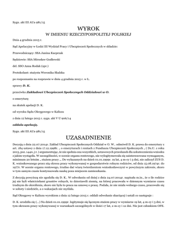 Sygn. akt III AUa 981/15 WYROK W IMIENIU RZECZYPOSPOLITEJ POLSKIEJ Dnia 4 grudnia 2015 r. Sąd Apelacyjny w Łodzi III Wydział Pracy i Ubezpieczeń Społecznych w składzie: Przewodniczący: SSA Janina Kacprzak Sędziowie: SSA Mirosław Godlewski del. SSO Anna Rodak (spr.) Protokolant: stażysta Weronika Skalska po rozpoznaniu na rozprawie w dniu 4 grudnia 2015 r. w Ł. sprawy D. K. przeciwko Zakładowi Ubezpieczeń Społecznych Oddziałowi w O. o emeryturę na skutek apelacji D. K. od wyroku Sądu Okręgowego w Kaliszu z dnia 12 lutego 2015 r. sygn. akt V U 906/14 oddala apelację. Sygn. akt III AUa 981/15 UZASADNIENIE Decyzją z dnia 22.07.2014r. Zakład Ubezpieczeń Społecznych Oddział w O. W.. odmówił D. K. prawa do emerytury z art. 184 ustawy z dnia 17.12.1998r. „ o emeryturach i rentach z Funduszu Ubezpieczeń Społecznych „ ( Dz.U. z roku 2013, poz. 1440, j.t. ) argumentując, że nie spełnia ona wszystkich, ustawowych przesłanek dla uskutecznienia wniosku z jakim wystąpiła. W szczególności, w ocenie organu rentowego, nie wylegitymowała się zainteresowana wymaganym, minimum 20 letnim „ stażem pracy „. Do wykazanych na dzień 01.01.1999r. 19 lat, 4 m-cy i 3 dni, nie zaliczył ZUS D. K. wnioskowanego przez nią okresu pracy wykonywanej w gospodarstwie rolnym rodziców, od dnia 15.08.1974r. do 1977r. W ocenie organu rentowego, trudno dać wiarę twierdzeniom wnioskodawczyni w powyższym zakresie, skoro w tym samym czasie kontynuowała naukę poza miejscem zamieszkania. Z decyzją powyższą nie zgodziła się D. K.. W odwołaniu od dniej z dnia 24.07.2014r. napisała m.in., że o ile rodzice jej nie byli właścicielami gruntów rolnych, to dzierżawili ziemię, na której pracowała w dziennym wymiarze czasu trudnym do określenia, skoro nie była to praca na umowę o pracę. Podała, że nie miała wolnego czasu, pracowało się w soboty i niedziele, a o wakacjach nie myślała. Sąd Okręgowy w Kaliszu wyrokiem z dnia 12 lutego 2015 r. oddali odwołanie skarżącej i ustali co następuje : D. K. urodziła się (...) Na dzień 01.01.1999r. legitymuje się łącznym stażem pracy w wymiarze 19 lat, 4 m-cy i 3 dni, w tym okresem pracy wykonywanej w warunkach szczególnych w ilości 17 lat, 2 m-cy i 12 dni. Nie jest członkiem OFE. W okresie od 26.06.1959 roku , do 18.02.1985r. D. K. zamieszkiwała w miejscowości C.. Ojciec odwołującej – M. I. (1), zawarł w dniu 01.09.1971r. z Gromadzką Radą Narodową umowę dzierżawy. Na jej podstawie objął we władanie grunty orne o powierzchni 0,25 ha., na okres lat 5-ciu. Wcześniej, bo w dniu 02.01.1971r., jako pracownik (...), zawarł ze swoim pracodawca umową dzierżawy działki gruntu o powierzchni 1610 metrów kwadratowych, przyległej do budynku stacyjnego w którym rodzina I. zamieszkiwała. W roku następnym, dnia 15.03.1972r., zawarł ojciec odwołującej kolejną umowę dzierżawy. Na okres lat 7 stał się dzierżawcą gruntu rolnego o powierzchni 0,80 ha, którego właścicielem był S. C., zamieszkały w miejscowości C.. dowód : poświadczeni zamieszkiwania, umowy dzierżawy – akta organu rentowego. D. K. szkołę podstawową ukończyła w roku 1973r. W tym samym roku rozpoczęła naukę w Liceum Ogólnokształcącym, w odległym od C. o 12-15 km. J.. Do szkoły dojeżdżała pociągiem, co zajmowało jej ok. 15 minut. Zamieszkiwała wówczas z rodzicami oraz rodzeństwem starszą o cztery lata siostrą oraz starszym o 6 lat bratem. Rodzina I. zajmowała lokal mieszkalny tj. mieszkanie zakładowe (...). Ociec odwołującej – M. I. (1), pracował na stacji PKP w C., jako kasjer, dyżurny ruchu. Matka nigdzie nie pracowała. W połowie lat 70 tych matka chorowała, pracę zawodową podjęła w roku 1977. W roku 1974 siostra wnioskodawczyni opuściła rodzinny dom. Wyjechała do P., tam kontynuując naukę. Do C. nie wróciła. Brat D. M. I. pracował wówczas w (...), w odległej o ok. 30 kilometrów od W.. Do pracy dojeżdżał pociągiem, który odjeżdżał przed godziną szóstą rano. W roku 1975 opuścił dom rodzinny. Zamieszkał w domu swojej narzeczonej, również w C.. Pozostawał w konflikcie z ojcem, rzadko odwiedzał rodzinę, chociaż pomagał jej w pracach polowych. W obejściu nie pracował. Rodzice odwołującej uprawiali ziemię, jaką dzierżawili od Gminy i sąsiada. Sadzili na niej zboże i ziemniaki. Trzymali też żywy inwentarz, który zwyczajowo stanowiły dwie kozy, 3- 4 świnie, króliki, drób. Krów, konia, w gospodarstwie nie było. W roku 1977 wyjechała D. K. do P., aby podjąć naukę w Medycznym Studium Zawodowym, którą ukończyła w roku 1979. Wróciła do C., gdzie zamieszkiwała do zamążpójścia, a co miało miejsce w roku 1984. Sąd Okręgowy wskazał, iż powyższy stan faktyczny sprawy ustalił w oparciu o dowody z powołanych wyżej dokumentów oraz zeznań przesłuchanych w sprawie świadków oraz odwołującej. W szczególności zaliczył w poczet pełnowartościowego materiału dowodowego złożone dokumenty, których autentyczność oraz wiarygodność, jak również poprawność materialna i formalna nie budziły wątpliwości, zaś ich treść i forma nie były kwestionowane przez strony niniejszego postępowania. Brak było zatem jakichkolwiek podstaw, a także takich, jakie należałoby uwzględnić z urzędu, aby dokumentom tym odmówić właściwego im znaczenia dowodowego, co nie oznacza jednakże, że dowody z tych dokumentów potwierdzają wersję skarżącej. I tak w ocenie Sądu Okręgowego z materiału sprawy wynika , że rodzice odwołującej uprawiali, w interesującym dla sprawy okresie. czasu ziemię, jaką dzierżawili od Gminy C. oraz sąsiada z tej samej miejscowości, przy czym umowa dzierżawy zawarta z (...) obowiązywała do dnia 31.08.1976 roku. W posiadaniu mieli również działkę o powierzchni 1610 metrów kwadratowych, którą dzierżawili od (...). Znajdowała się ona przy budynku, w którym zamieszkiwali. Z zeznań p