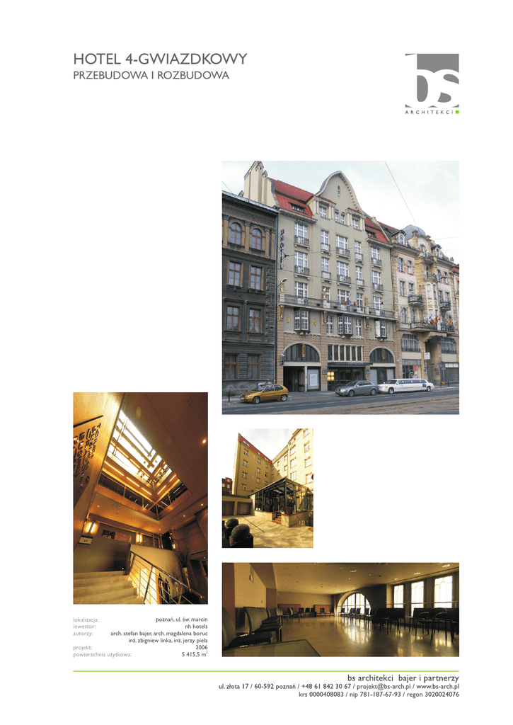 HOTEL 4-GWIAZDKOWY PRZEBUDOWA I ROZBUDOWA poznañ, ul. œw. marcin nh hotels arch. stefan bajer, arch. magdalena boruc in¿. zbigniew linka, in¿. jerzy piela 2006 projekt: powierzchnia u¿ytkowa: 5 415,5 m2 lokalizacja: inwestor: autorzy: